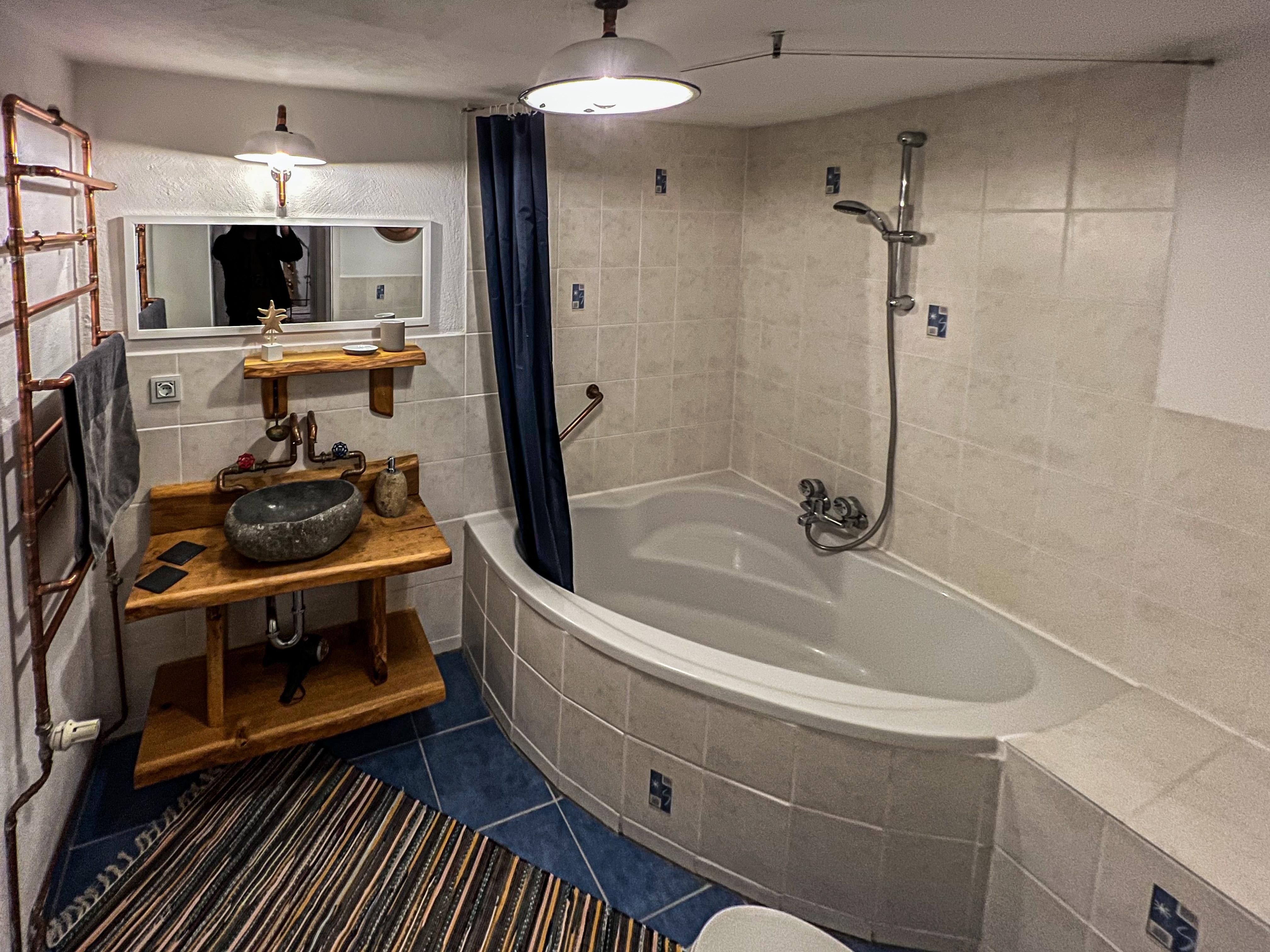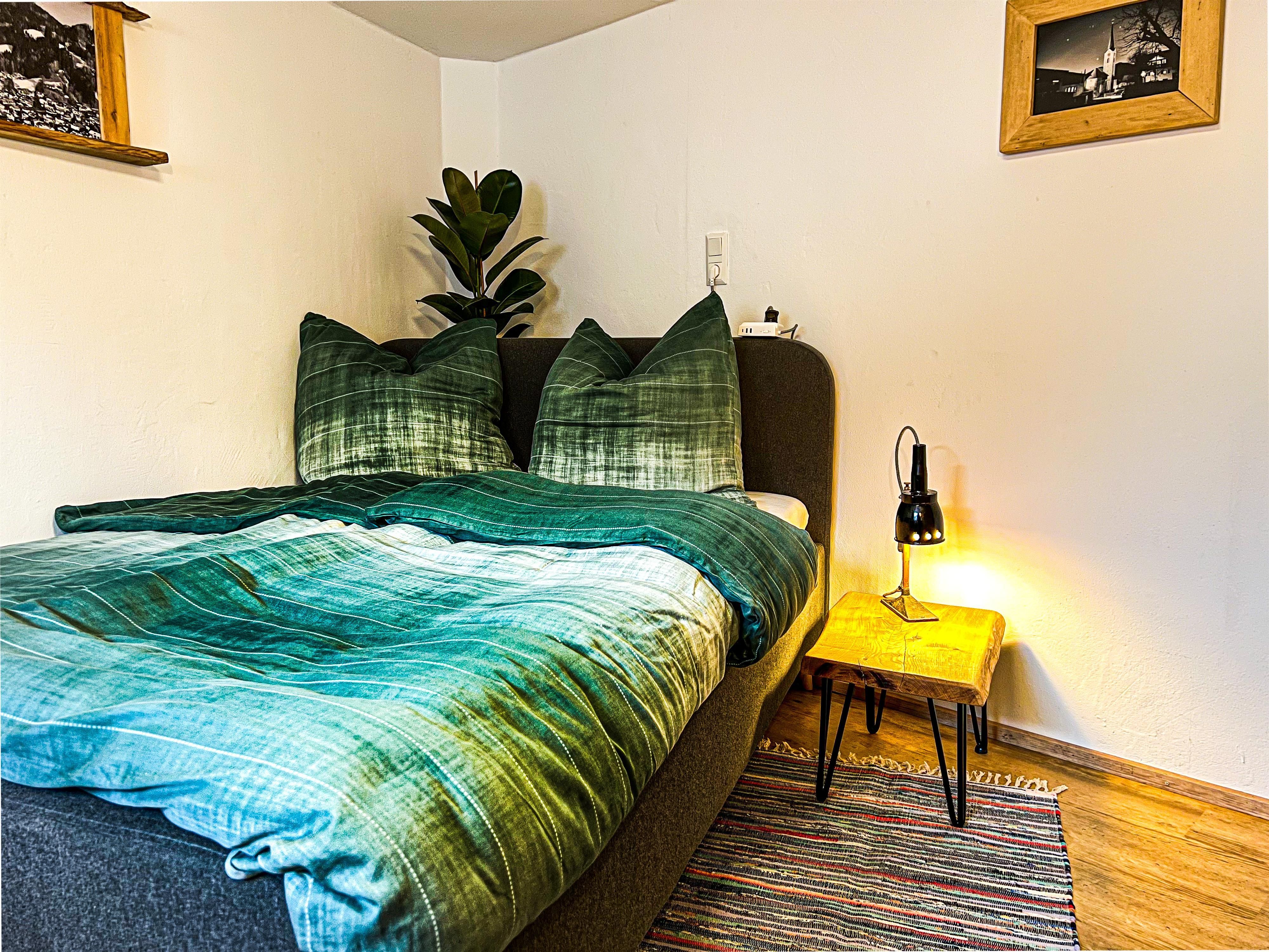 In der oberen Etage der ehemals alten Tenne ist ein separates heimeliges Schlafzimmer integriert, ausgestattet mit einem französischem Bett für zwei weitere Schlafplätze.