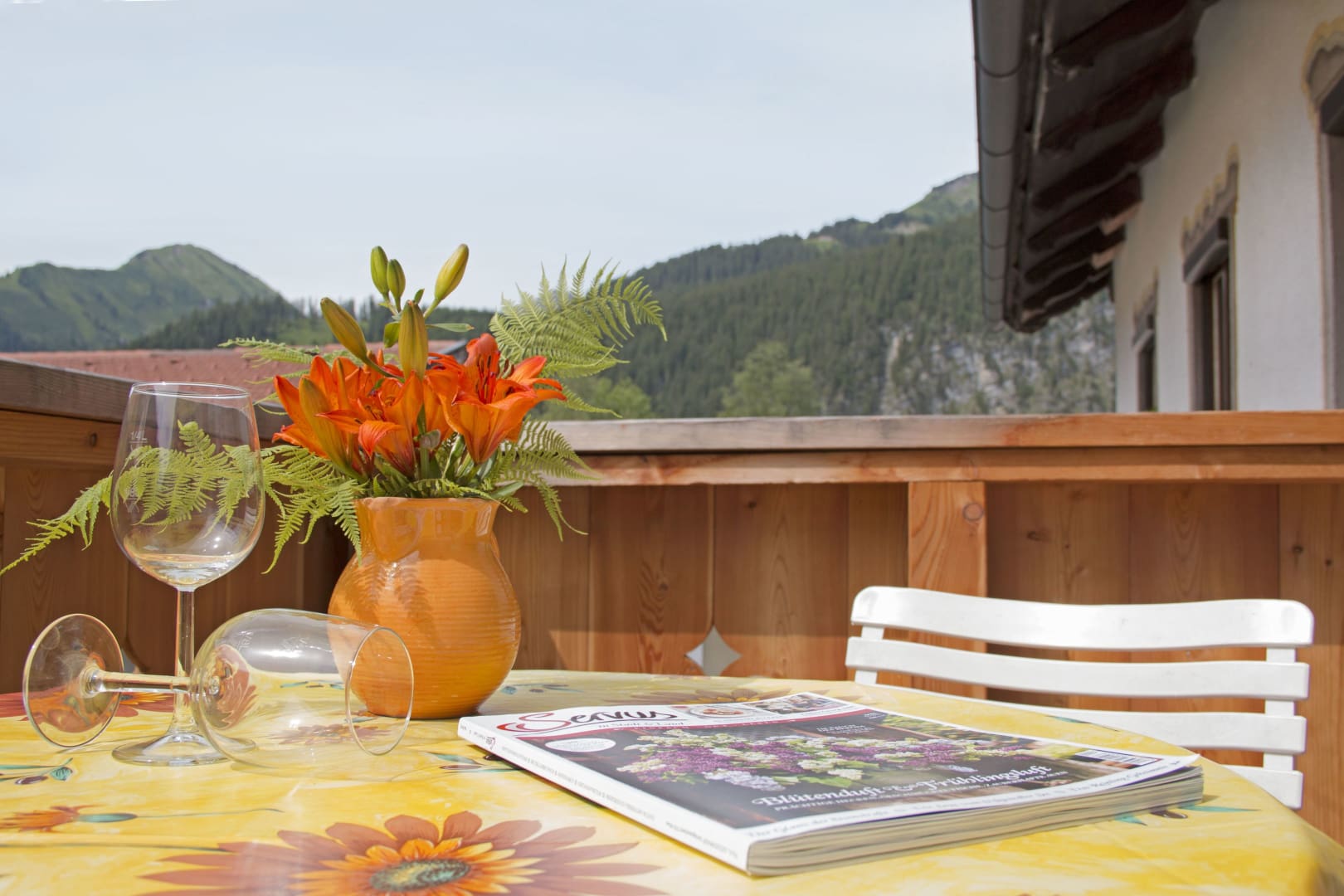 Herrlich dieser Ausblick auf die Tannheimer Berge und das Lechtal. Das Zimmer für Zwei mit Vollholzmöbeln und in entspannender Atmosphäre. Der Balkon und die Abendsonne - einfach gnießen und die Natur spüren.