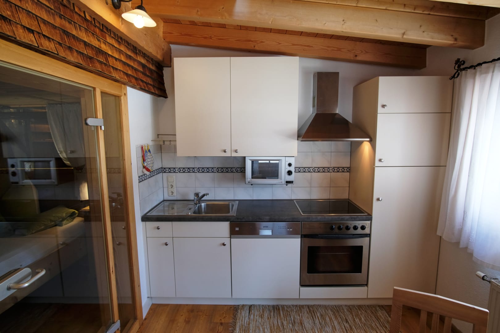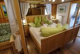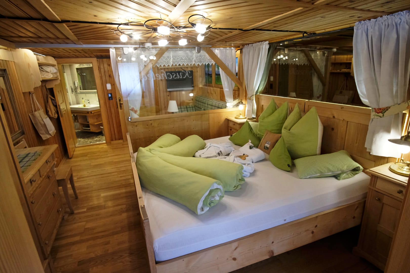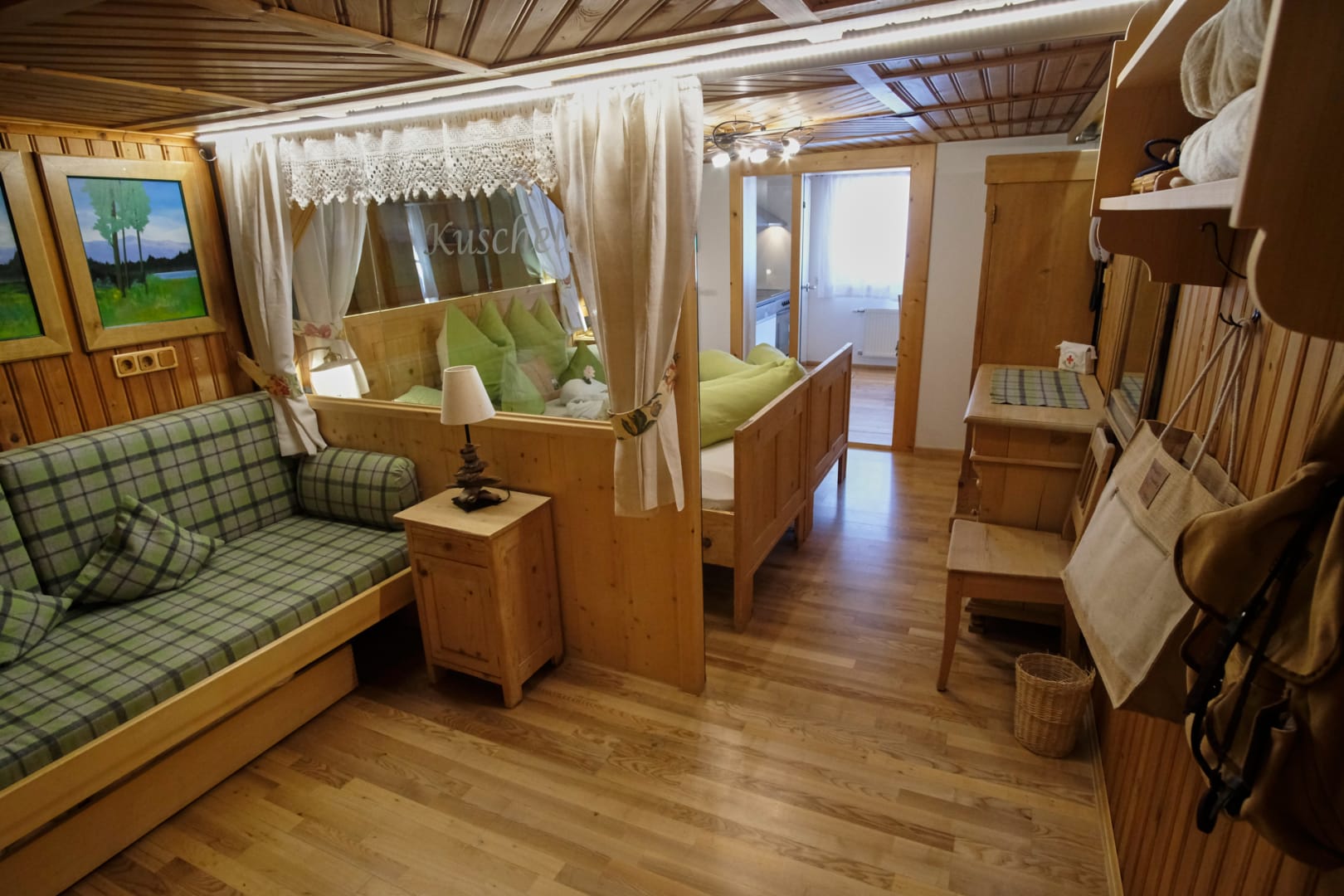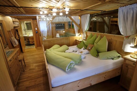 Rustic/modern in romantic style with four-poster bed ... this solid wood furniture comes from the local fir tree. Parents' bedroom and children's room are separated by a sliding glass door and wooden wall. In the adjoining loggia/conservatory is the fully equipped kitchen.
