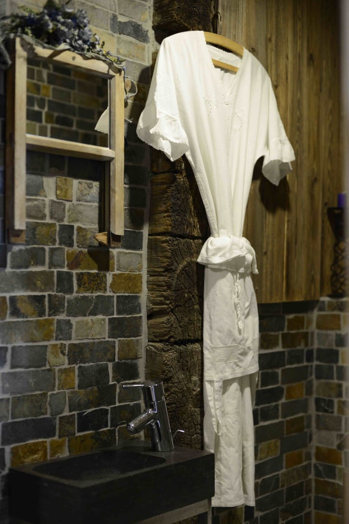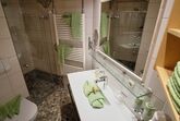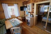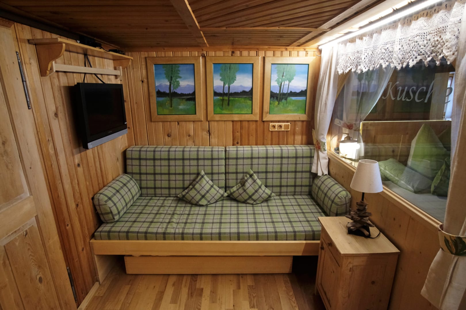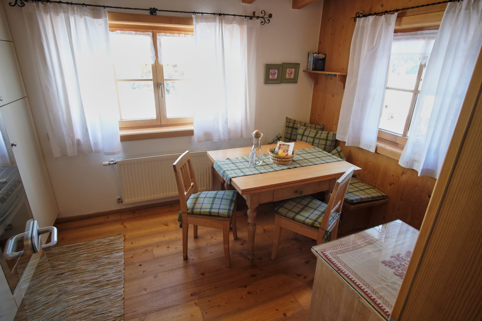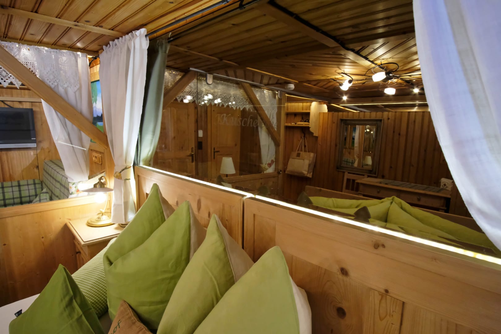 Rustic/modern in romantic style with four-poster bed ... this solid wood furniture comes from the local fir tree. Parents' bedroom and children's room are separated by a sliding glass door and wooden wall. In the adjoining loggia/conservatory is the fully equipped kitchen.