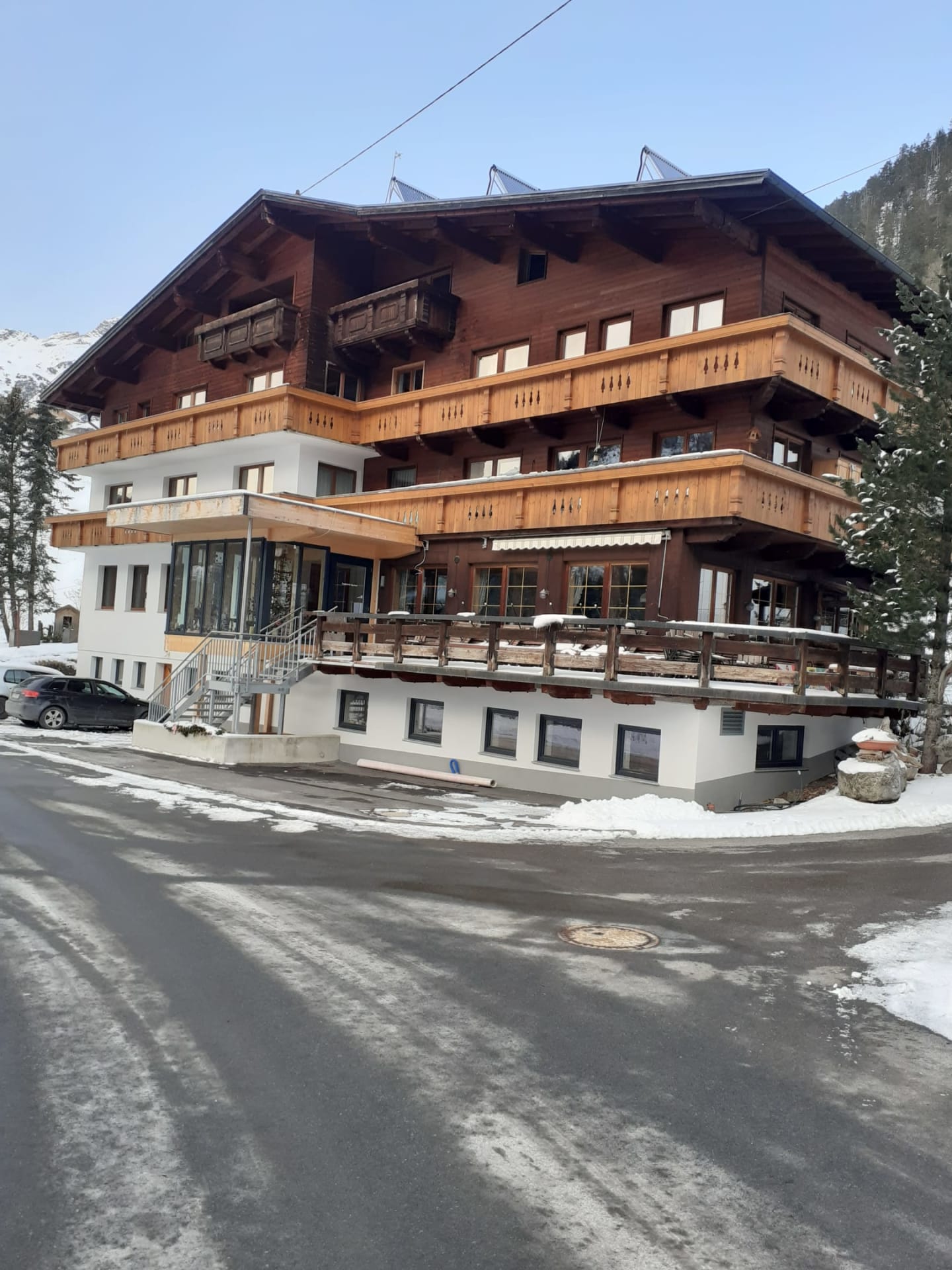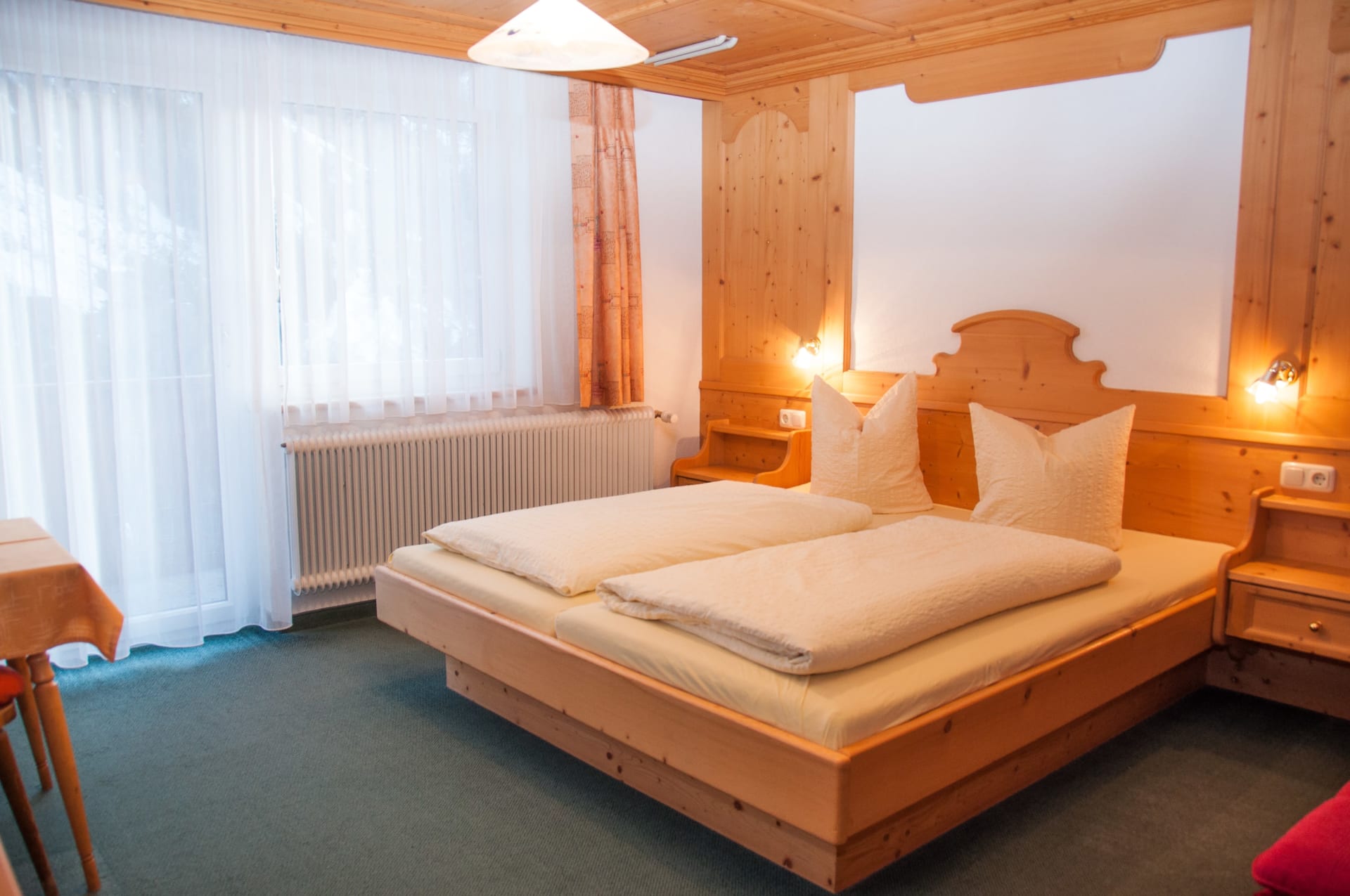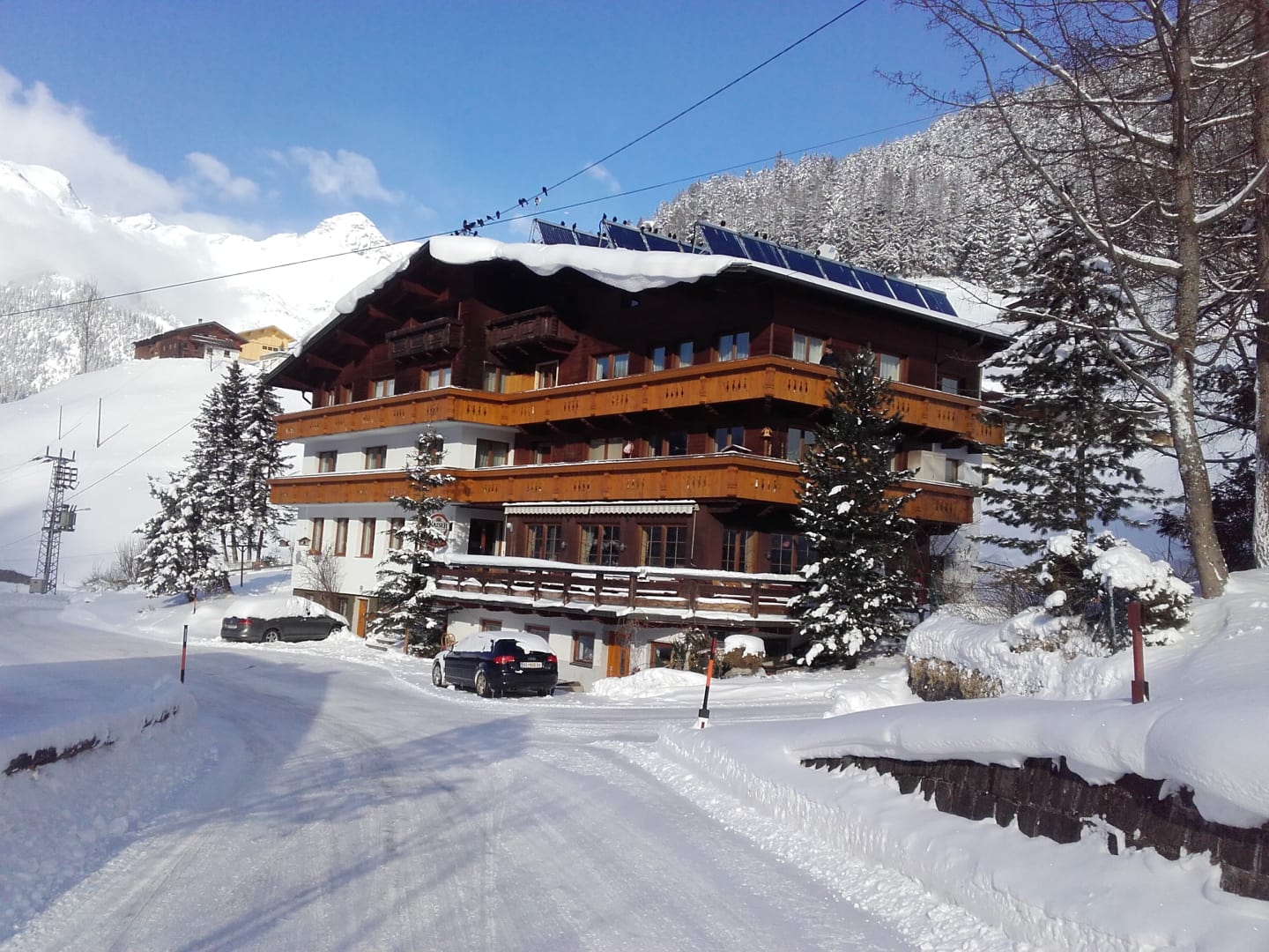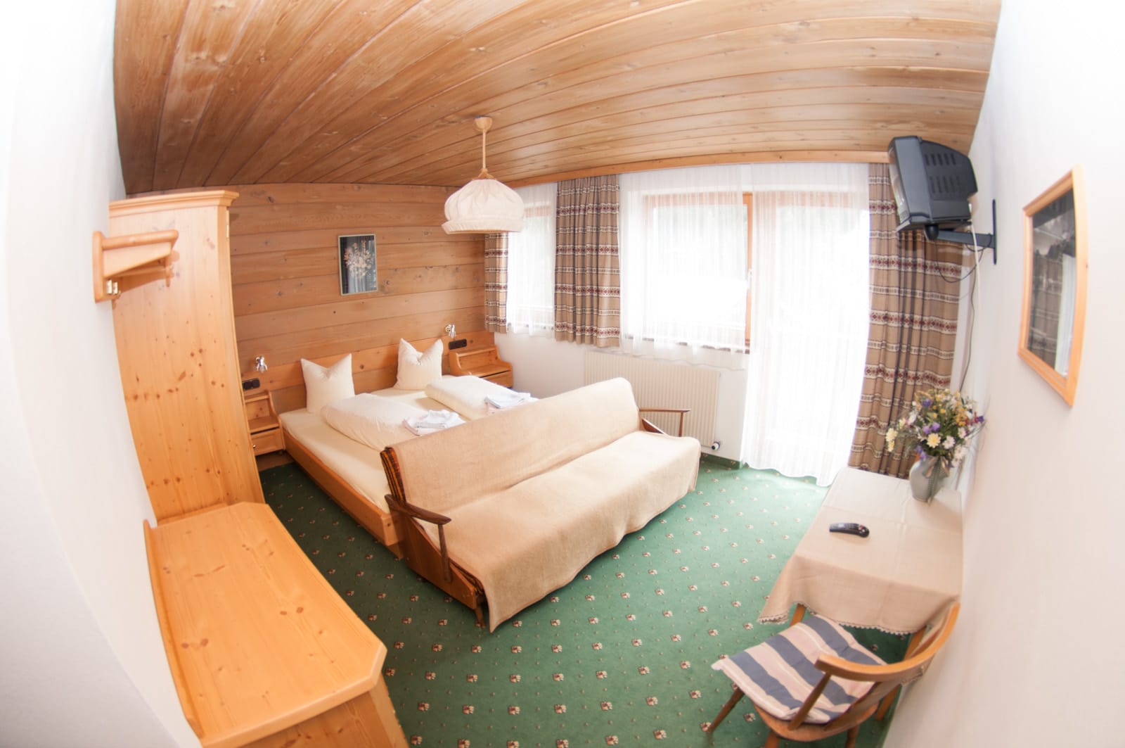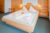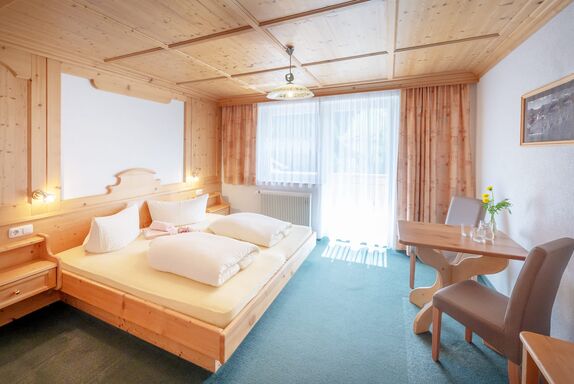 Schlicht-gemütlich - mit viel Fichtenholz - eingerichtete Zimmer, WLAN, Sat-TV, großteils mit Balkon; spannende Aussicht auf Berge, Steilhänge und zum klaren Sternenhimmel