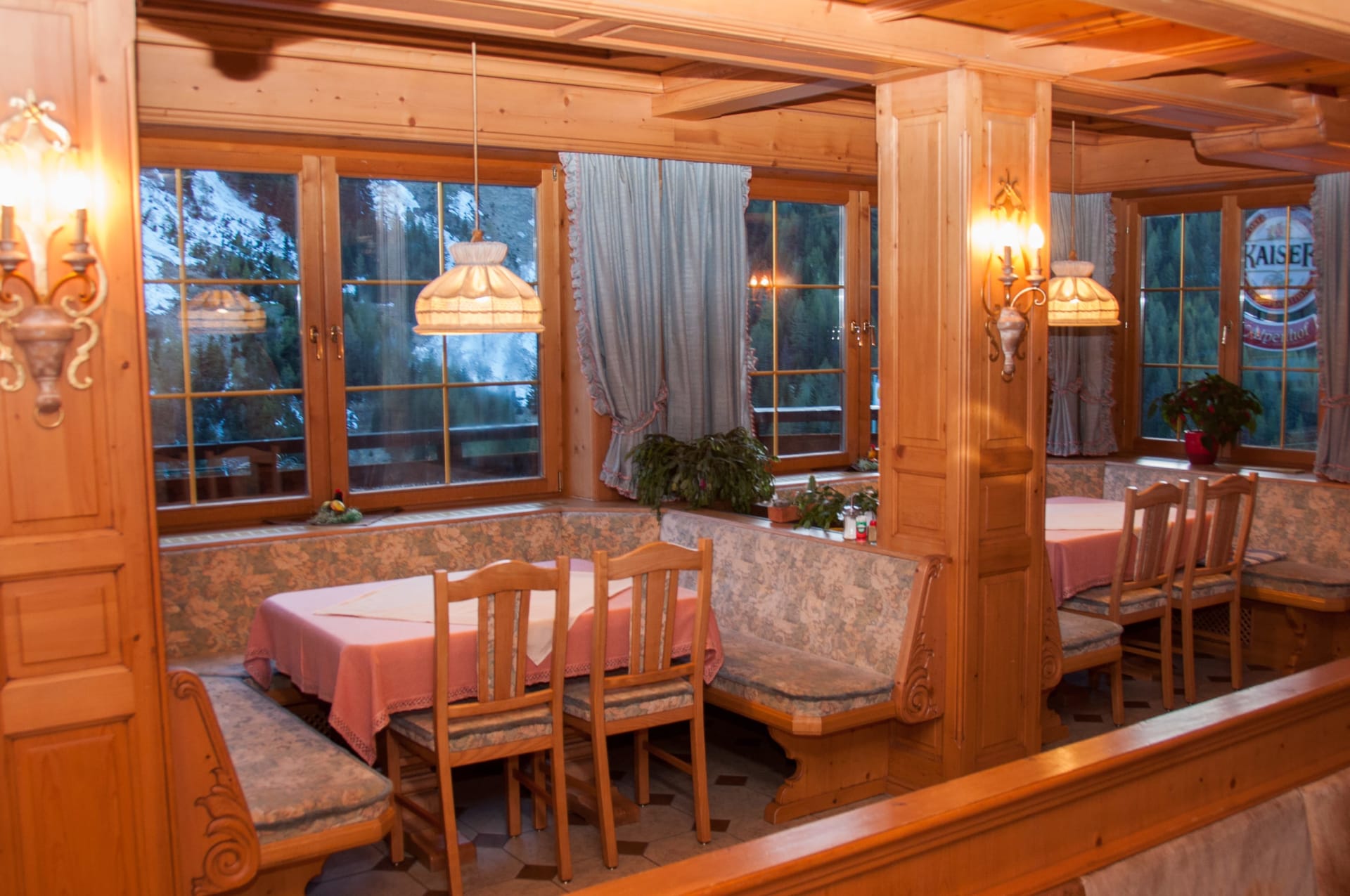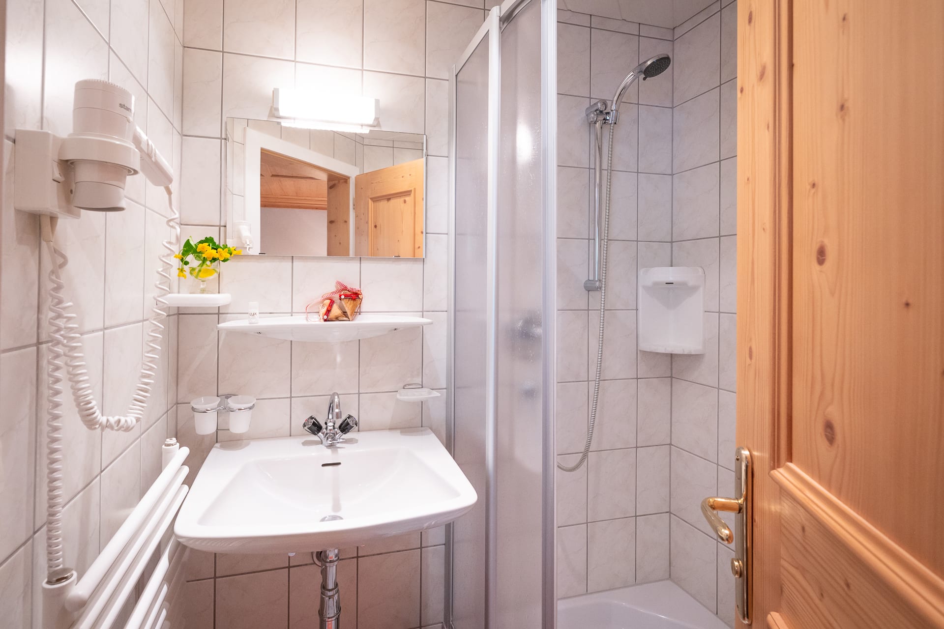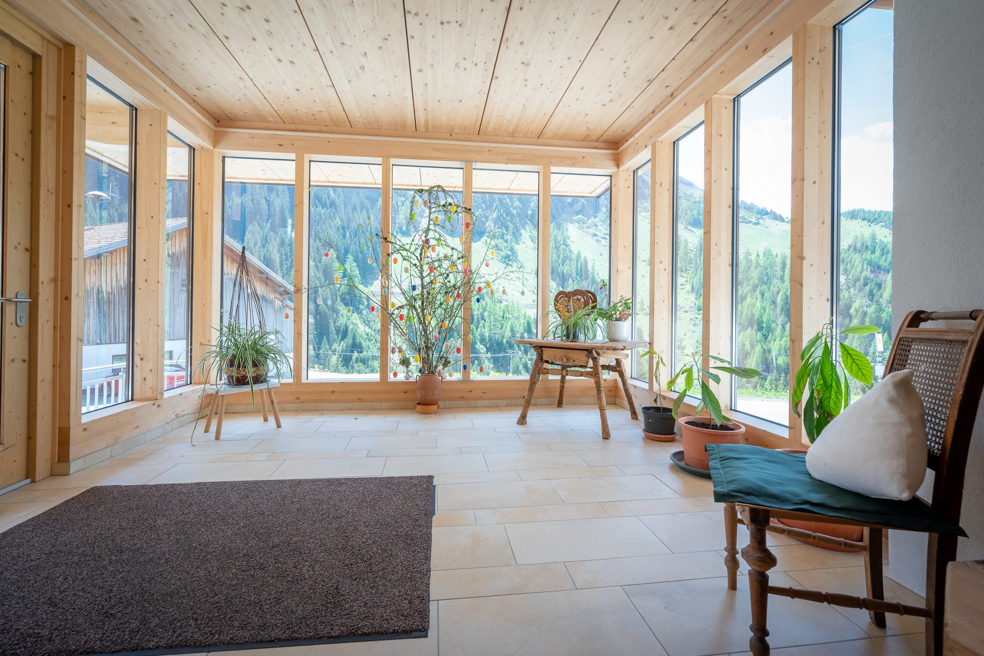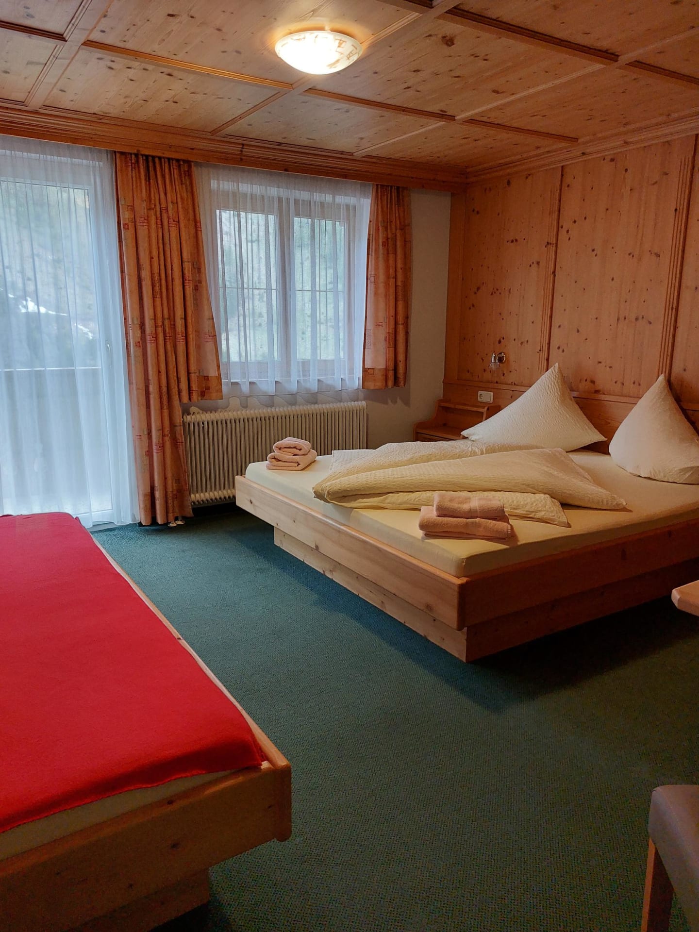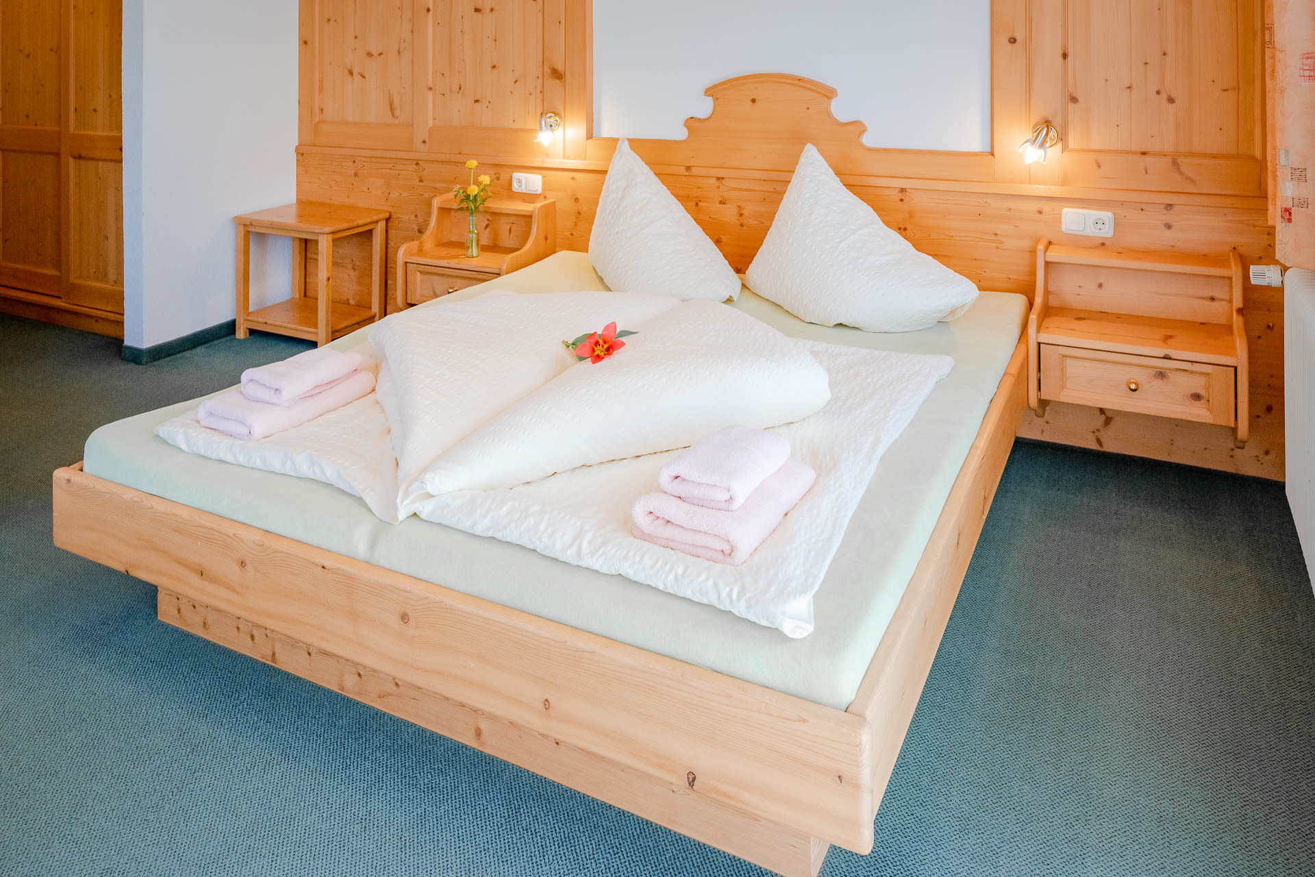 Schlicht-gemütlich - mit viel Fichtenholz - eingerichtete Zimmer, WLAN, Sat-TV, großteils mit Balkon; spannende Aussicht auf Berge, Steilhänge und zum klaren Sternenhimmel