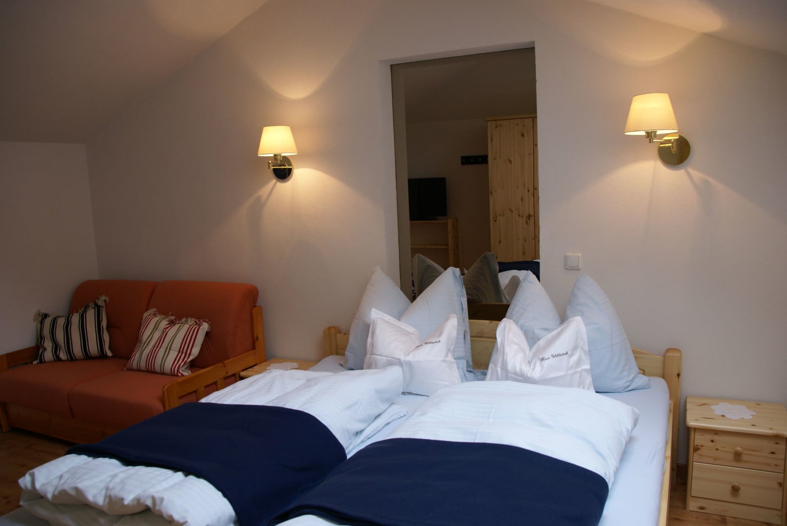 Unsere kleinste Wohnung ist ein Eckzimmer, in dem Sie die Sonne den ganzen Tag begleitet. Den Sonnenaufgang können Sie vom Bett aus, durch das Ostfenster beobachten, ab Mittag genießen Sie die Sonnenstrahlen auf dem Südbalkon.