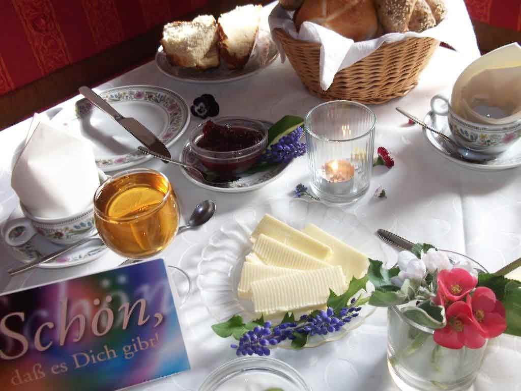 Zum Abendessen oder Frühstücksbuffet lädt der Gasthof unseres Dorfes in nur 2 Gehminuten ein.