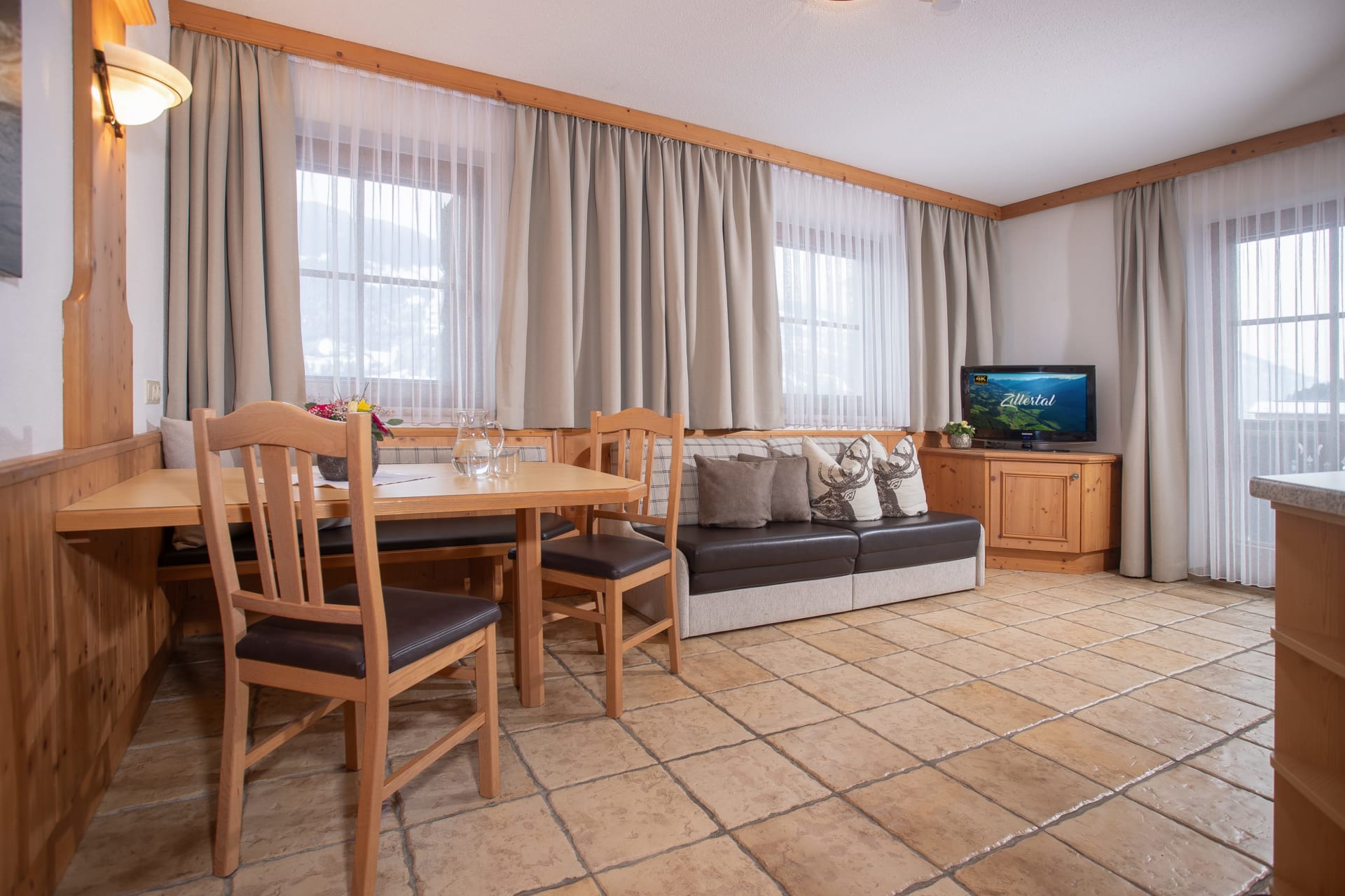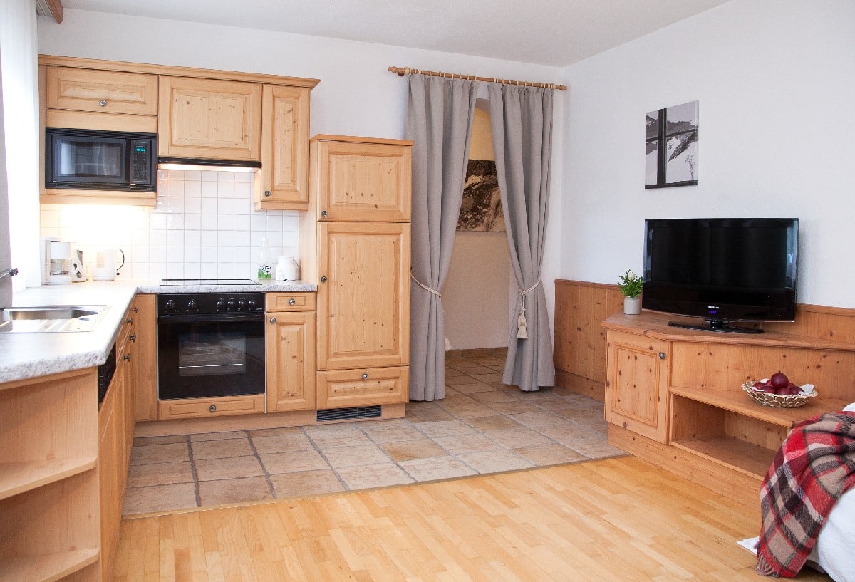 Zeitgerechte komfortable mit Vollholz ausgestattete Wohnung, 1 Doppelbettschlafzimmer mit 1 vollwertigem Einzelbett, seperates WC, zwei große Balkone, geräumiges Badezimmer mit ebenerdiger Glasdusche und Fenster, Föhn, Erste Hilfe Koffer, großer Spiegel, Bodenheizung in der gesamten Wohnung, sehr geräumig, hell und freundlich. Verfügt über Spülmaschine, Mikrowelle, Backrohr, Ceranfeld, Kühlschrank mit Gefrierfach, Filterkaffeemaschine, Wasserkocher, Toaster. Ebenso gibt es einen Radio und SAT TV.