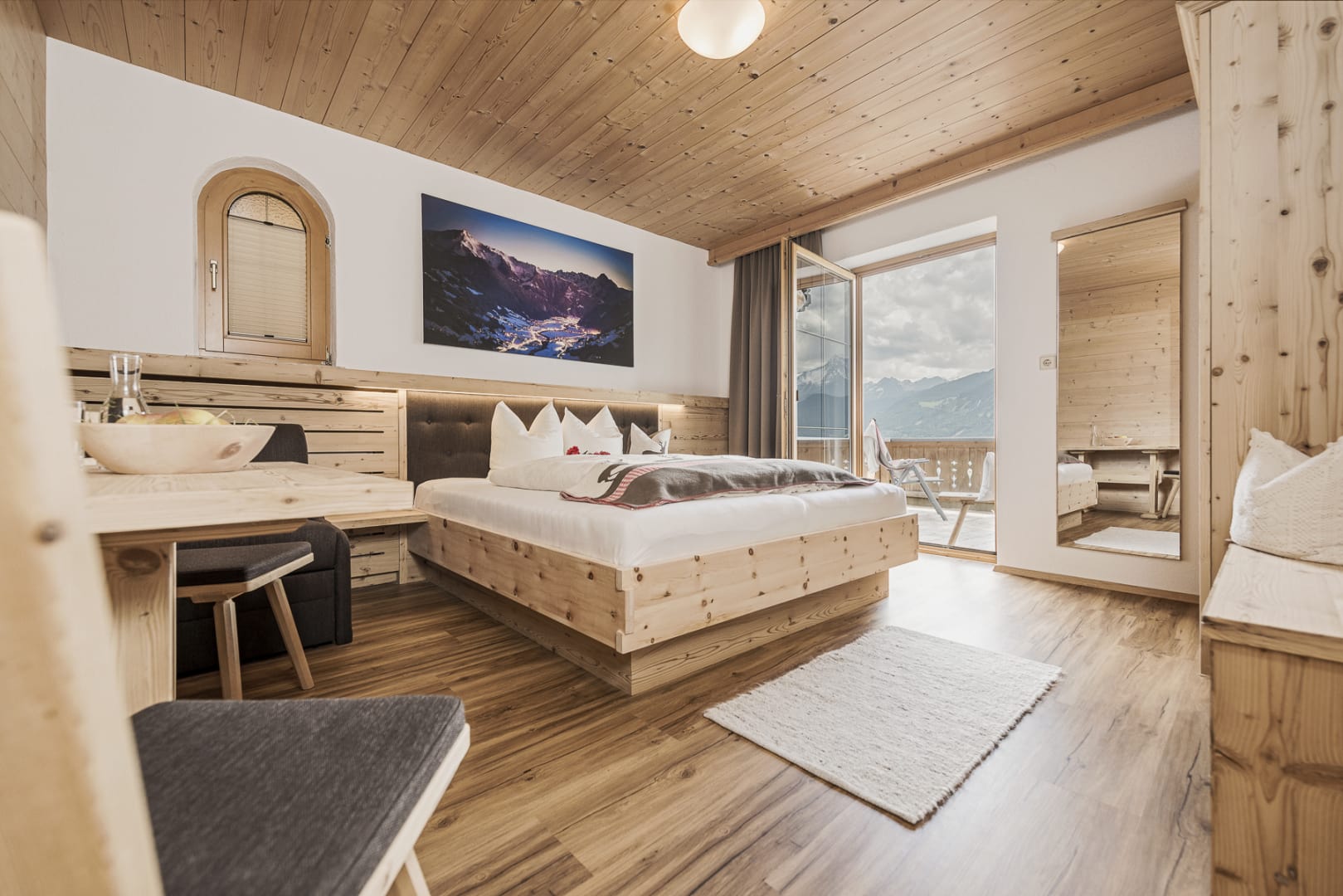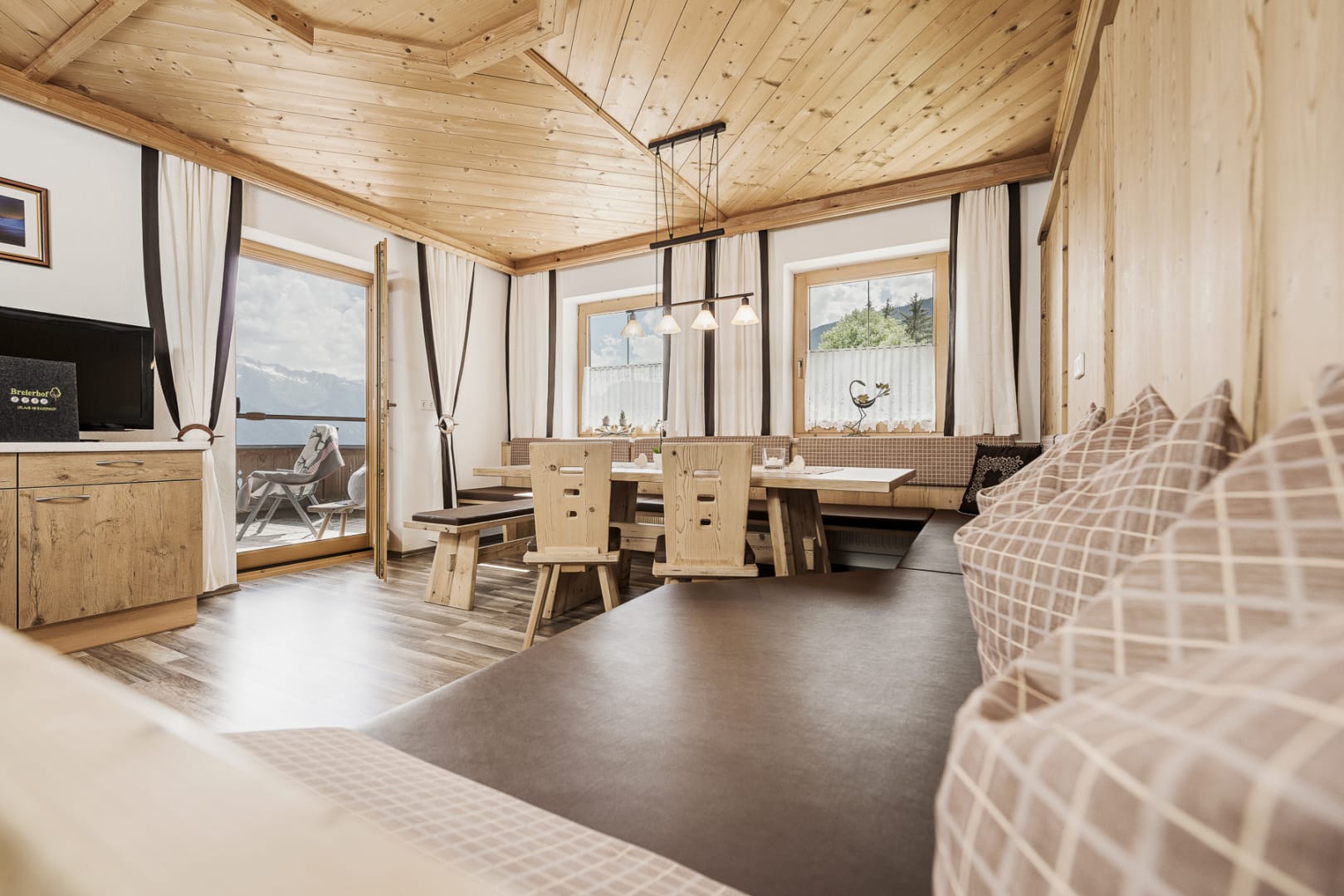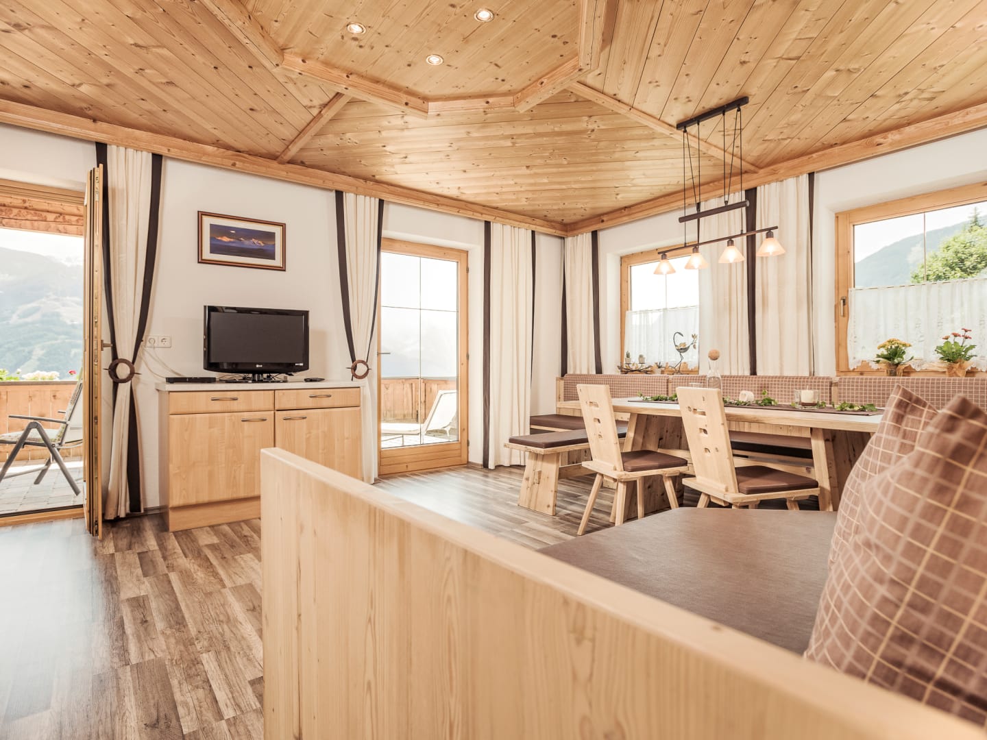 Apartement Ahornspitz. Dieses Apartement mit ca. 85 m² besteht zu einem Großteil aus Zirbenholz und Altholz einfach zum Wohlfühlen,und ist ausgestattet mit zwei getrennten Schlafzimmern, einem Doppelzimmer, einem Dreibettzimmer, Dusche und Waschtisch, WC extra, Fernseher mit SAT, Radio, Küche mit Geschirrspüler, Backofen, Wasserkocher, Kaffeemaschine, Mikrowelle,schöne Sonnenterasse mit Gartenmöbeln und Blick ins Zillertal.