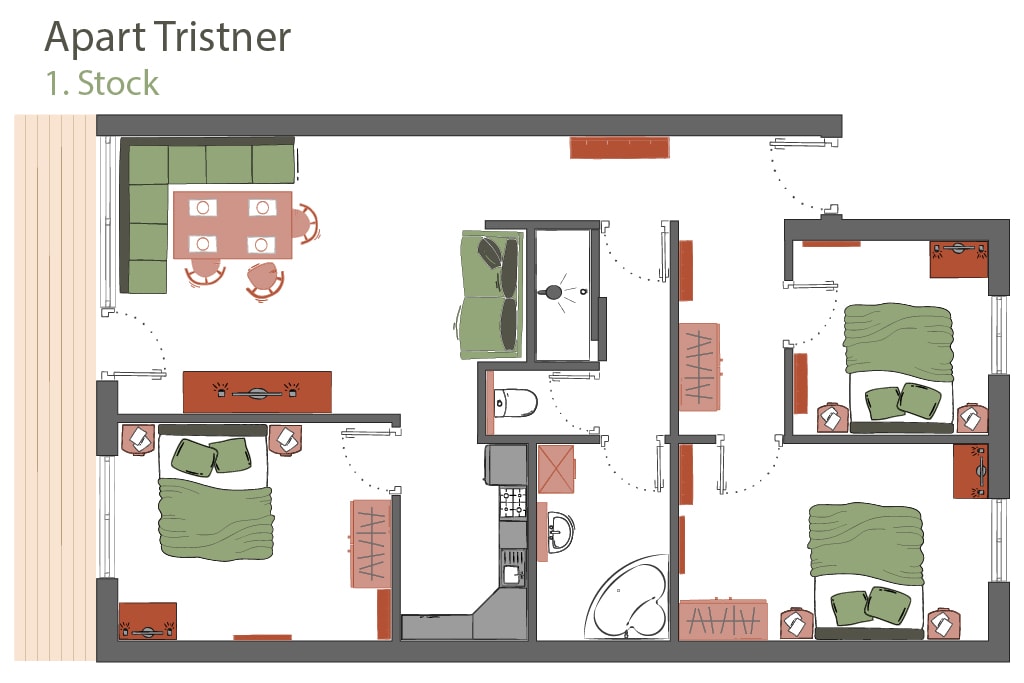 In unseren Apartments und Suiten genießen Sie modernsten Komfort und werden sich gleichzeitig durch den traditionellen Stil von Architektur und Interieur in einer wohligen Atmosphäre wiederfinden. Weiters besitzt jede unserer Wohnungen entweder einen 8 m langen Balkon oder eine Terrasse mit Garten.