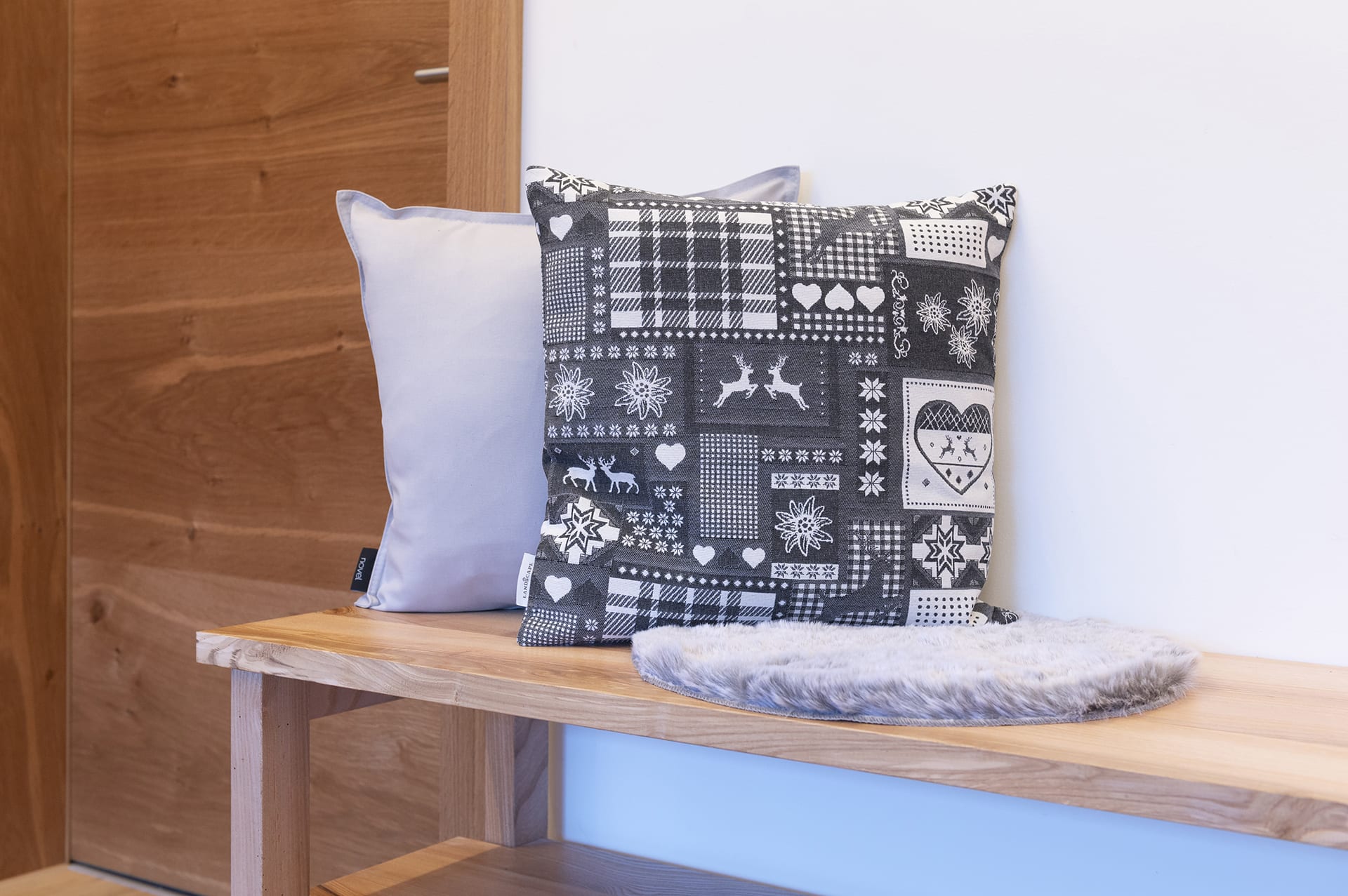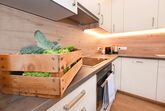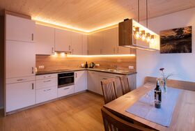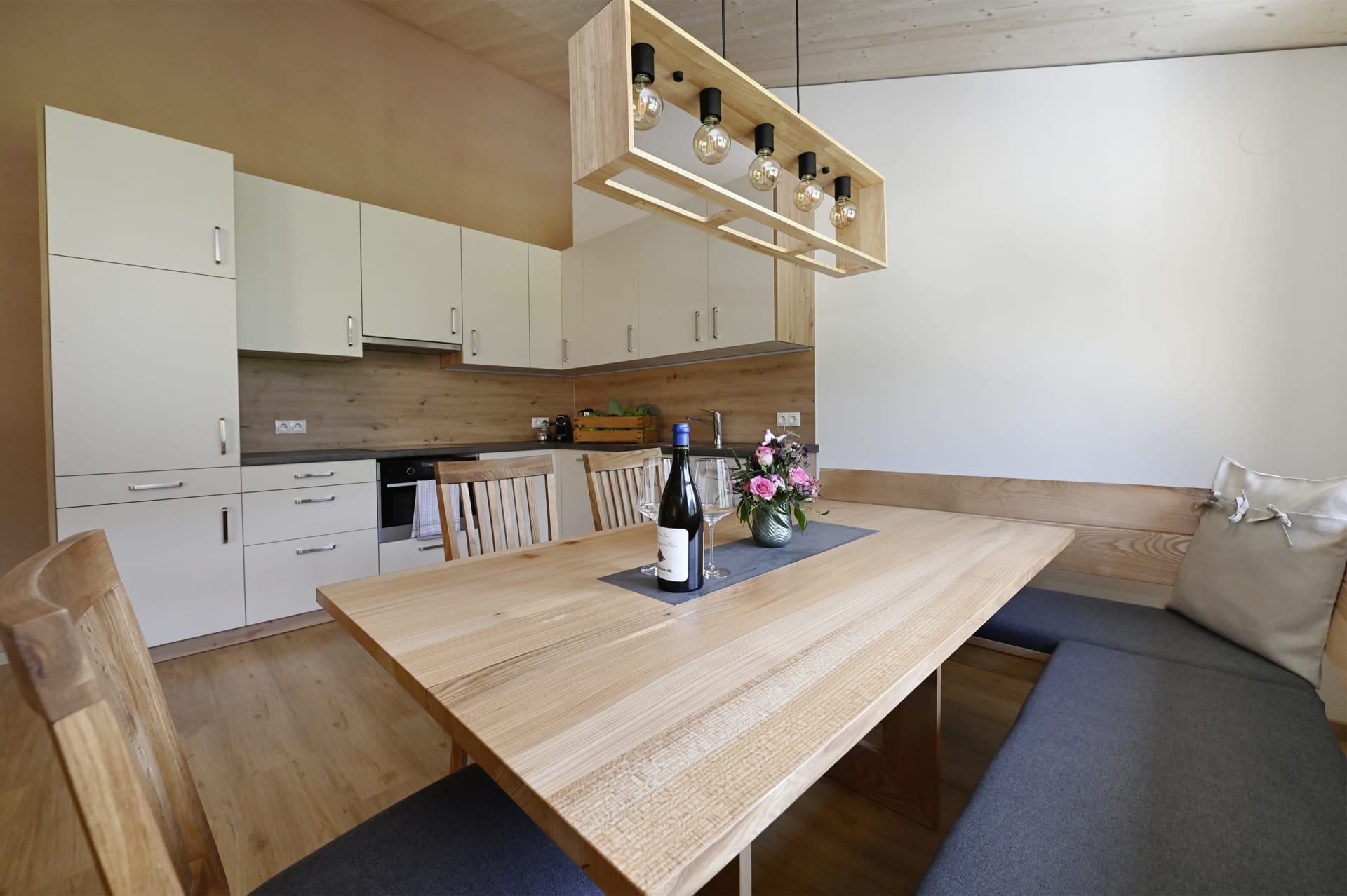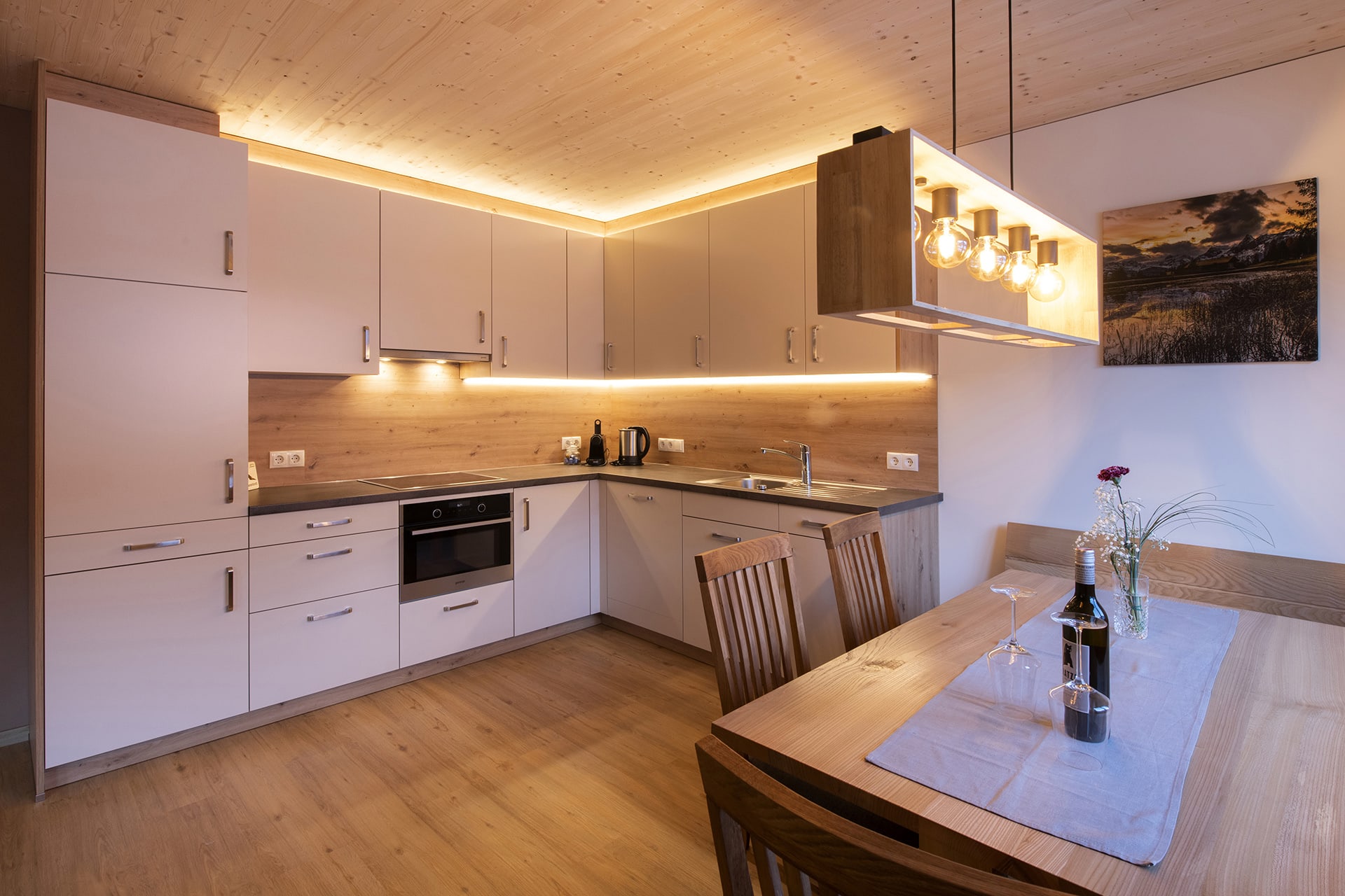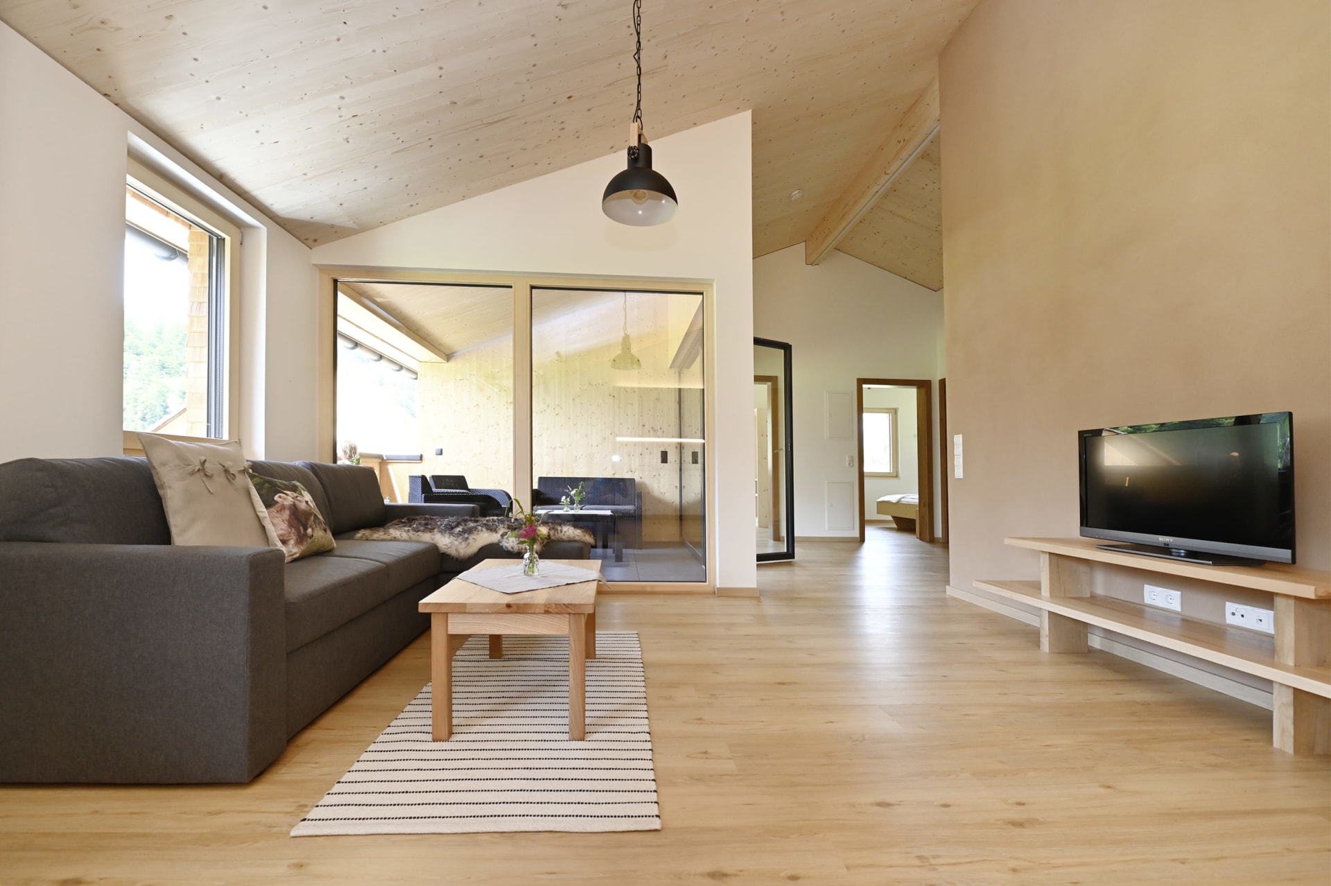 NEU! Mit heimischem Holz eingerichtete, moderne Wohnung mit Wohnküche inkl. gemütlicher Sitzecke mit Ausziehcouch. Panoramablick und direktem Zugang zur Loggia. 2 separate Schlafzimmern, Badezimmer mit Dusche und separatem WC.