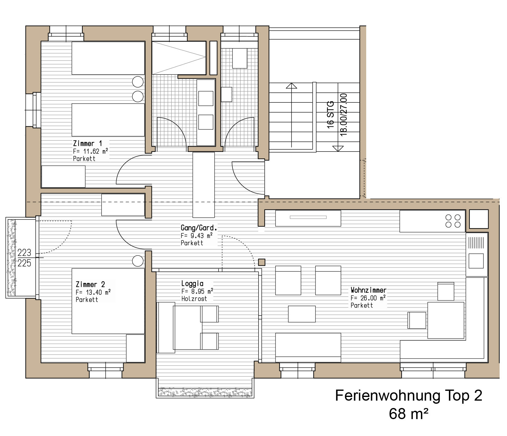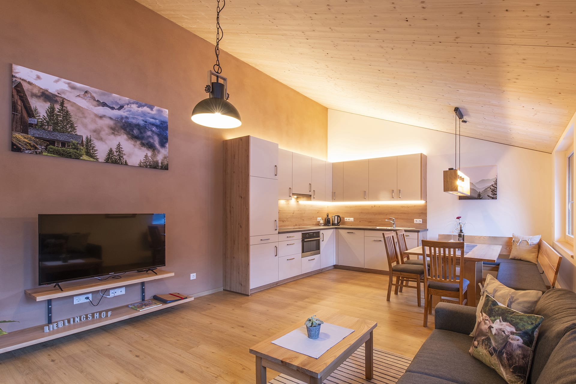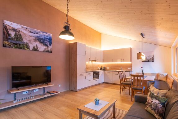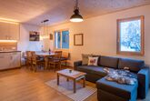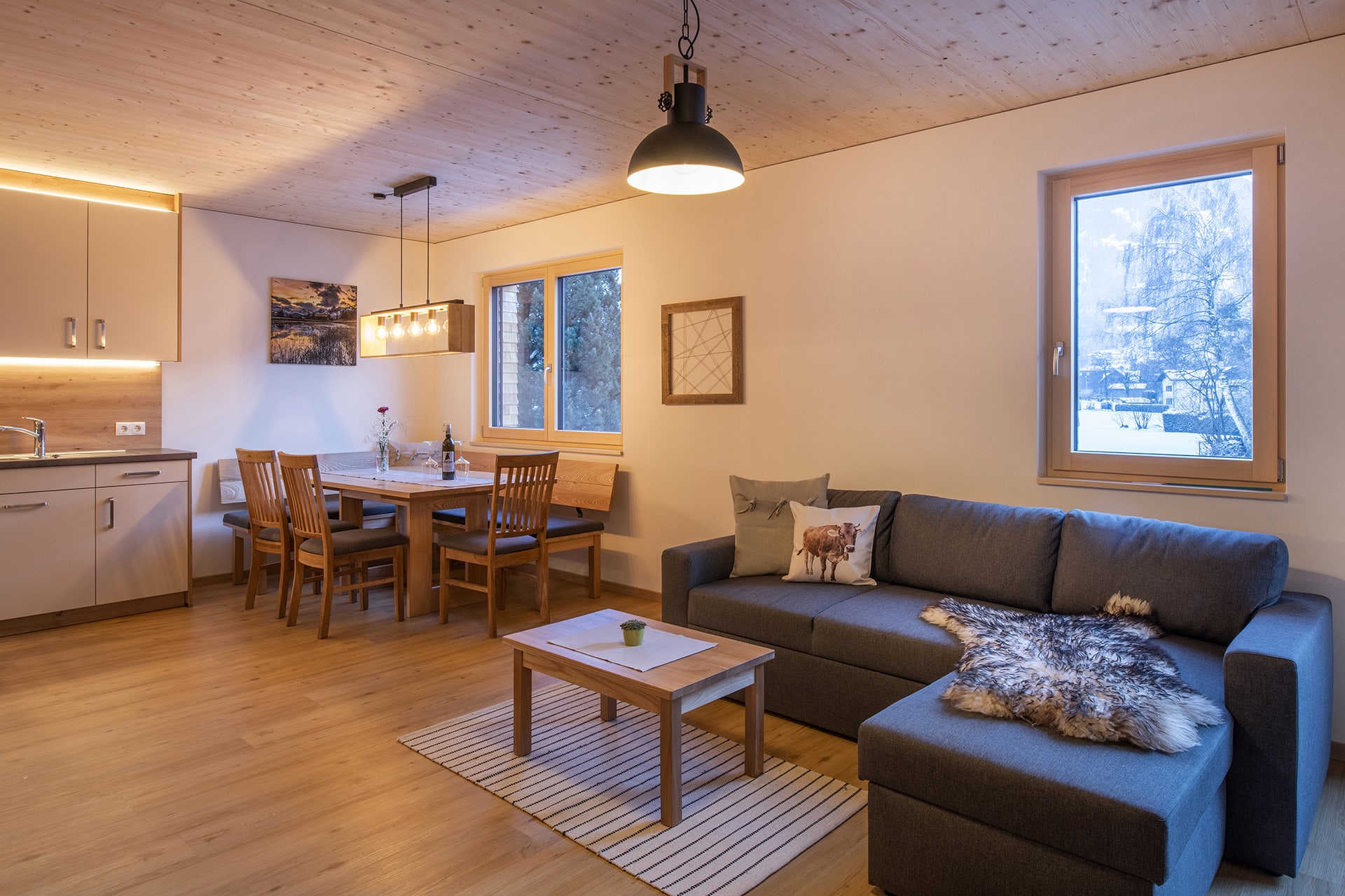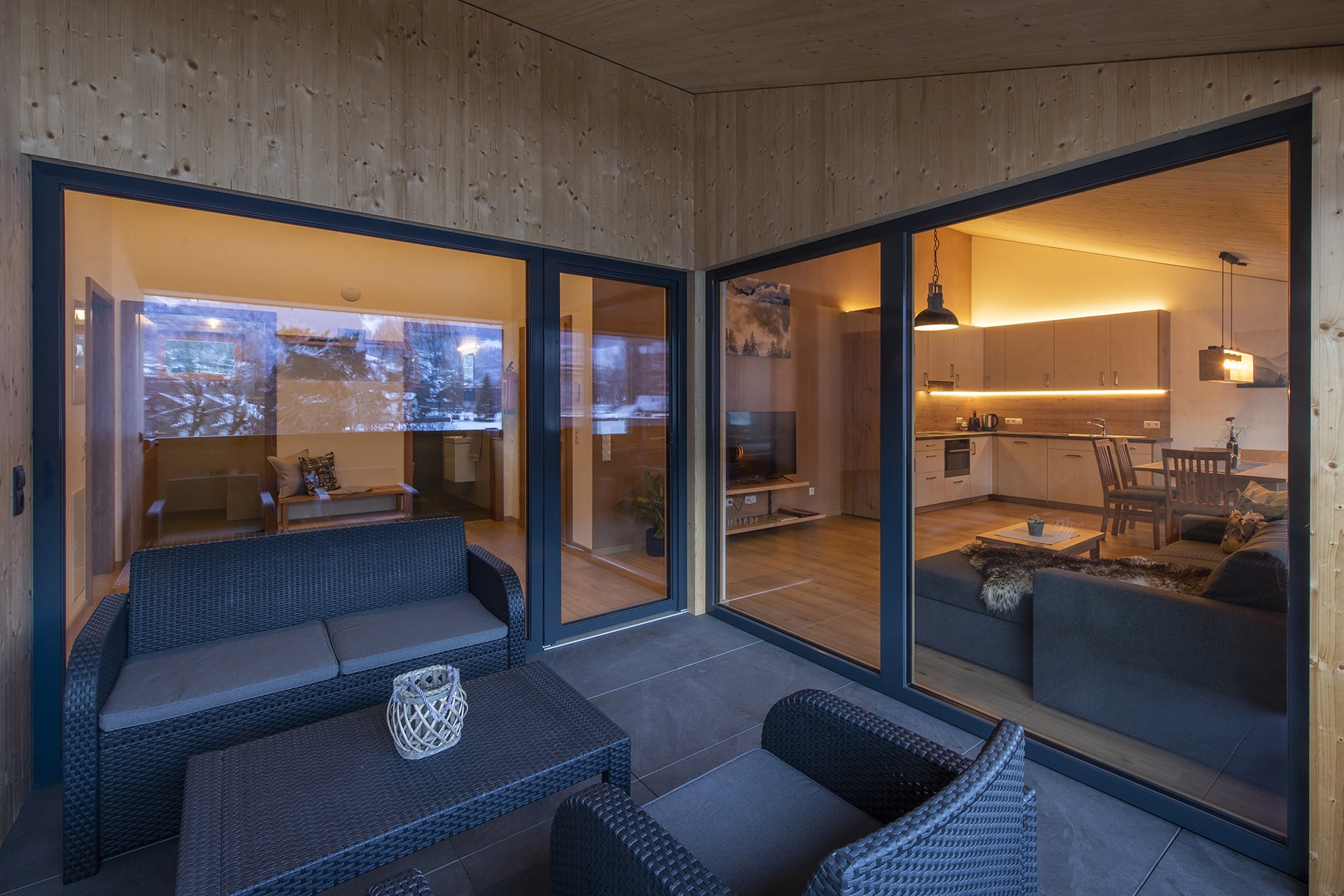 NEU! Mit heimischem Holz eingerichtete, moderne Wohnung mit Wohnküche inkl. gemütlicher Sitzecke mit Ausziehcouch. Panoramablick und direktem Zugang zur Loggia. 2 separate Schlafzimmern, Badezimmer mit Dusche und separatem WC.