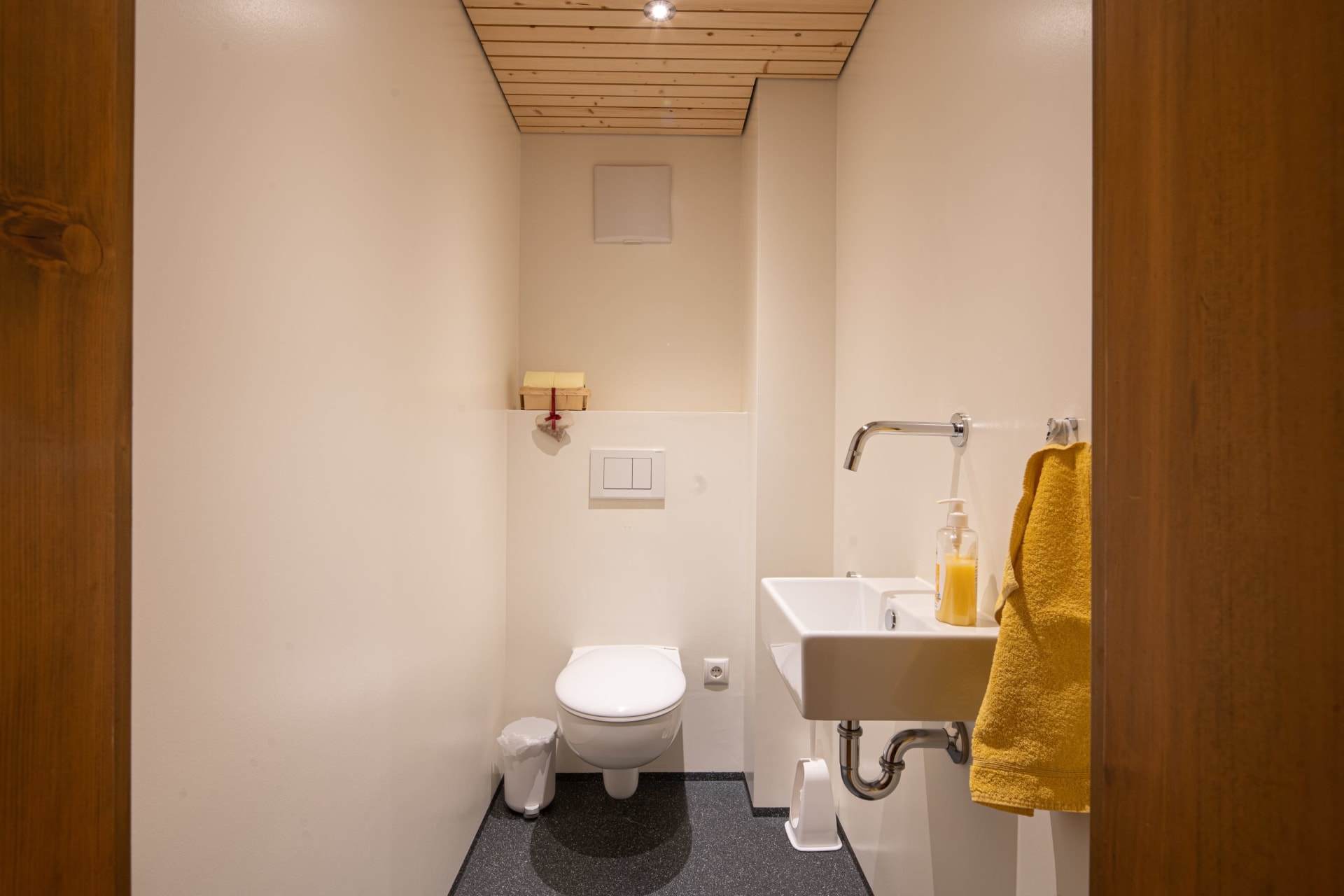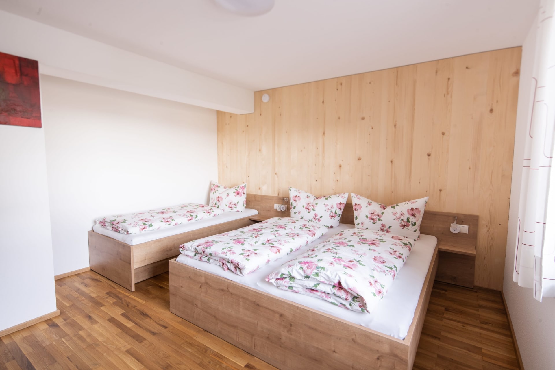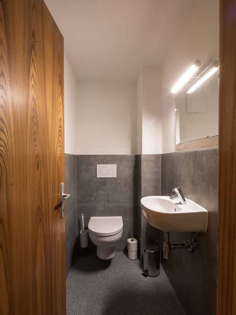 Sie wohnen auf 130 Quadratmetern im 1. Stock. Es erwartet Sie eine voll ausgestattete Küche mit Essbereich und ein durch eine Schiebetüre verbundenes Wohnzimmer. Die drei Doppelzimmern verfügen über je ein Waschbecken für die tägliche Morgenroutine. Ein modernes Badezimmer mit Regenfalldusche und ein zweites, separates WC stehen Ihnen zudem direkt in Ihrem großzügigen Apartment zur Verfügung. Ebenso wie ein Vorrats- und Abstellraum. Zugang zum Balkon ist von den südseitig gelegenen Zimmern aus.