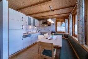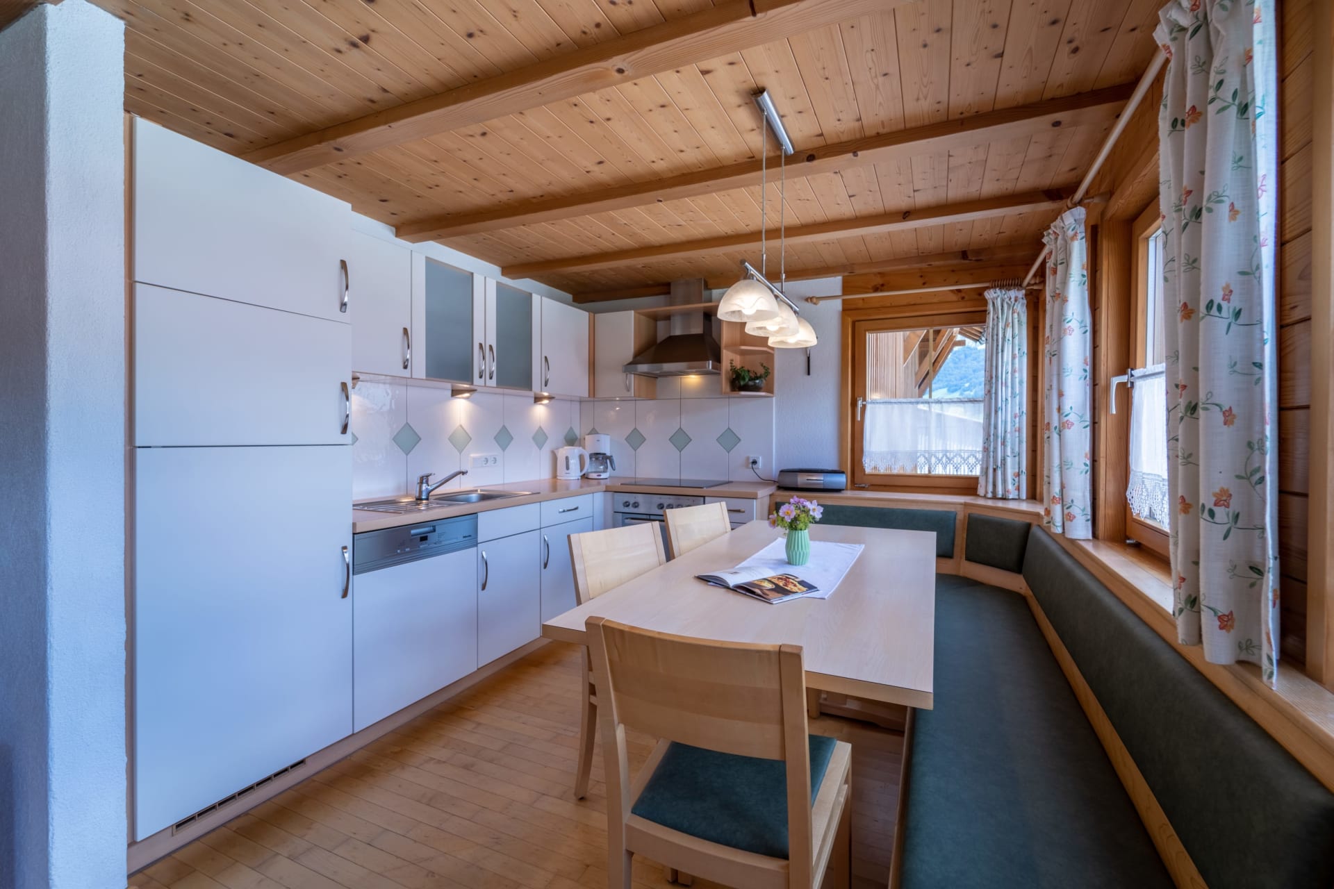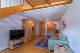 Der Wohnbereich im Erdgeschoß verfügt über eine komplett ausgestattete Küche (u.a. mit Geschirrspüler, Kühl-Gefrierschrank, Backofen, Kaffeemaschine, Wasserkocher), einem Essbereich sowie über SAT-TV und einem Sofa.