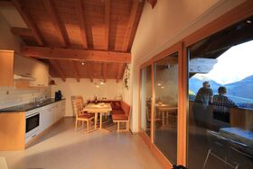 Gemütliche Dachwohnung mit offener Dachkonstruktion. 1 Doppelzimmer, 1 Kinderzimmer mit zwei Einzelbetten, Bad (DU/WC), 2 TV, Gang/Garderobe, Wohnküche und Balkon.