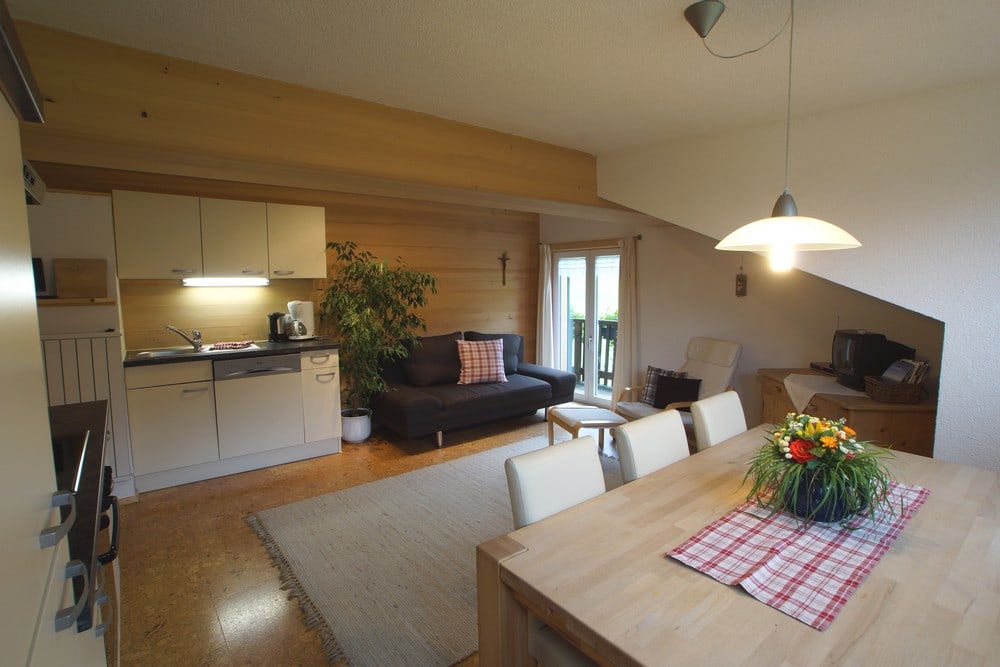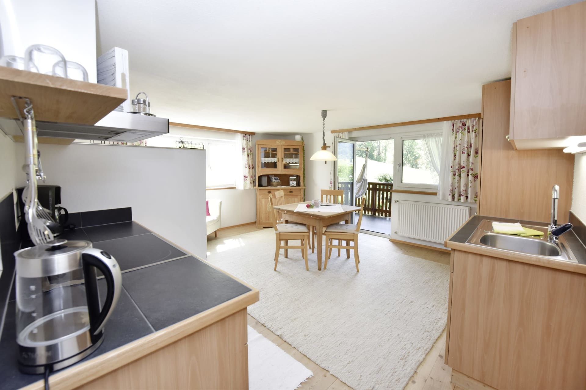 Diese zentralgeheizte 50m²-Wohnung verfügt über eine voll ausgestattete Wohnküche mit Spülmaschine und beheizbarem Kachelofen, einem Sofa, TV/Radio und einen Süd-Balkon. Ein Doppelbett-Schlafzimmer, ein Zimmer mit zwei getrennten Betten sowie Dusche/WC.