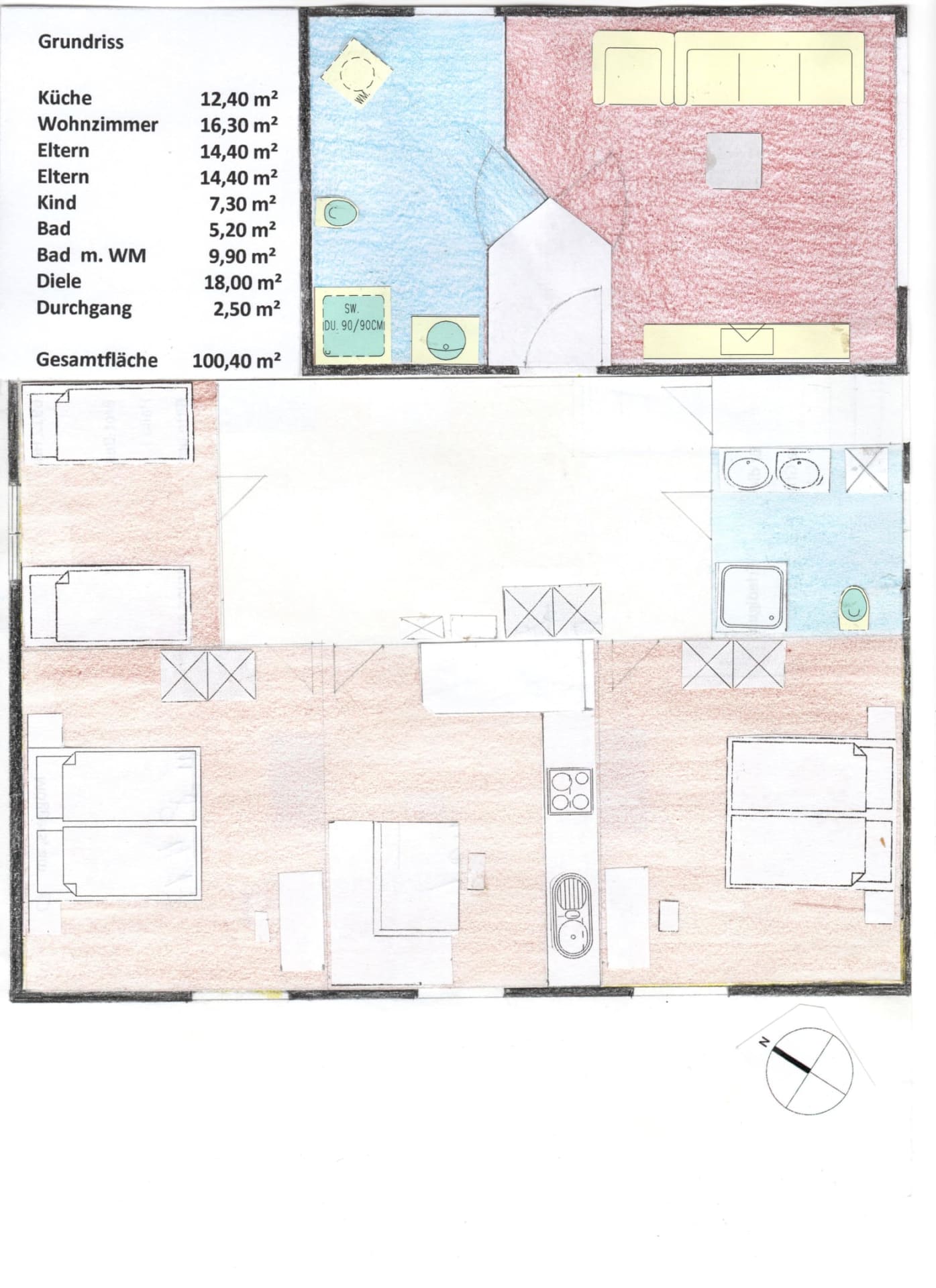 2 Doppelbettzimmern, 1 Schlafzimmer für Kinder mit 2 Einzelbetten, 1 Wohnzimmer mit Sat/TV, voll ausgestattete Wohnküche mit Sofa, 2 Badezimmer mit Dusche/WC und eine Waschmaschine, große Diele.