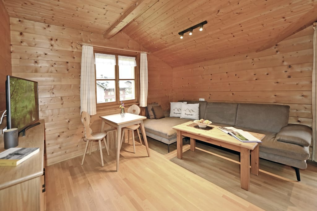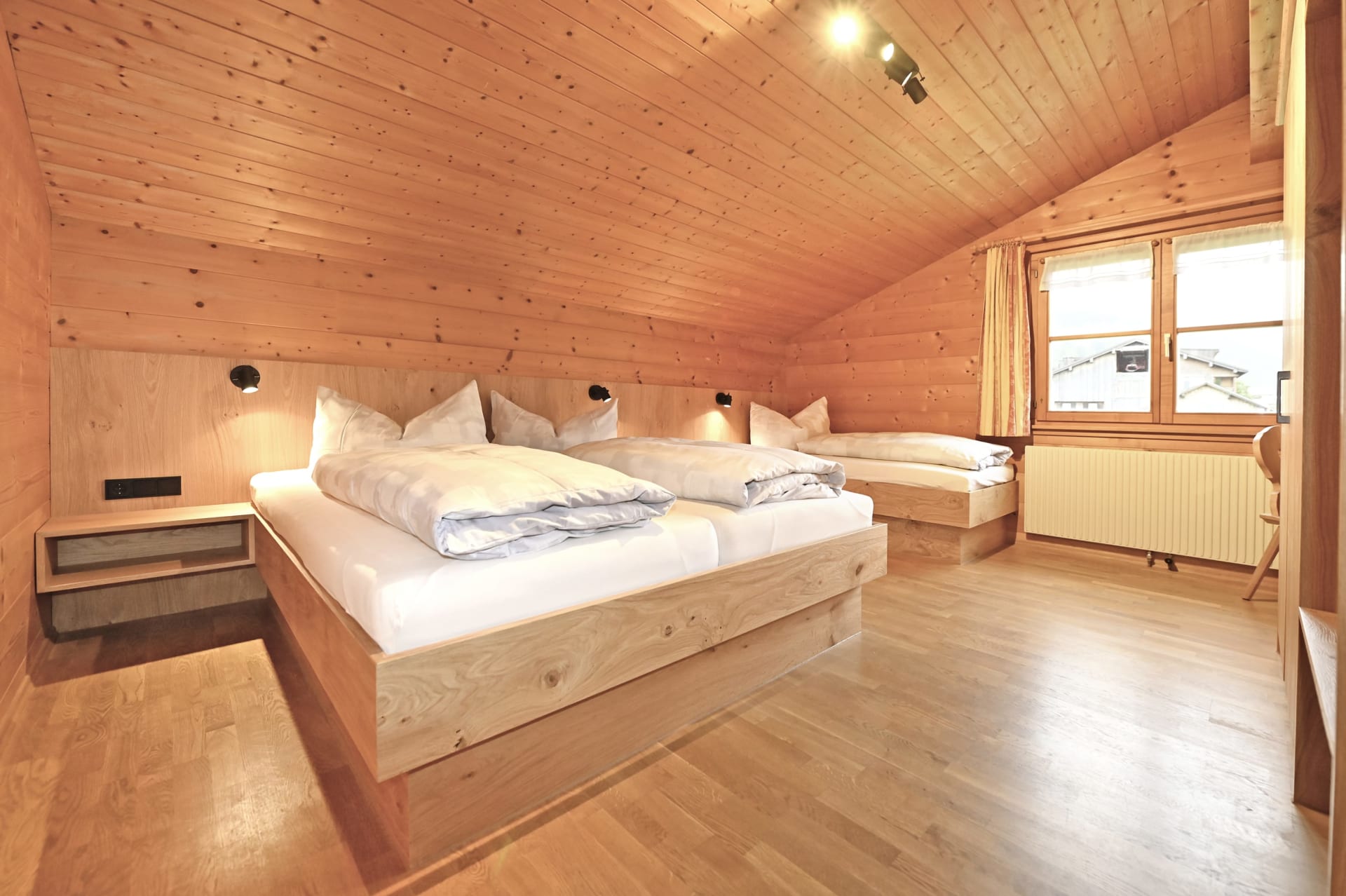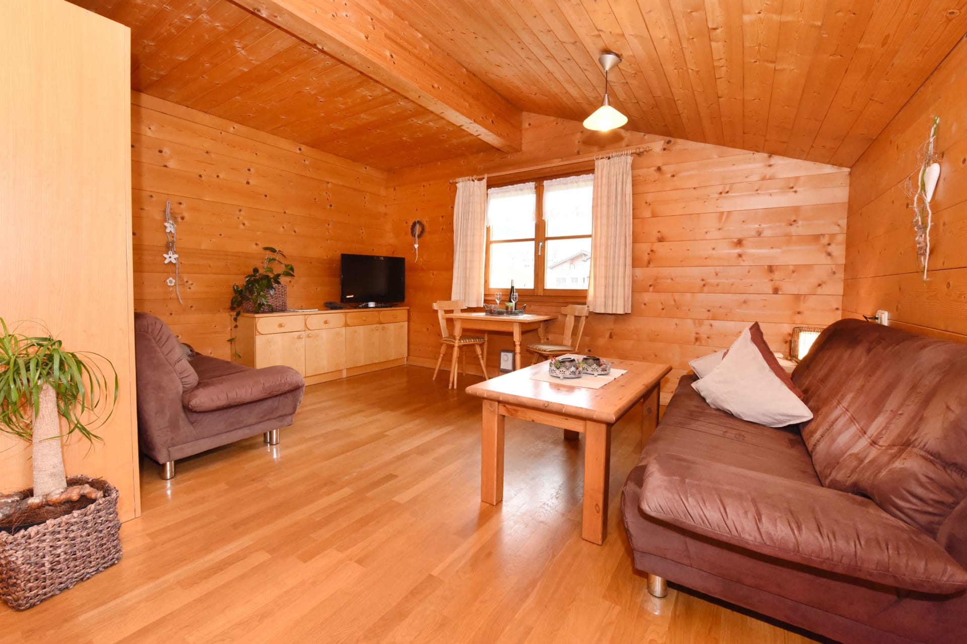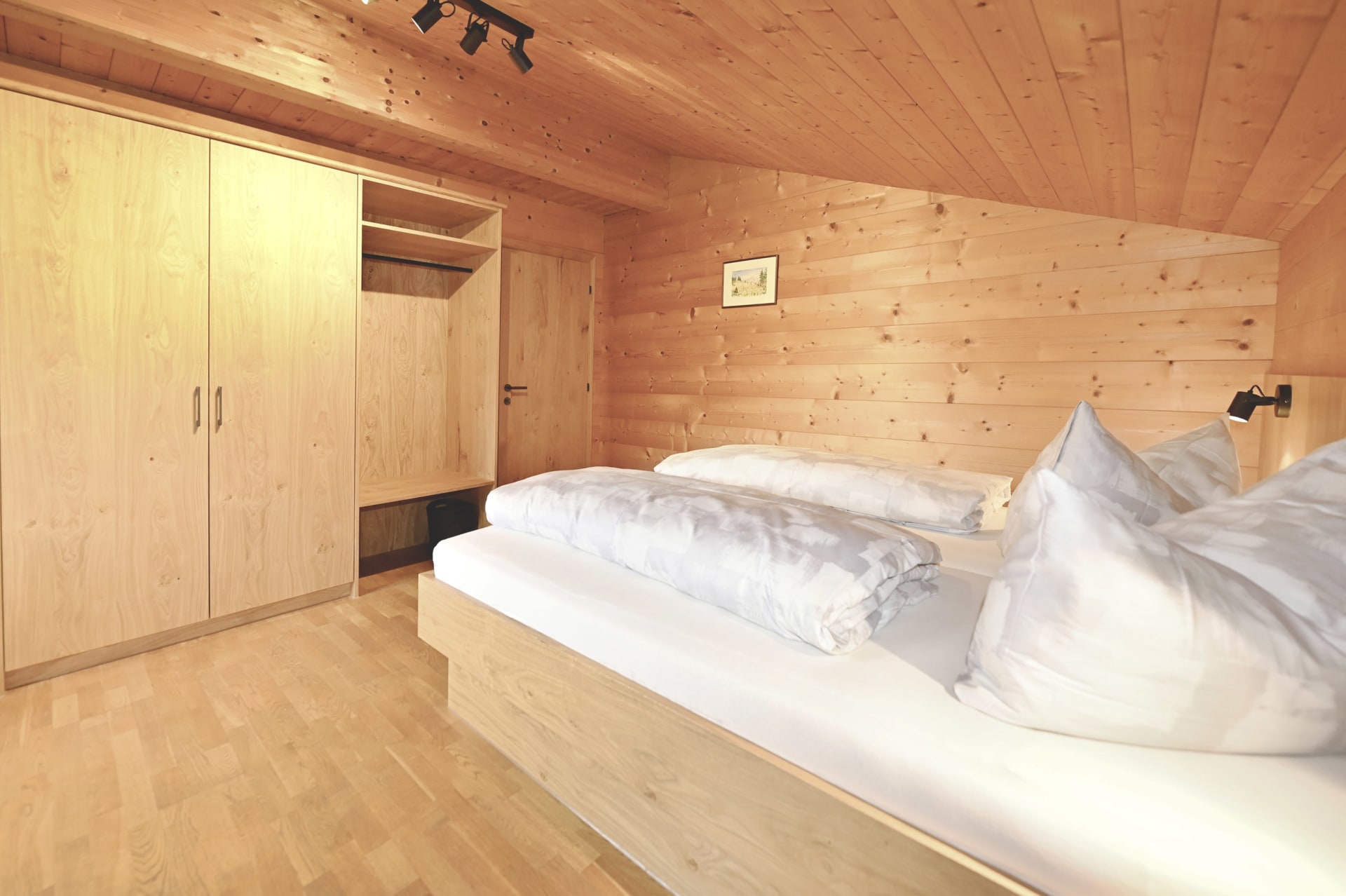 Die Wohnung verfügt über zwei separate Schlafzimmer, die im Jahr 2024 von einem heimischen Schreiner liebevoll und hochwertig mit Vollholzmöbeln renoviert wurden – für ein besonders wohliges Schlafklima und ein Stück Natur im Raum. Der große Wohnbereich mit integrierter Küche, gemütlicher Essecke und komfortabler Couch lädt zum Verweilen ein. Vom sonnigen Südbalkon genießen Sie einen herrlichen Blick auf die umliegende Bergwelt.
