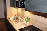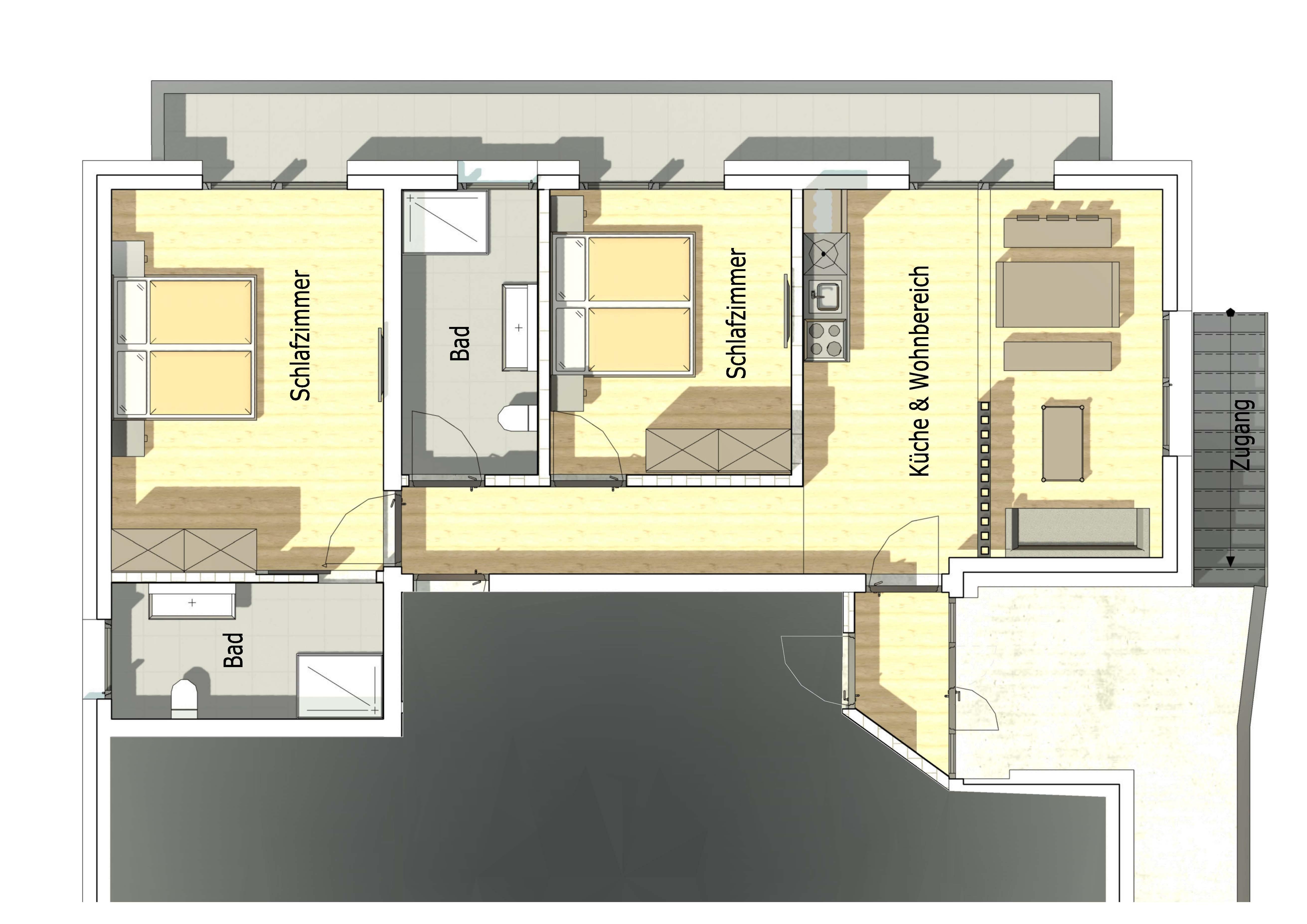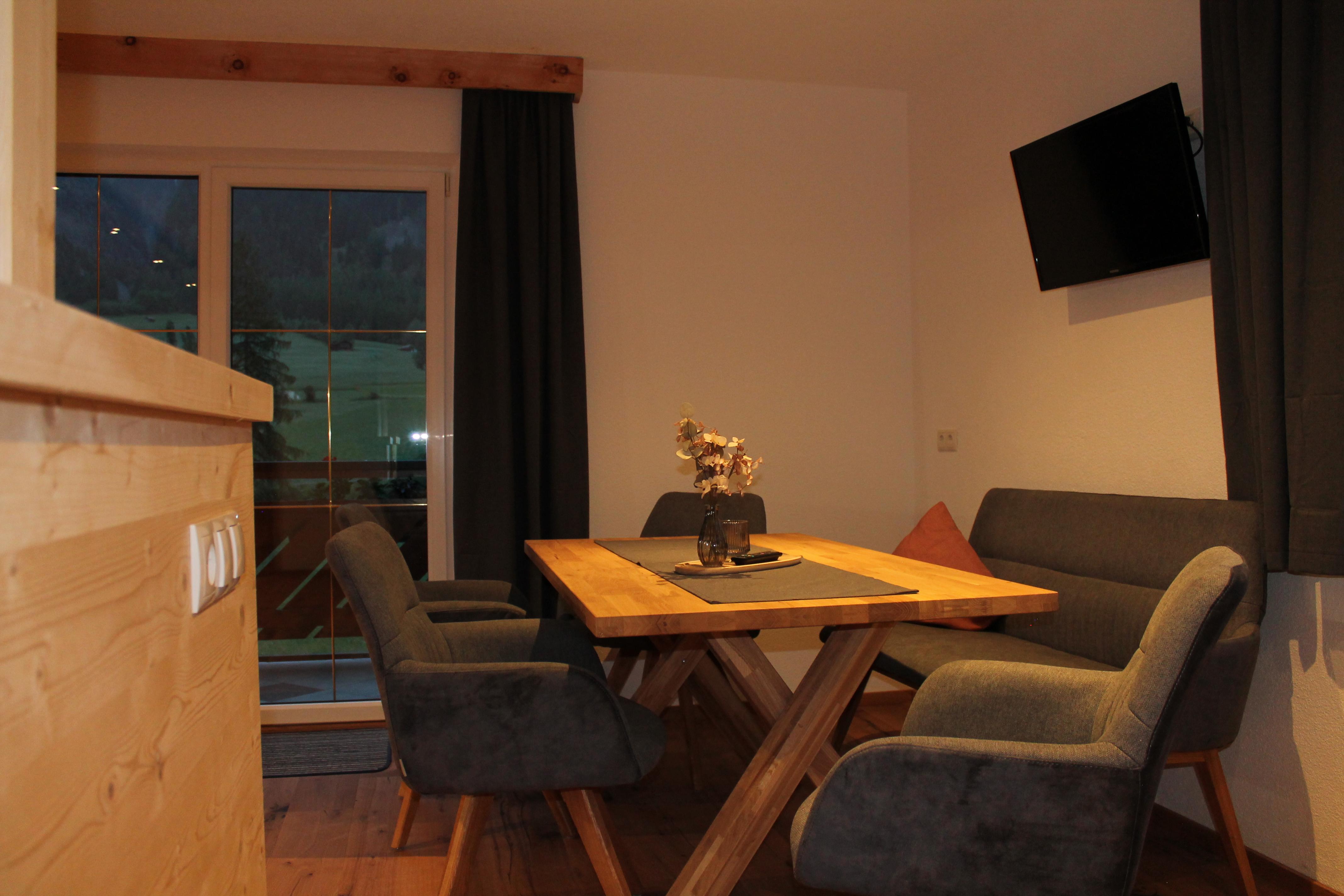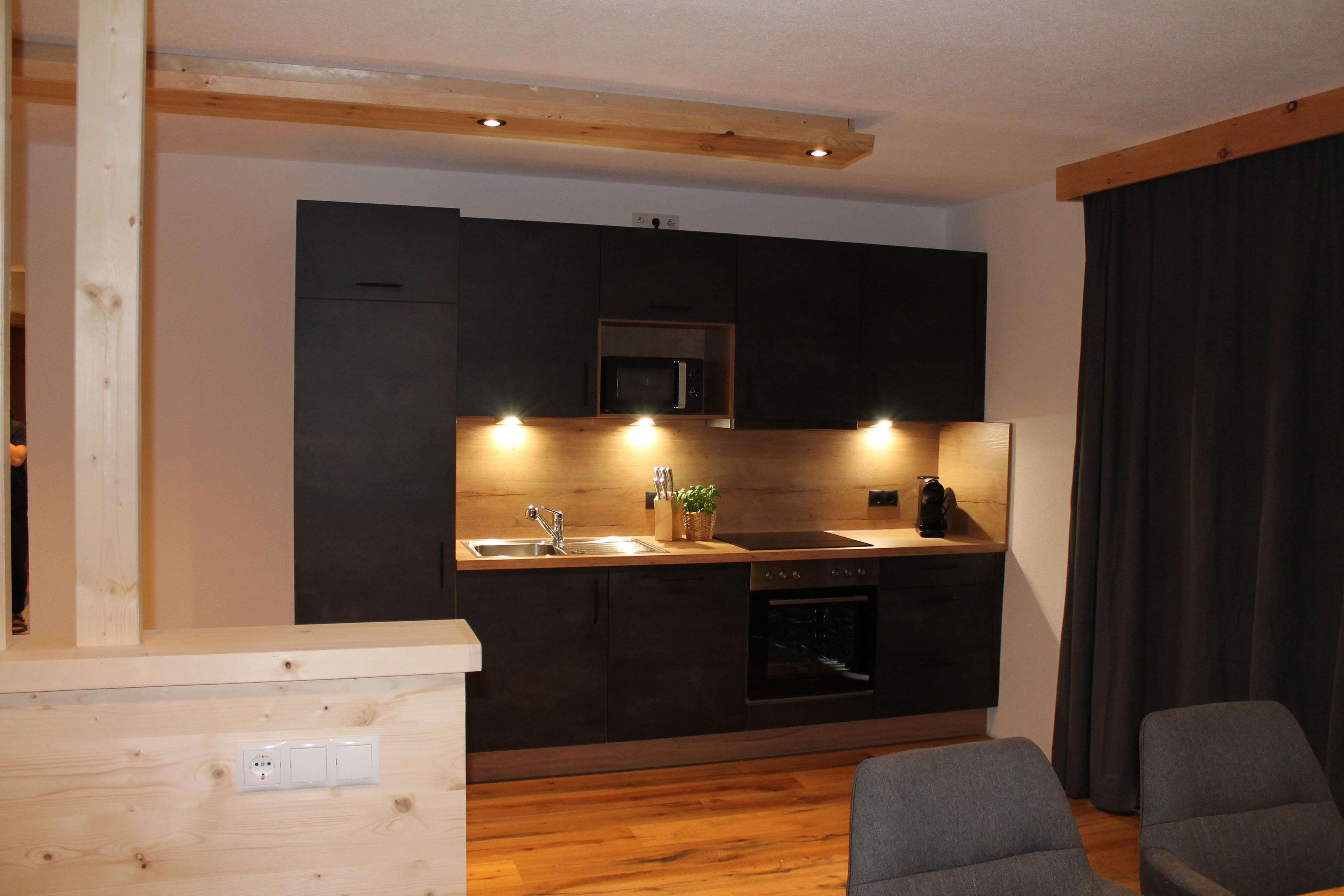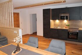 Das Appartement (ca. 75 m²) mit eigenem Eingang verfügt über 2 Zirbenholz-Doppelzimmer, jeweils mit Flat-TV und eigenem Badezimmer mit Dusche/WC. Außerdem bietet es eine großzügige, vollausgestattete Wohnküche (Cerankochfeld, Backrohr, Mikrowelle, Kühlschrank/Gefrierfach, Spülmaschine, Kaffeemaschine, Toaster, uvm.) mit einer Doppelausziehcouch (Schlafmöglichkeit für die 5. und 6. Person). Genießen Sie das einzigartige Bergpanorama vom eigenen möblierten Balkon aus.