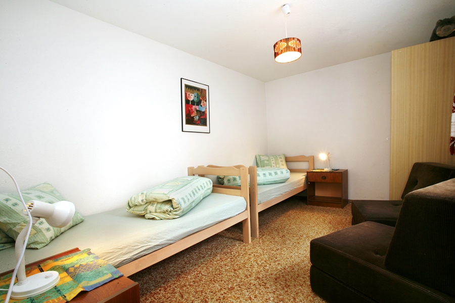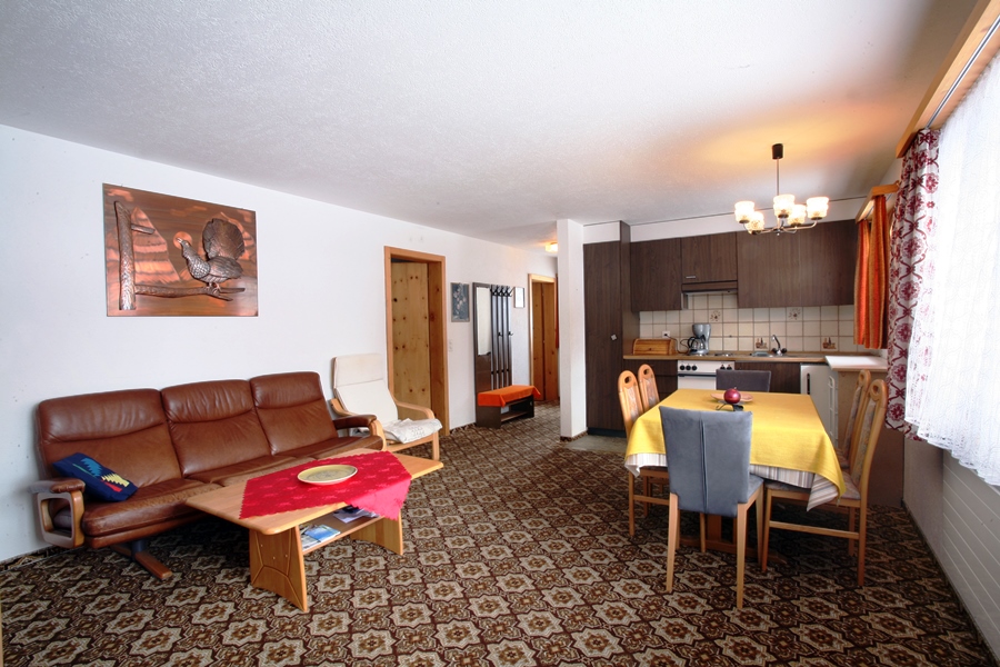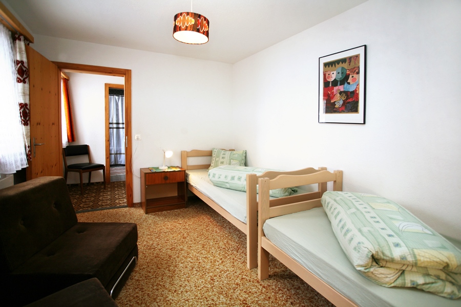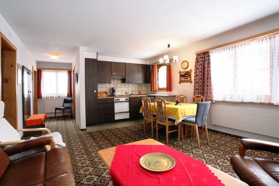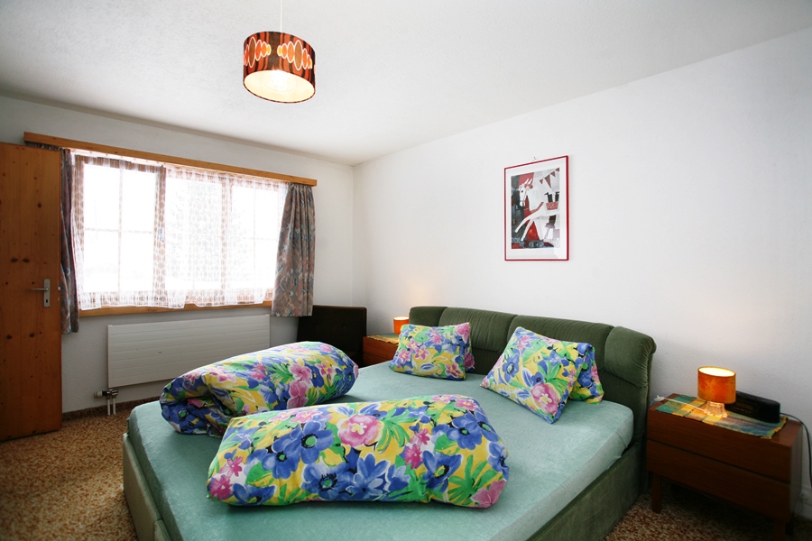 3 Zimmer-Wohnung mit schönem, grossem Wohnzimmer mit Satelliten-TV und Radio, Wohnküche. 2 Schlafzimmer: 1 Zimmer mit 2 Einzelbetten und Zusatzbett, 1 Zimmer mit Doppelbett, Badezimmer mit Badewanne/WC. Auf Anfrage kann in der Eigentümer-Wohnung ein Doppelzimmer mit Dusche/WC dazugemietet werden. Bitte direkt mit dem Vermieter verrechnen. (CHF 30.-/Nacht) Küchenwäsche vorhanden und inbegriffen, Badwäsche bitte selber mitnehmen. Bodenbelag: Laminat