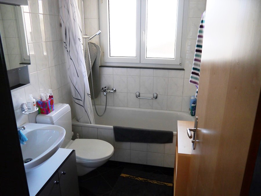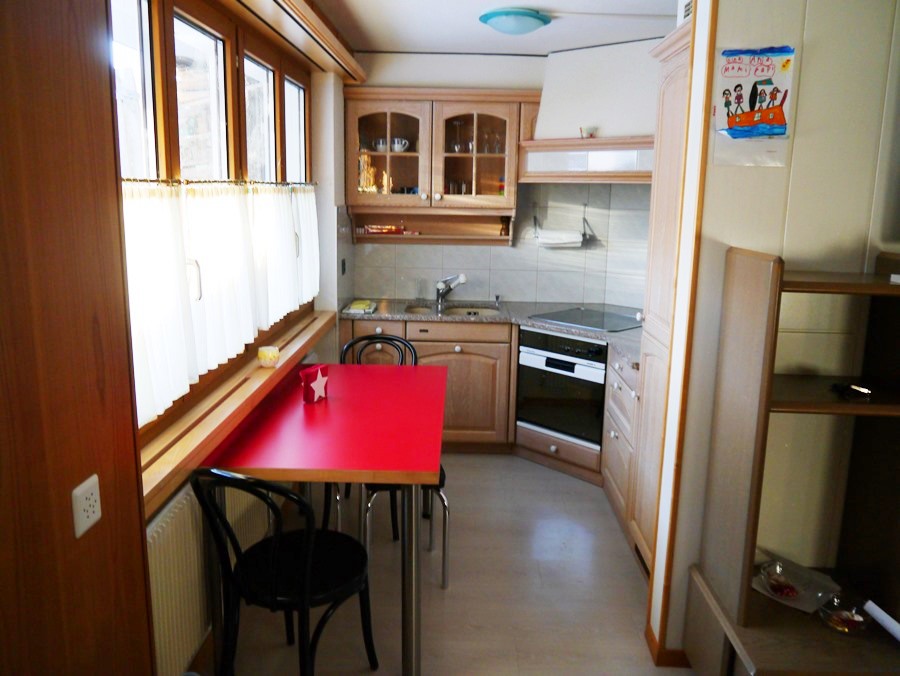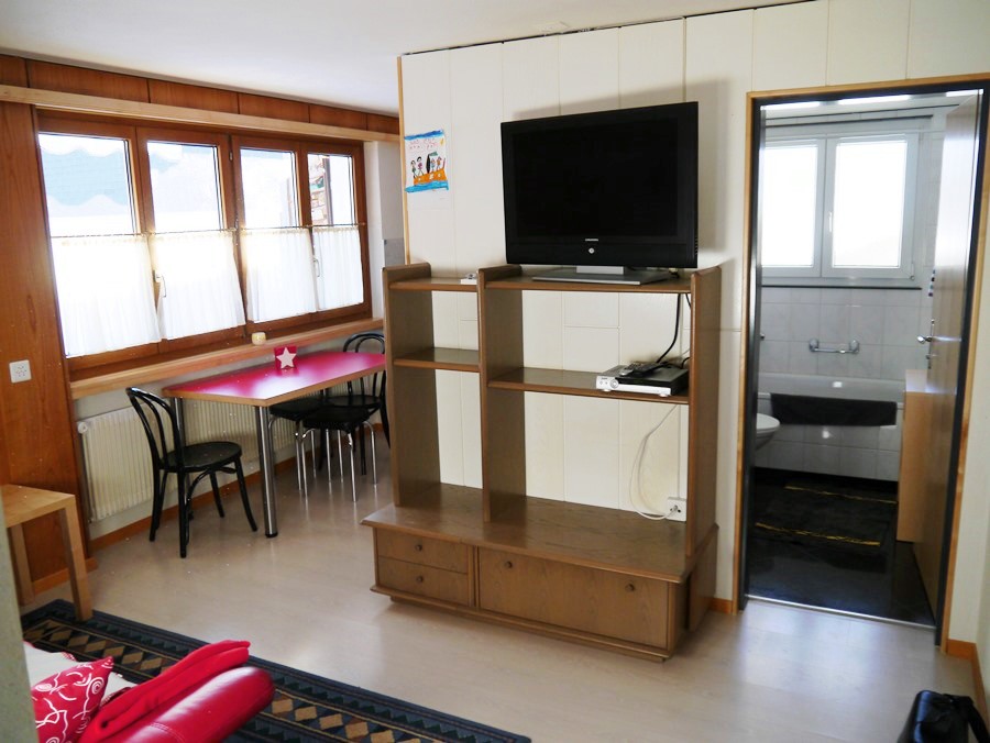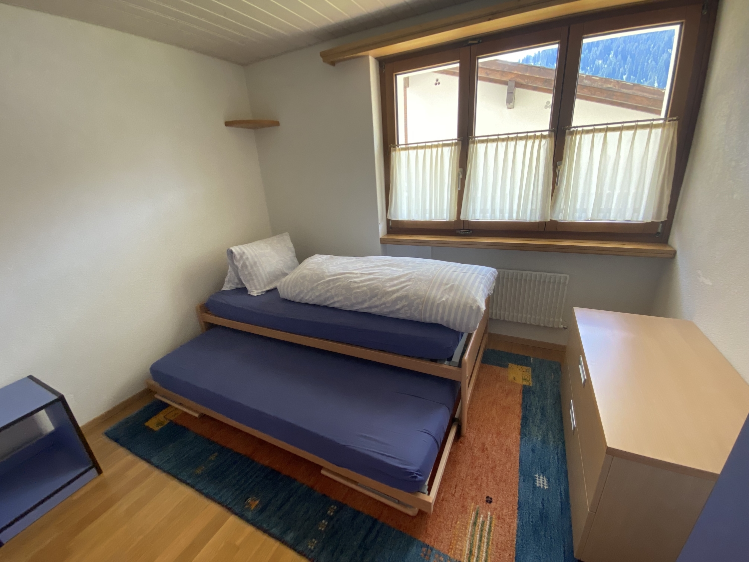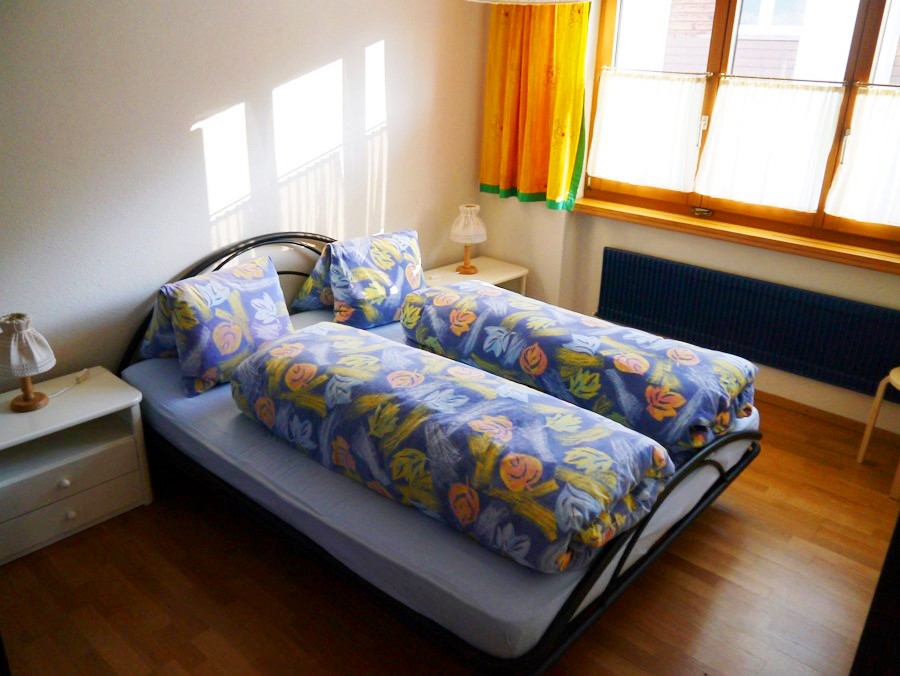 Die Ferienwohnung Schlafzimmer: 2 Schlafzimmer: In einem Schlafzimmer befindet sich ein frazösisches Bett und im anderen Schlafzimmer zwei Einzelbetten (Ausziehbett). Beide Schlafzimmer verfügen über einen Kleiderschrank und/oder einer Kleiderkommode. Die Betten sind bei Ankunft bezogen. Laminatboden. Badezimmer: Das Badezimmer verfügt über eine Badewanne, ein Lavabo mit Unterschrank und Spiegelschrank sowie einem WC. Das Badezimmer hat ein Fenster und ein offenes Holzgestell als Ablagefläche und Bodenheizung. Plattenboden. Frotteewäsche bitte selber mitnehmen. Wohnzimmer: In der Wohnküche befinden sich eine ausfahrbare, ledrige Polstergruppe für 4 Personen und ein Wandgestell mit einem TV-Gerät. Küche: Die Küche ist komplett ausgestattet und verfügt über einen Glaskeramik Kochherd, Backofen, Kühlschrank, ein Wasserkocher, einer Nespresso Kaffeemaschine mit Kapseln, einem Raclette-Ofen sowie einem Fondue Caquelon. Direkt an der Fensterfront in der Wohnküche befinndet sich ein Esstisch mit vier Stühlen. Laminatboden. Die Küchenwäsche ist vorhanden und im Preis inbegriffen.