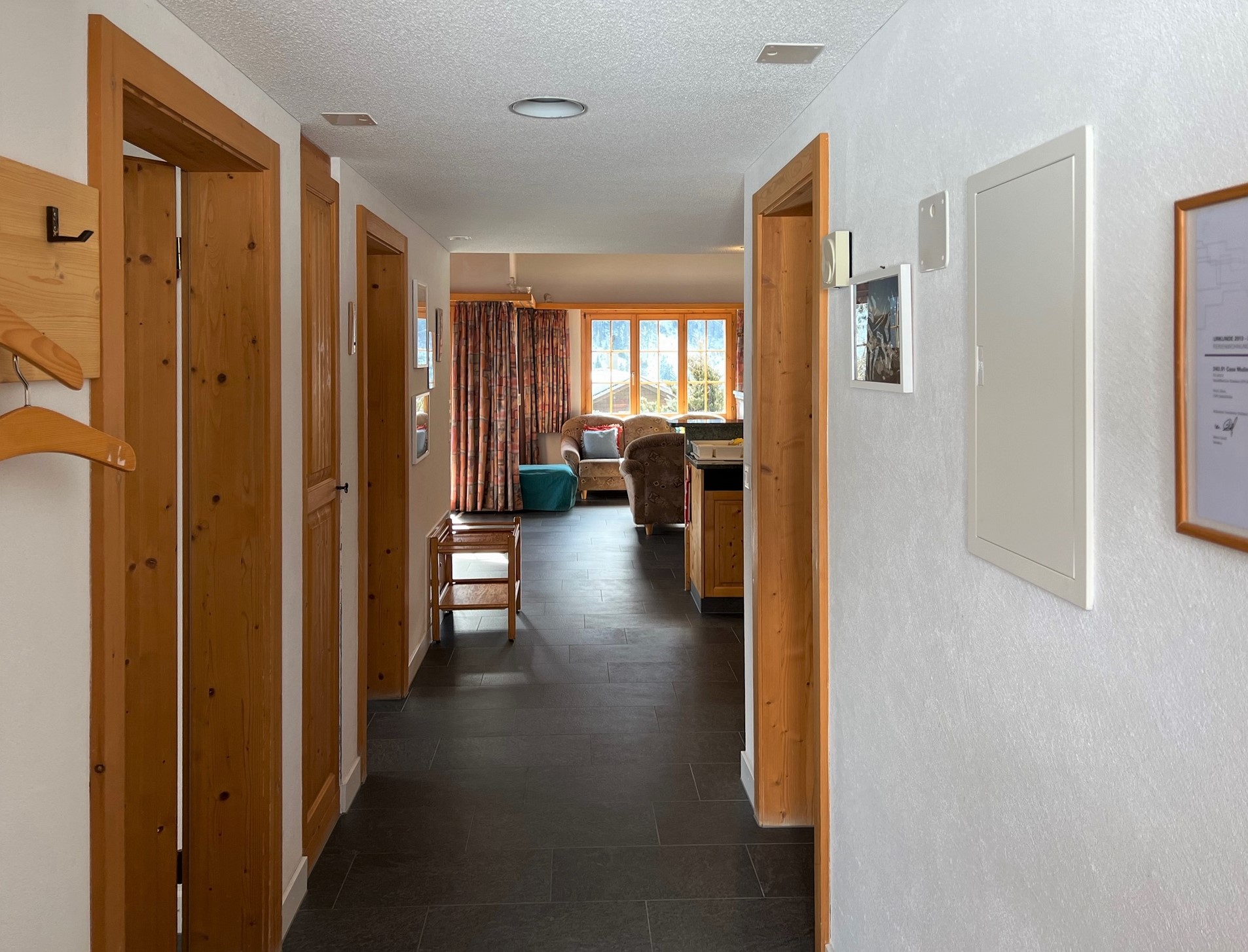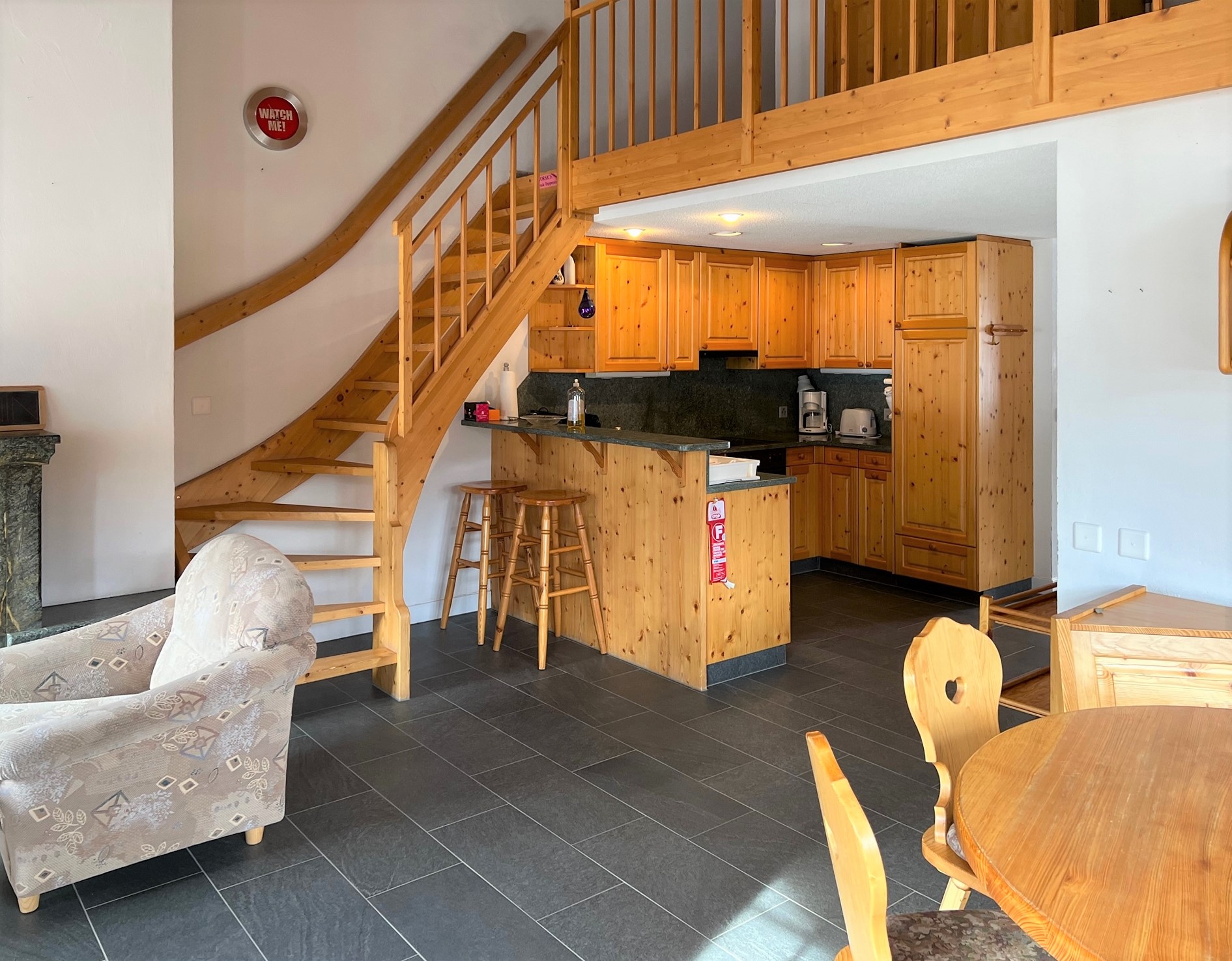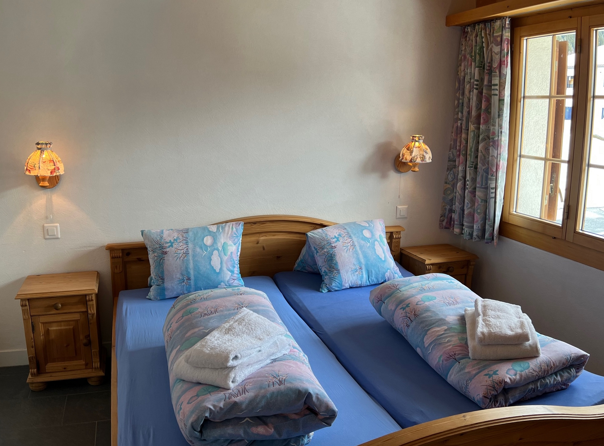 Komfortable 4.5-Zimmerwohnung, rustikal möbliert. Grosser Wohn-/Essraum mit Küche, Geschirrspüler, Radio/TV mit Flachbildschirm.3 Schlafzimmer: 1 Zimmer mit Doppelbett, 2 Zimmer mit je 2 Einzelbetten. Zusätzliches Reservezimmer mit 2 Betten in der Dachschräge für Besucher (auf Anfrage) . Badzimmerm mit Dusche/WC und Lavabo, plus 1 sep. WC mit Lavabo und Waschraum.Küchen- und Badwäsche auf Wunsch verfügbar.