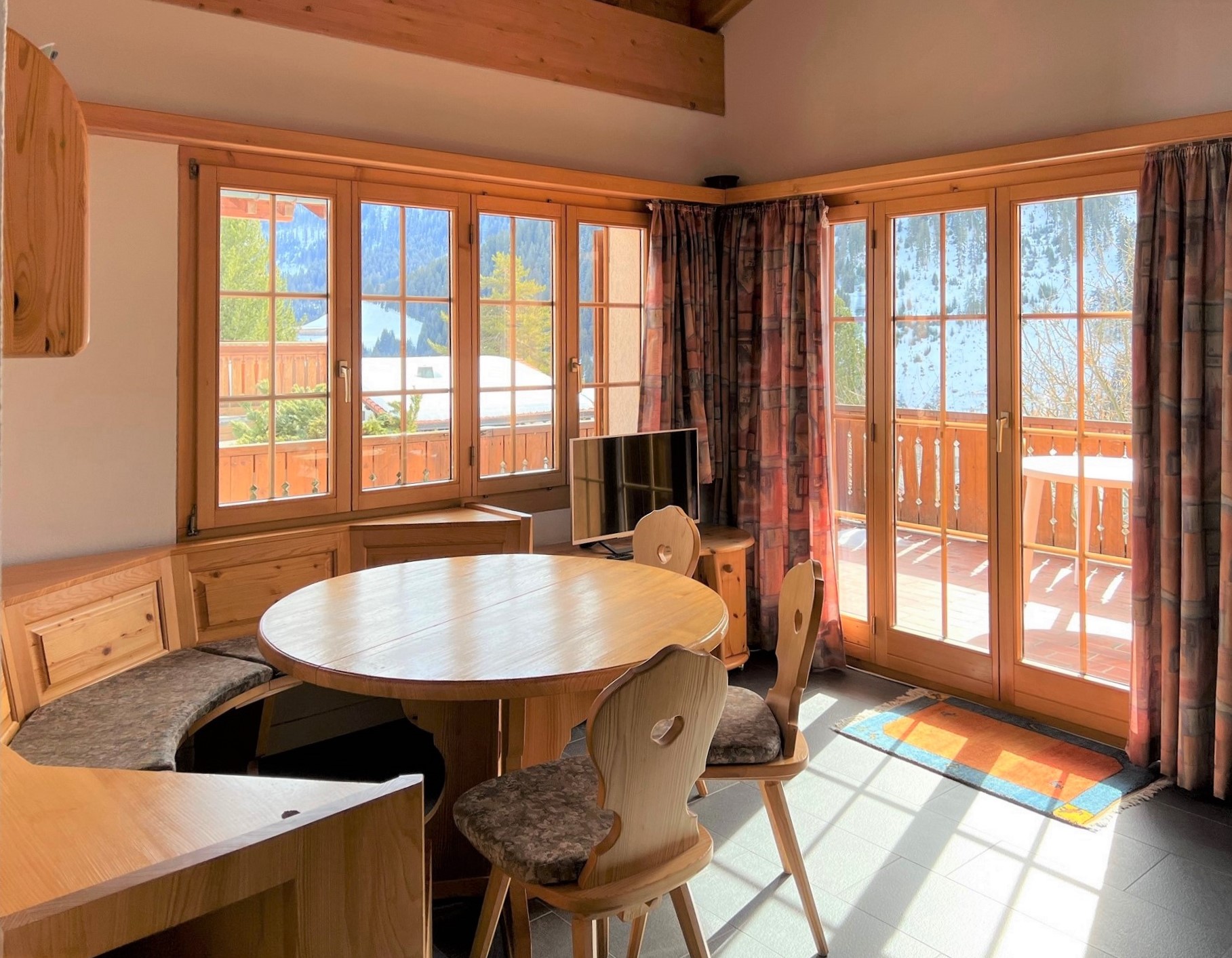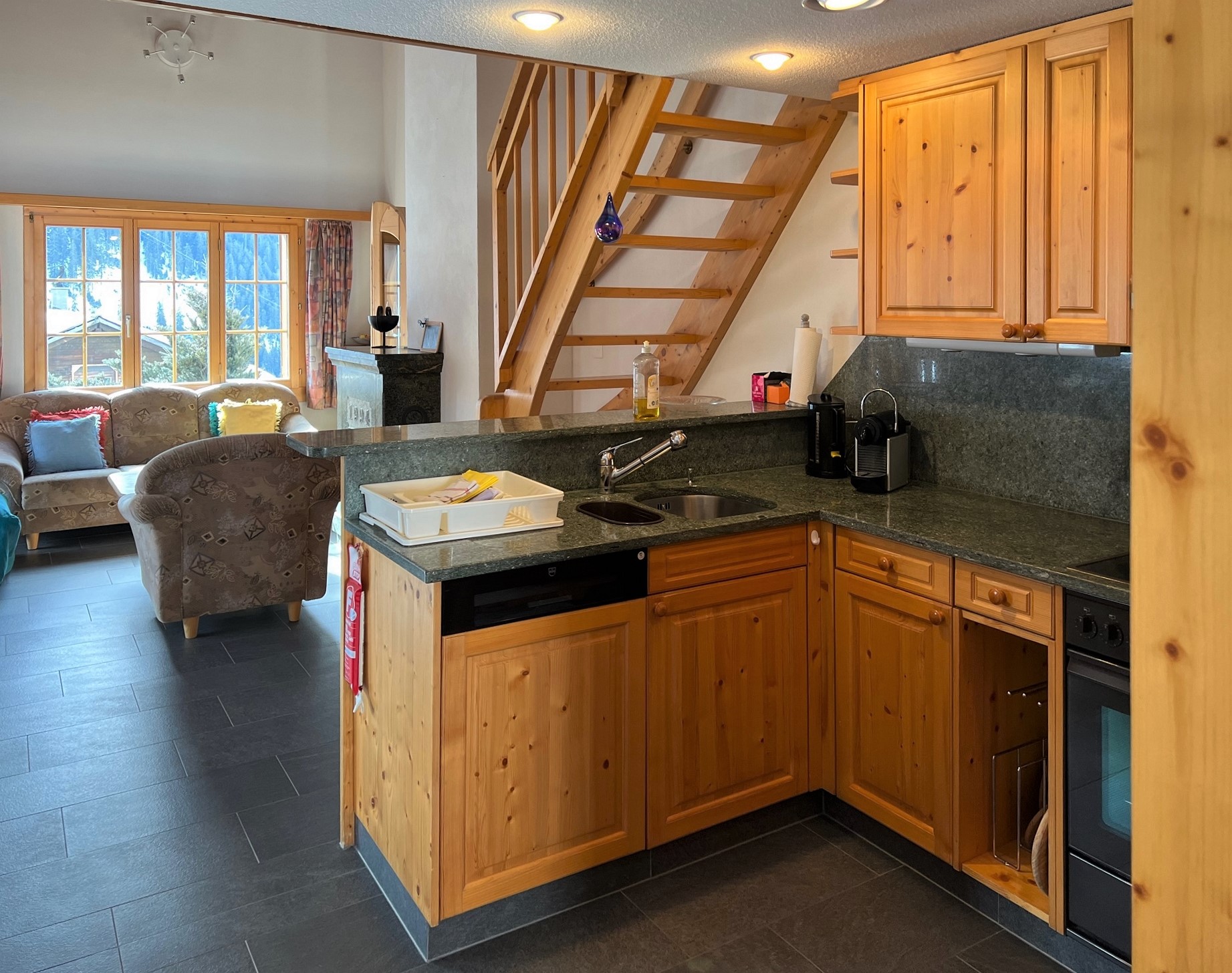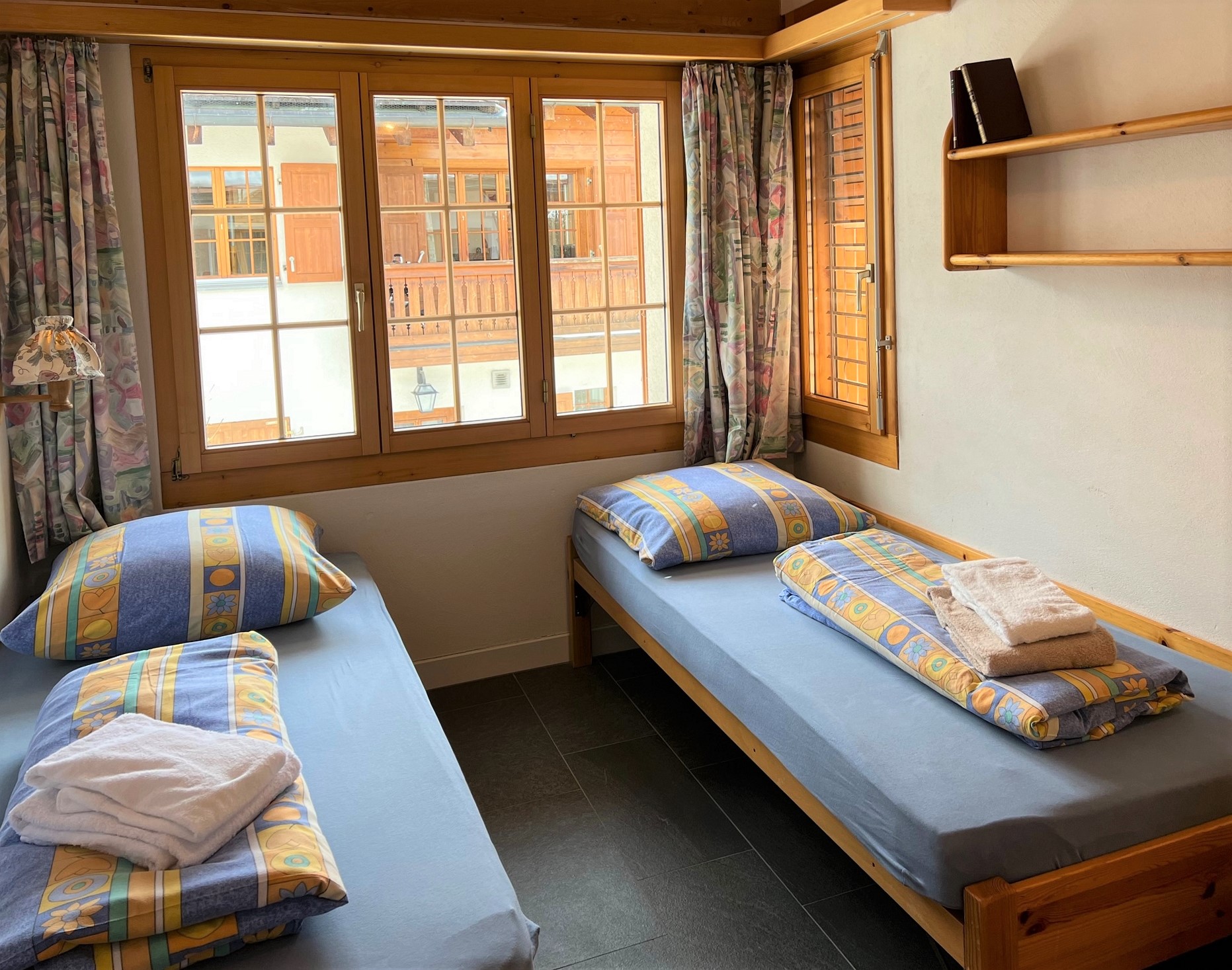 Komfortable 4.5-Zimmerwohnung, rustikal möbliert. Grosser Wohn-/Essraum mit Küche, Geschirrspüler, Radio/TV mit Flachbildschirm.3 Schlafzimmer: 1 Zimmer mit Doppelbett, 2 Zimmer mit je 2 Einzelbetten. Zusätzliches Reservezimmer mit 2 Betten in der Dachschräge für Besucher (auf Anfrage) . Badzimmerm mit Dusche/WC und Lavabo, plus 1 sep. WC mit Lavabo und Waschraum.Küchen- und Badwäsche auf Wunsch verfügbar.