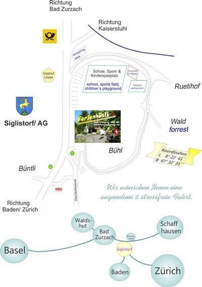 Umgebung: Siglistorf befindet sich an der Kantonsgrenze zwischen dem Kanton Aargau & Zürich - unweit der Kurorte Bad Zurzach und Baden mit ihren Thermalbädern und historischen Innenstädten (Baden = höchste Schweizer Gesamtmineralisation von 4450mg/l bei 46.6°C, Aquae Helveticae).