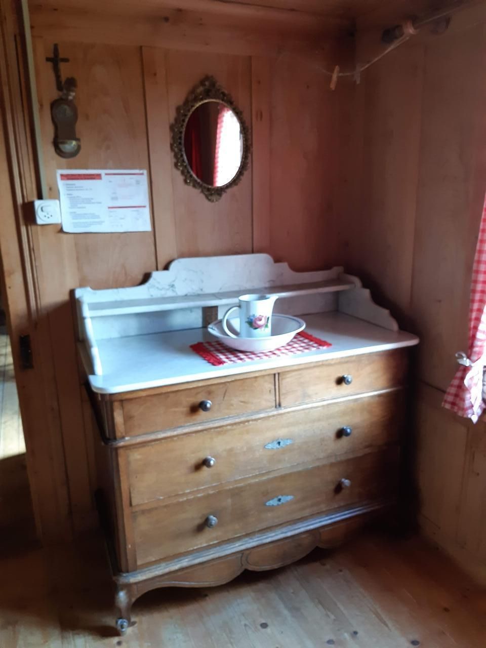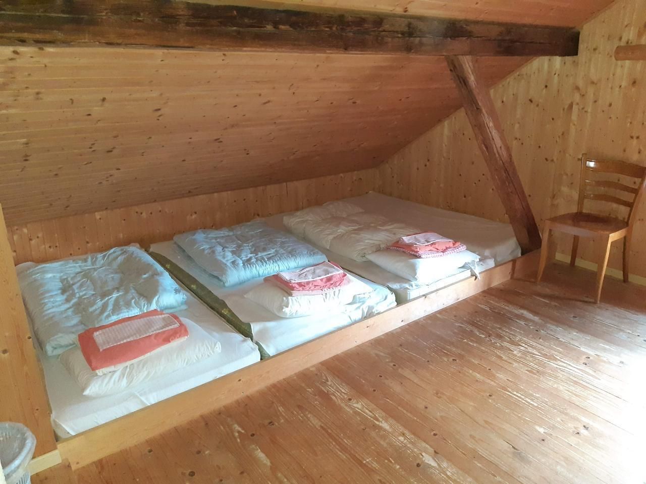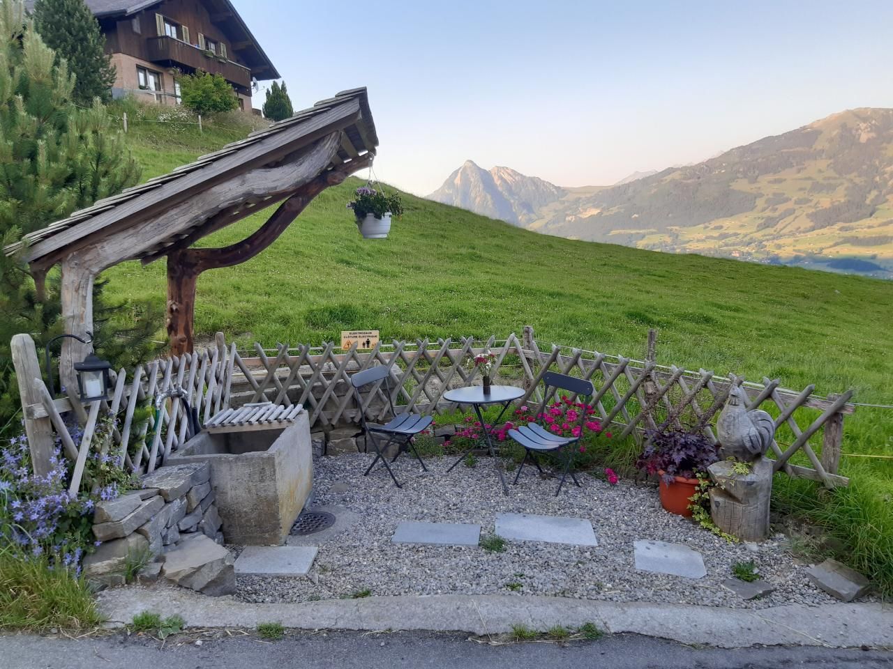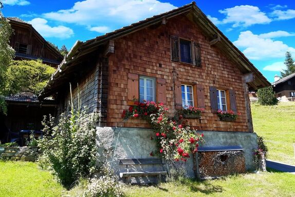 In der urtümlichen, traditionell gestalteten Hütte gibt es weder sanitäre Anlagen (Dusche, WC etc.) noch fliessend Wasser. Die ländliche Atmosphäre zeigt sich anhand des Brunnentroges vor dem Haus und dem Plumpsklo. Für den nötigen Komfort kann das Badezimmer im Bauernhaus nebenan (ca. 30m) benützt werden.