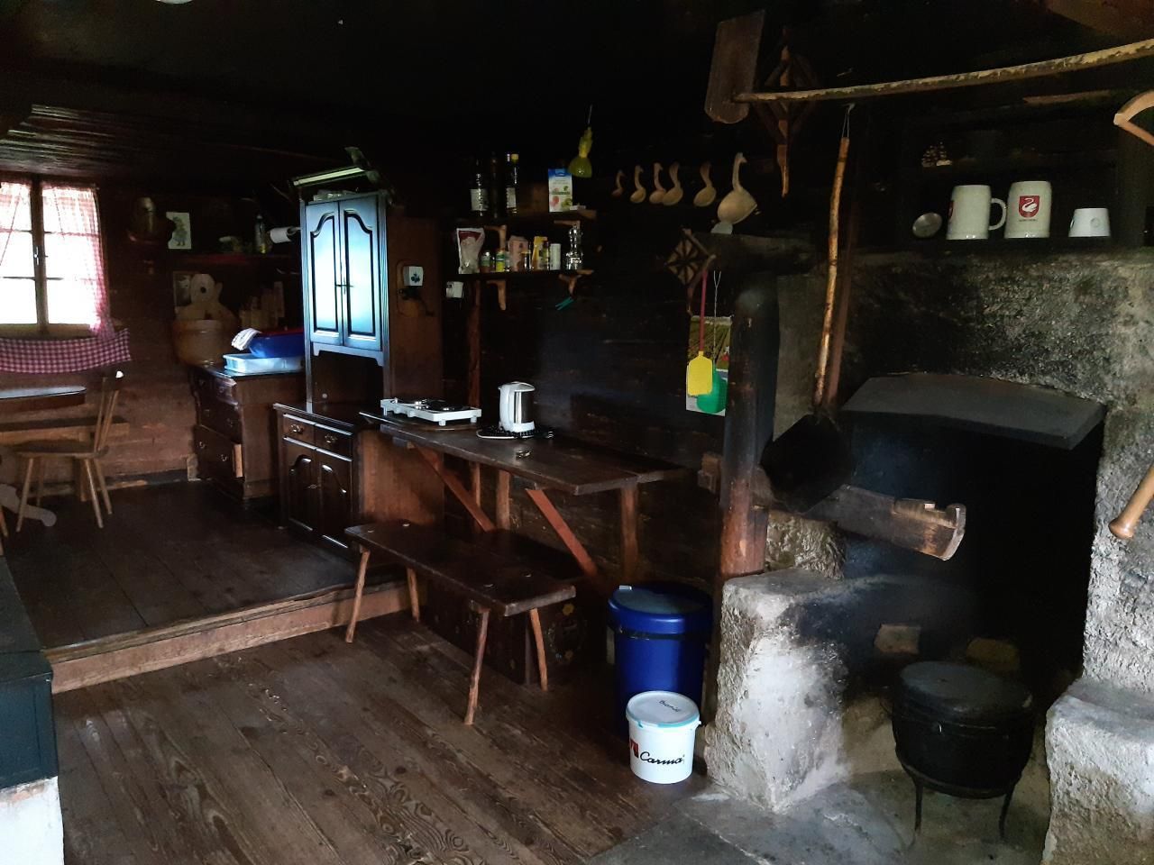 Sonstige Kücheneinrichtung (Küche1): KEIN FLIESSEND WASSER IM HAUS! Brunnentrog mit frischem Bergquellwasser steht direkt vor dem Haus.Antiker Holzkochherd plus 2 elektrische Kochplatten, offene FeuerstelleFilterkaffeemaschine (Filter sind vorhanden)In der kälteren Jahreszeiten wird die Küche nur warm, wenn auf dem Holzherd gefeuert und auch gekocht wird.