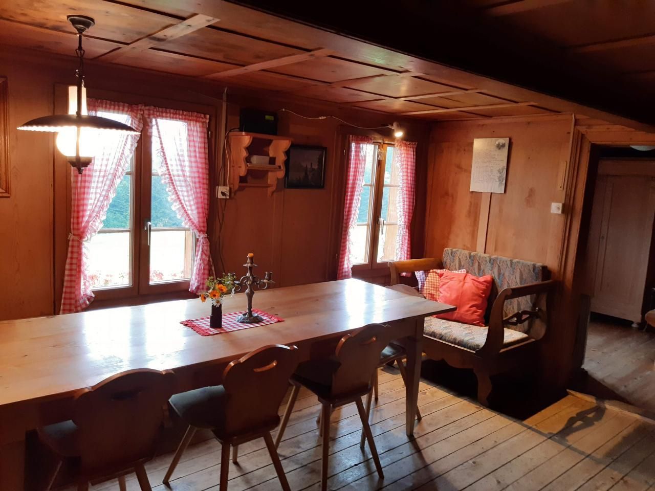 Gekocht und geheizt wird mit Holz, der Kachelofen im heimeligen Stübli versprüht nostalgische Stimmung. Im Erdgeschoss gibt es ein Doppelzimmer, im Obergeschoss ein Massenlager für ca. 8 Pers. Der gedeckte Sitzplatz mit Cheminée und Feuerschale lädt zum gemütlichen Verweilen ein.