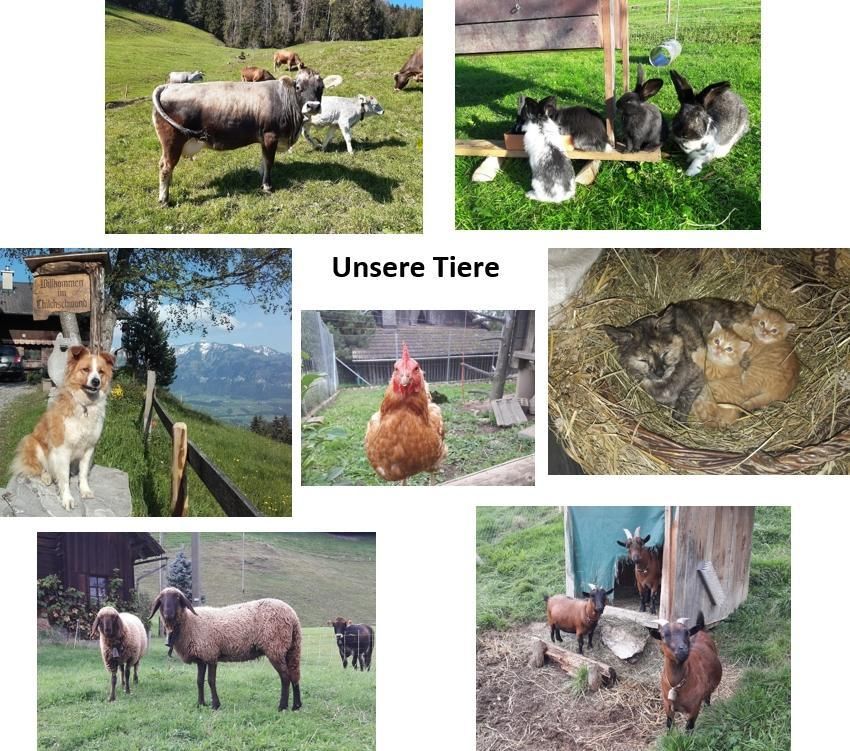 Auf unserem Hof haben wir Kühe, Kälber, Hunde, Katzen, Ziegen, Schafe, Hühner und Kaninchen.