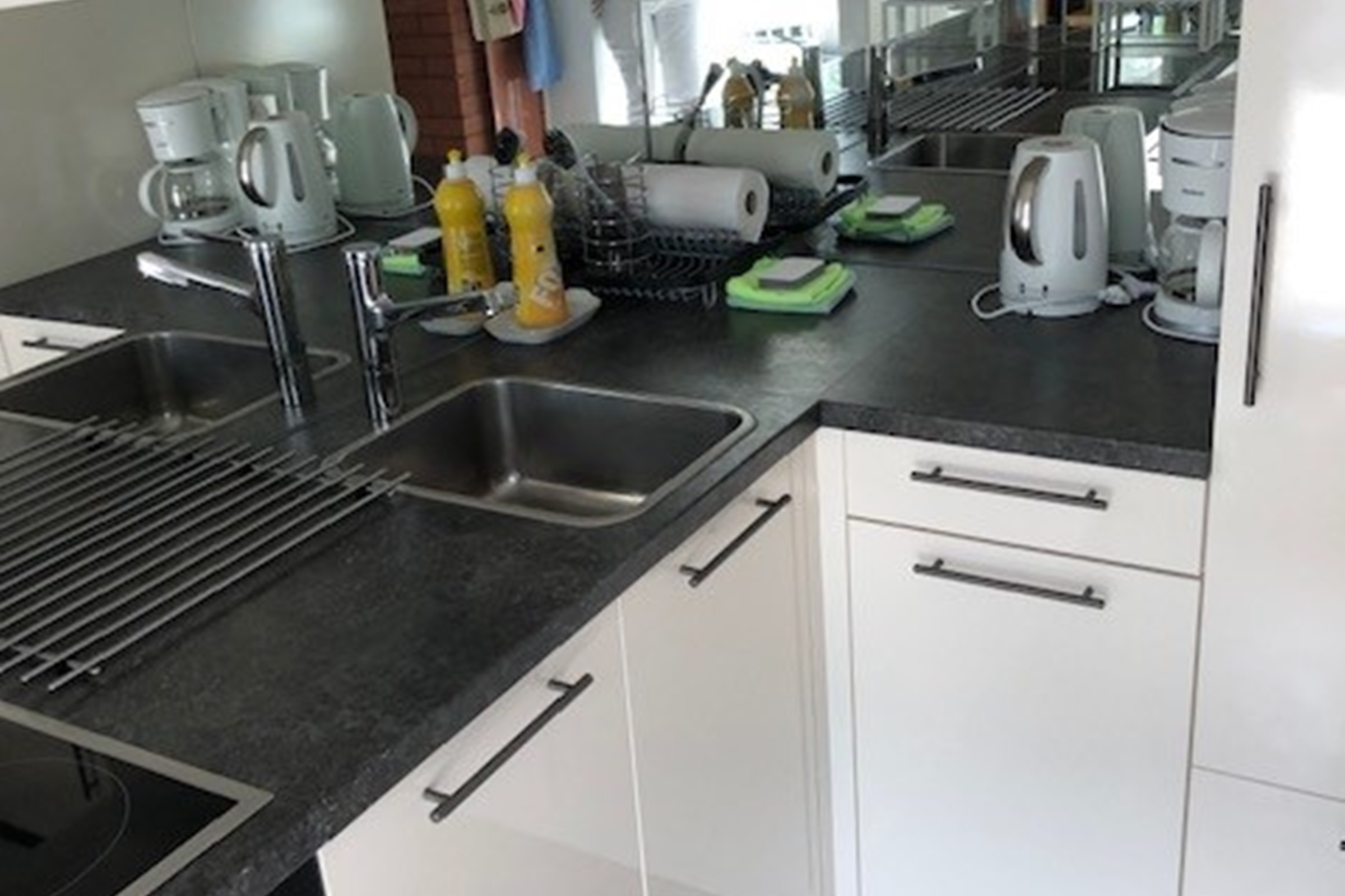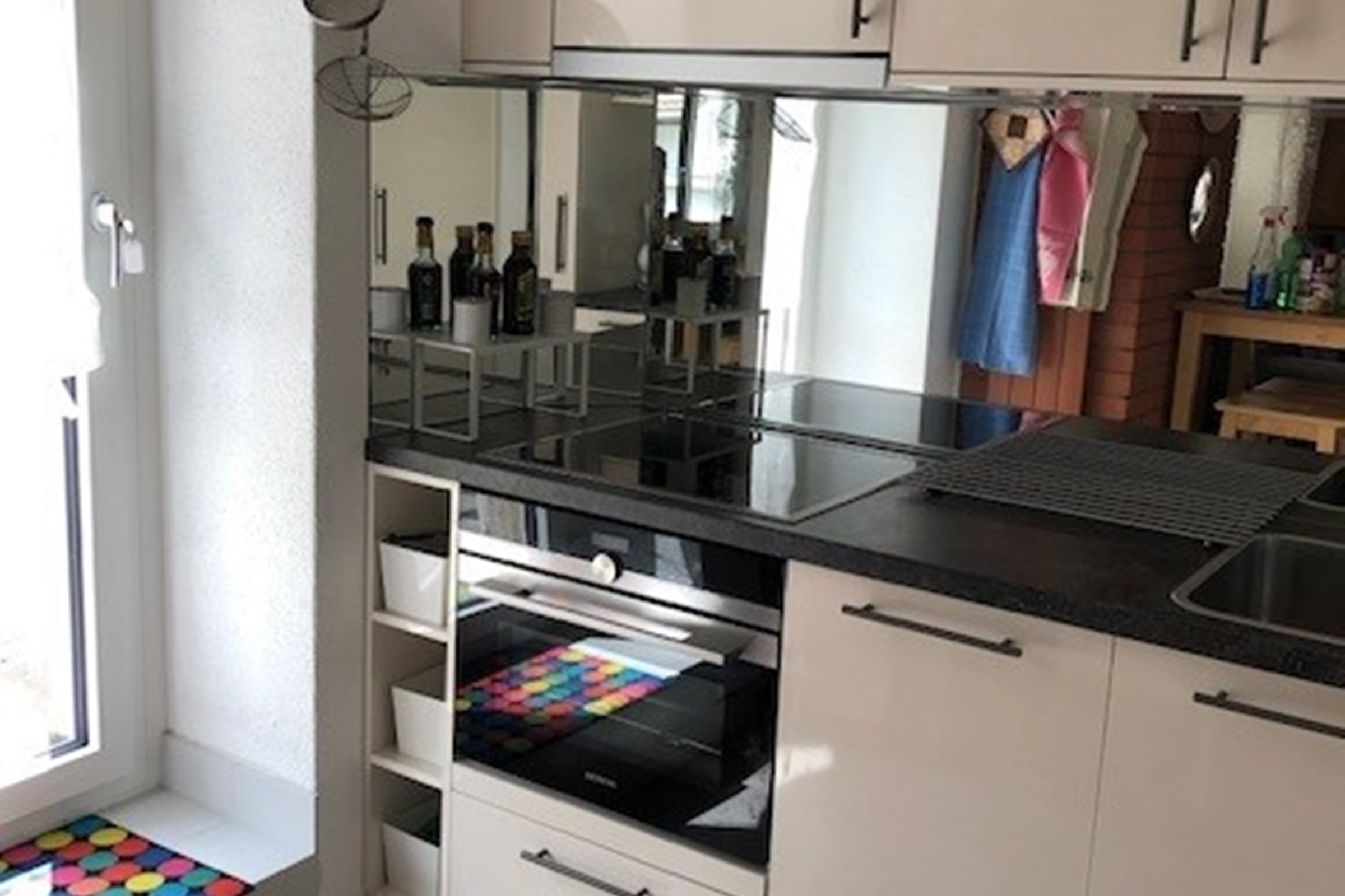 Neu renovierte Küche mit Keramikkochfeld, Backofen, grosser Kühlschrank, Geschirrspülmaschine, Kaffeemaschine, Wasserkocher, Toaster, Fondue-Raclette Set. Inneneinrichtung