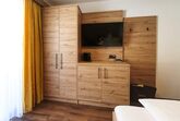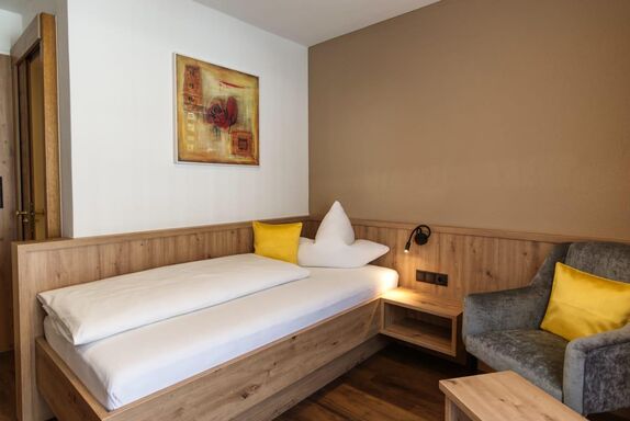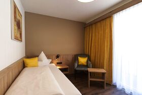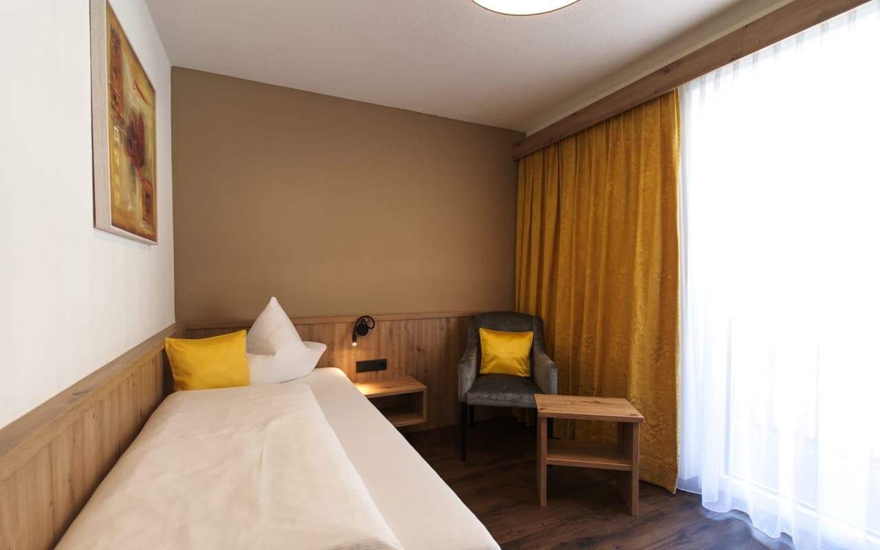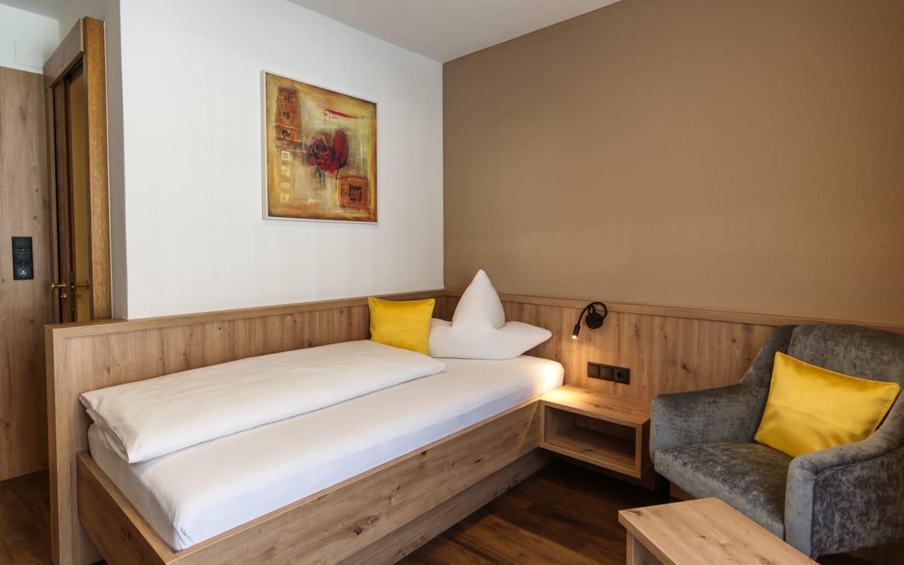 Das Einzelzimmer, ca. 15 m², liegt im zweiten Stock und verfügt über einen Ostbalkon mit Blick auf die Berge. Es ist ausgestattet mit einem Einzelbett, einem Flat-Screen TV, Safe und einer Wellnesstasche mit Badetuch, einen Mini-Kühlschrank, einen Wasserkocher sowie einer Kapselkaffeemaschine. Eigenes Badezimmer mit Dusche/WC, Haartrockner, Kosmetikspiegel und Pflegeprodukten. OHNE FRÜHSTÜCK.