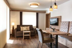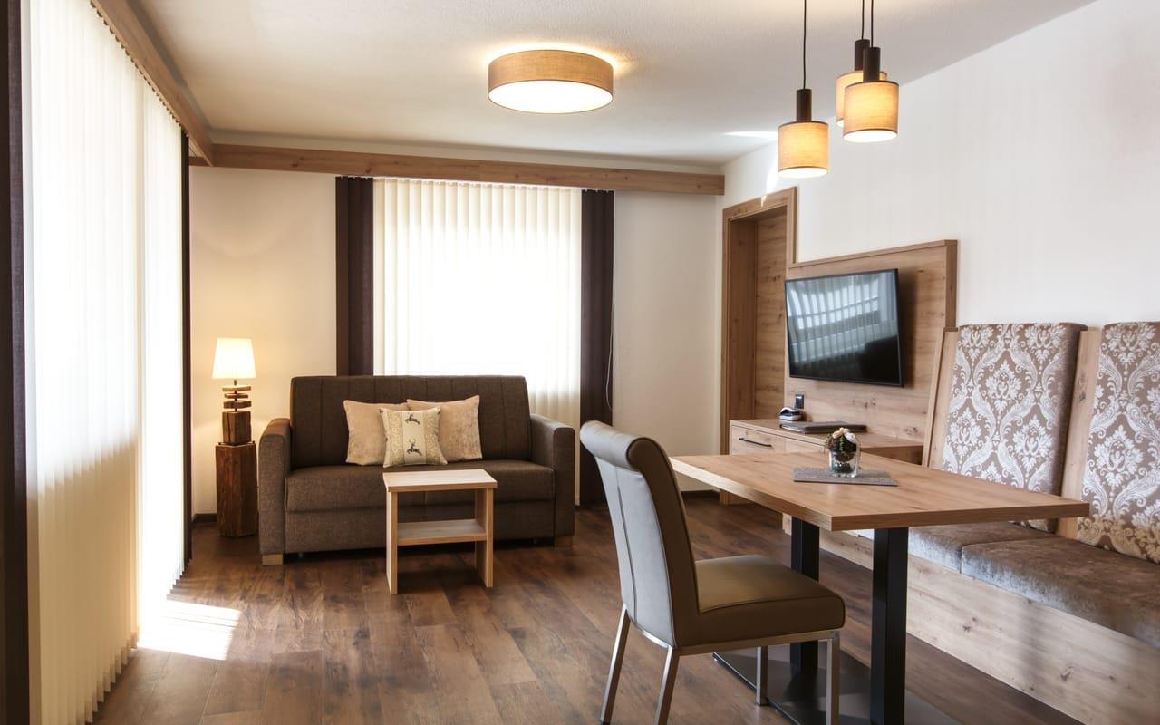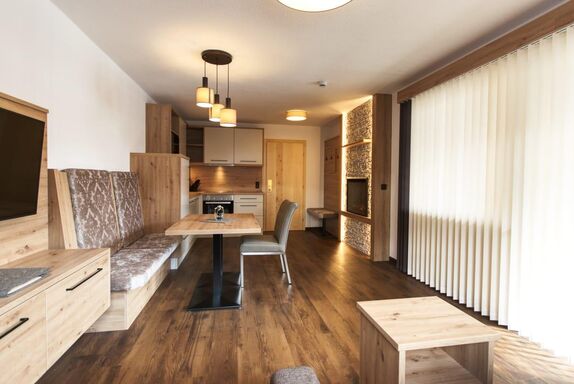 Das Appartement Nr. 6 liegt im zweiten Stock und verfügt über einen großen Süd-Westbalkon mit Blick auf die imposante Bergwelt. Es verfügt über 1 Doppelzimmer; 1 Badezimmer mit Badewanne mit Duschtüre/WC; 1 Wohnküche (Mikrowelle, Wasserkocher, Kapsel-Kaffeemaschine, Filter-Kaffeemaschine, Spülmaschine, Kühlschrank mit Gefrierfach, Cerankochfeld mit 4 Kochfeldern, Backrohr, Essbereich, Kochgeschirr, Speisegeschirr und Besteck uvm.) mit gemütlichem Wohnbereich. Größe ca. 48 m²