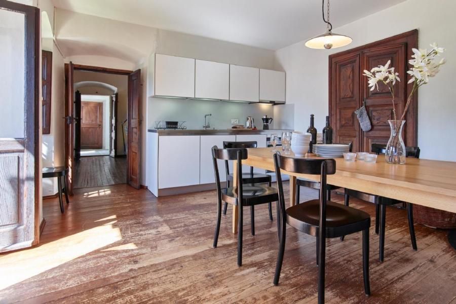 Sonstige Kücheneinrichtung: In der komfortabel ausgestatteten Küche verbindet sich Moderne mit Historie. Die Kücheninfrastruktur wurde speziell dem Casa Döbeli angepasst und verbindet sich nun harmonisch mit den historischen Teilen, wie z.B. einige alte Tessinerstühle, Truhen und eine Chaiselongue noch aus dem Besitz von Herrn Döbeli.