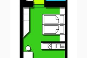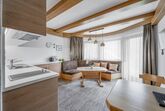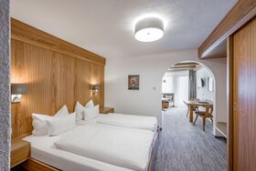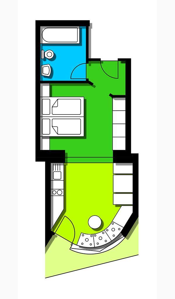 Modern und gemütlich ausgestattetes Appartement mit Wohnnische, Doppelbett getrennt vom Wohnraum, kleine Kochnische mit Zweiplattenherd