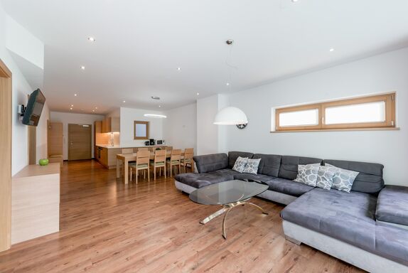 XXL Appartement - 3 Doppelschlafzimmer, jeweils mit Dusche und WC. Durch Zusatzbetten hätten noch 3 weitere Personen Platz. Großer Wohnraum mit Küchenblock ausgestattet mit Viererplatten Kochfeld, Backrohr, Spüle, Kühlschrank, Kaffeemaschine, Geschirrspüler, Mikrowelle und