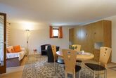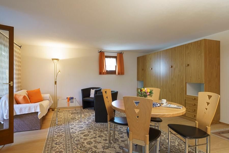 Die Innenraumgestaltung spiegelt mit hochwertigem Eichenparkett und einer liebevoll zusammengestellten Möblierung die Gemütlichkeit des Engadins wider. Das Wohnzimmer, ausgestattet mit einer Sitzgruppe, Esstisch für vier Personen und optionalen Klappbetten, verspricht auch bei schlechtem Wetter angenehme Stunden. Die integrierte, große Küche lässt mit Keramikkochplatte, Dampfabzug, Nespresso-Maschine, und umfassendem Zubehör für Fondue und Raclette keine kulinarischen Wünsche offen. Ein modernes Duschbad/WC sowie ein freundliches Schlafzimmer mit Doppelbett und Nachttischen komplettieren das behagliche Innenraumangebot.