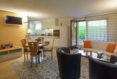Im Außenbereich lädt ein direkt vom Wohnzimmer zugänglicher Gartensitzplatz zum Entspannen in freier Natur ein. Gäste haben die Option, einen Garagenplatz oder Stellplatz im Freien für ihre Fahrzeuge zu mieten, um stets Flexibilität während ihres Aufenthalts zu genießen.