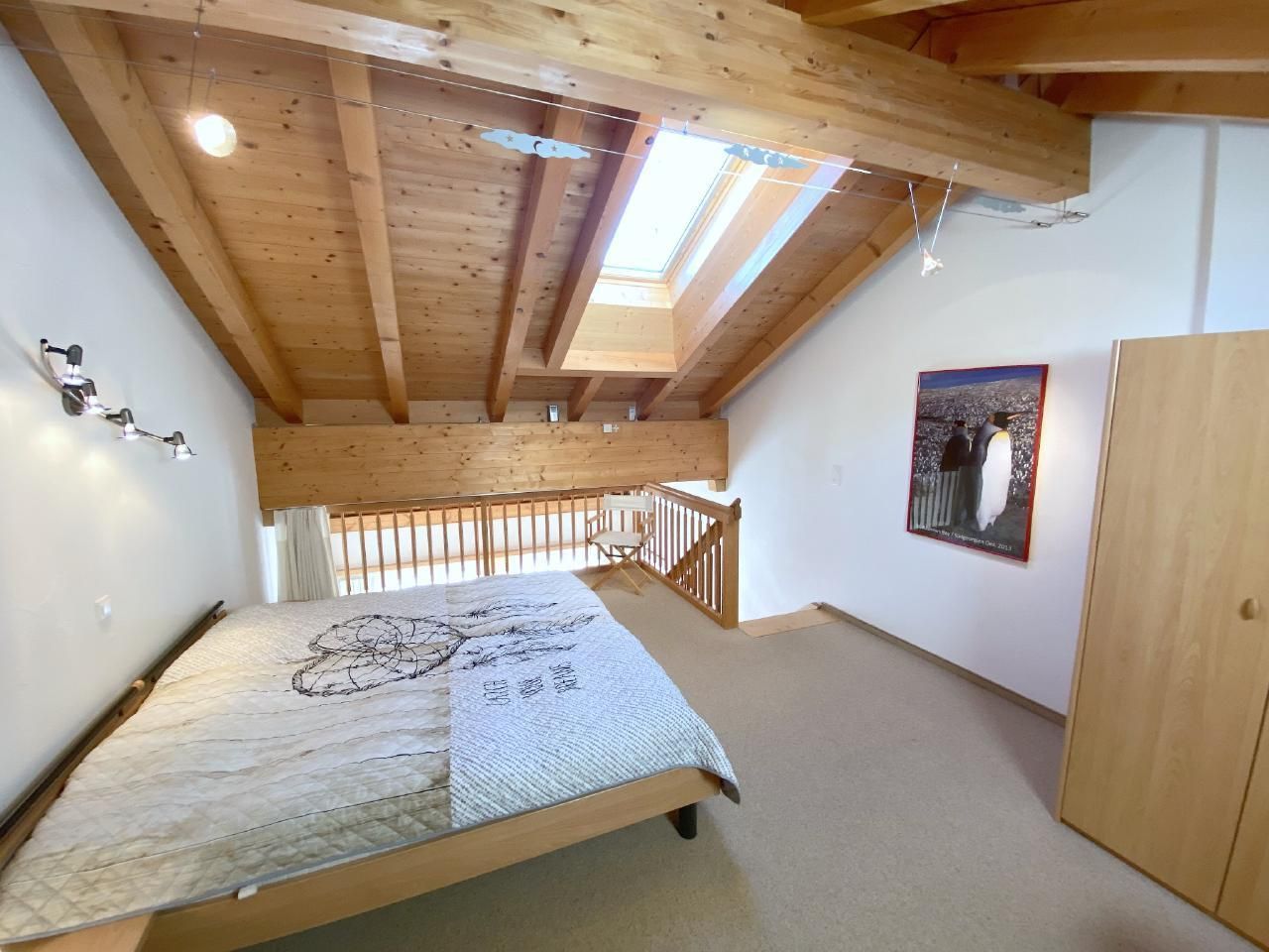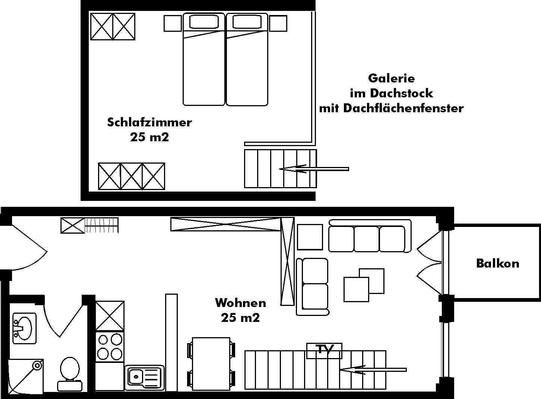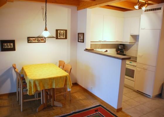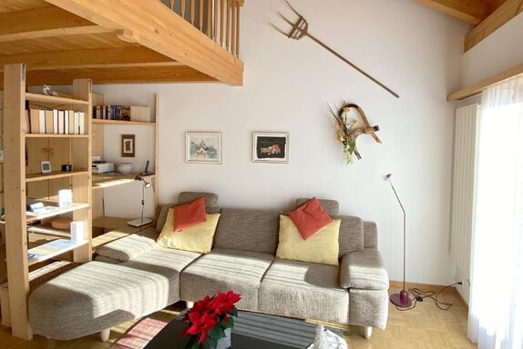 Helle, grosszügig eingerichtete Attika-Wohnung im 2. Stock (65m2). Ruhig gelegen mit sonnigem Balkon. Das gemütliche Wohnzimmer mit Parkettboden ist mit einheimischem Fichtenholz und einer Sitzgruppe ausgestattet. Grosses Doppelschlafzimmer mit 2 Einzelbetten und grossräumigem Schrank auf der Galerie (Teppichboden) mittels interner Treppe erreichbar. Die Galerie enthält ein Dachflächenfenster das im Sommer geöffnet werden kann. Die Wohnung bietet kostenloses WLAN und Swisscom-TV. Die Wohnung enthält ausserdem eine Essecke und eine offene Küche mit grosszügigem Inventar. Die Küche ist abgetrennt und mit 4 Kochplatten, Backofen, Mikrowelle, Geschirrwaschmaschine, Kühlschrank mit TK-Abteil und Nespresso Kaffeemaschine ausgestattet. Im Eingangsbereich (Bodenpatten) befindet sich eine offene Garderobe mit Schrank. Das Bad enthält eine Dusche mit Glaswänden, WC und Lavabo.