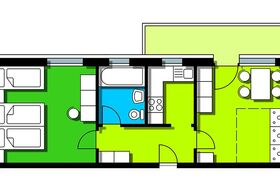 Appartement mit 1 Doppelzimmer, Wohnschlafzimmer, kleine Küche mit Zweiplattenherd, Spüle, Kühlschrank, Kaffeemaschine, Geschirrspüler, Spülmaschine, Mikrowelle und ausreichend Geschirr.