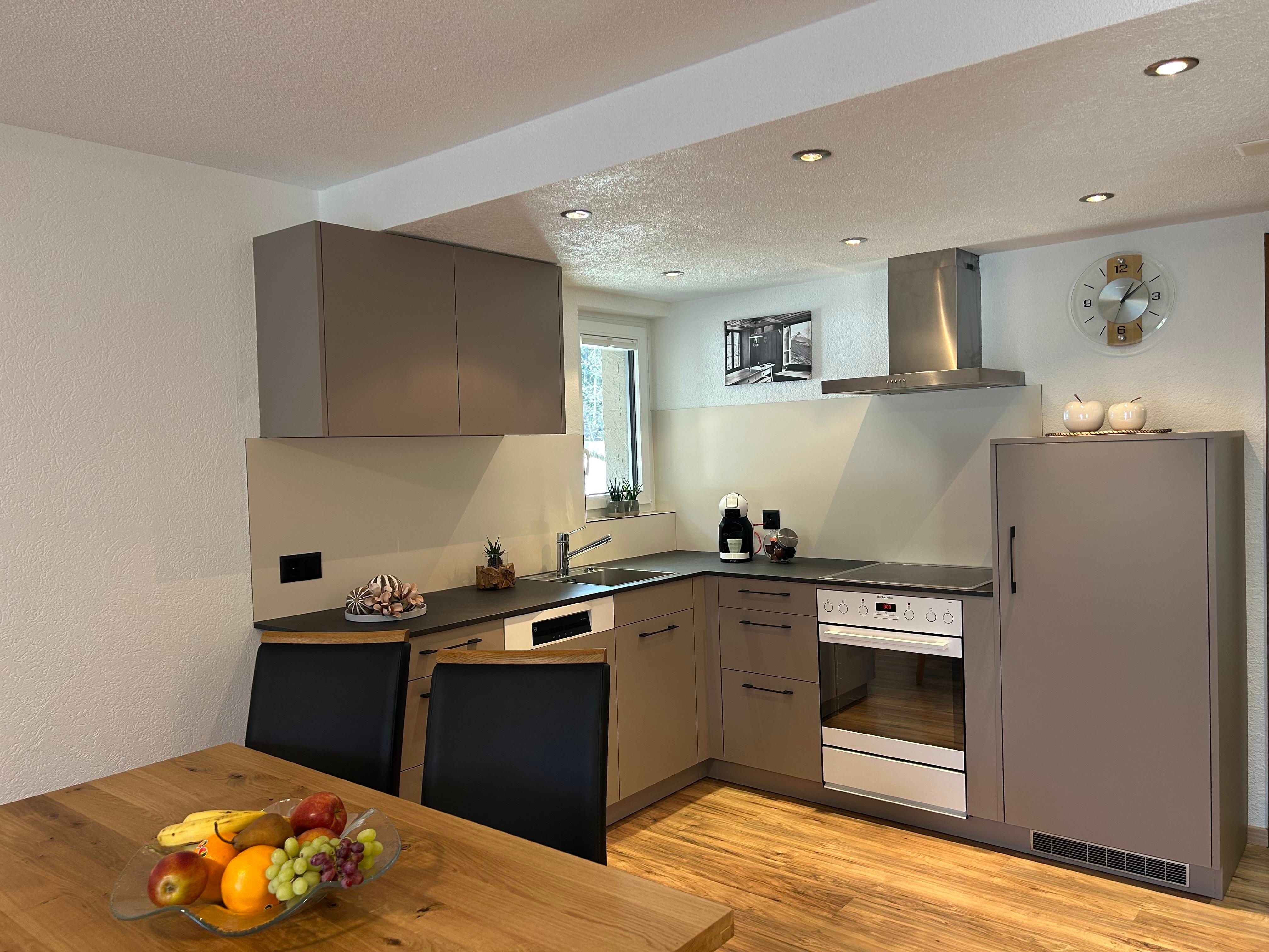 3-Zimmerwohnung mit grosser Südterrasse und Liegewiese. Stilvoll eingerichtet, Wohn-/Esszimmer mit 2 Schlafgelegenheiten, 2 Doppelschlafzimmer, Küche mit Geschirrspüler,Glaskeramikherd, Kaffee-Filtermaschine oder Kaffeemaschine DELIZIO Kapselsystem,Wasserkocher, Kühlschrank mit Gefrierfach, Nasszelle, Föhn, Gratis Internetzugang, Flachbildfernseher, Radio,CD-Player