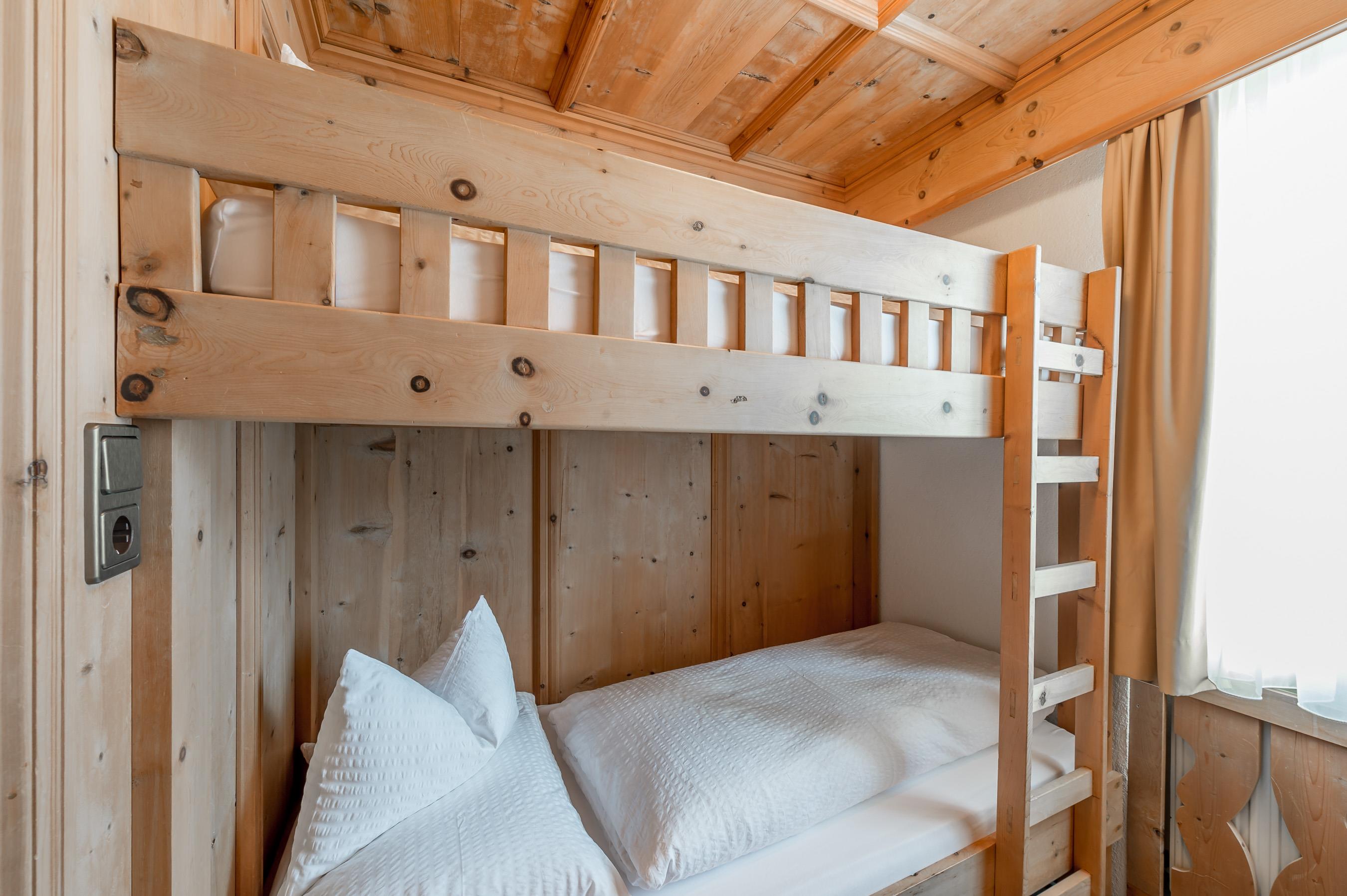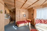 Ebenerdiges, in Zirbenholz ausgestattetes Appartement mit 1 Doppelschlafzimmer, 1 kleines Zimmer mit Stockbetten für 2 Personen, Vorraum, Wohnraum mit kleiner Kochnische mit Vierplatten, Kochfeld, Spüle, Kühlschrank, Backrohr, Kaffeemaschine und ausreichend Geschirr, Safe, Kabel TV (Flat Screen), Safe, Telefon, W-Lan und Terrasse zur Südseite. Selbstverständlich mit Bettwäsche und Handtücher. Badezimmer mit Badewanne, Doppelwaschbecken und Haarföhn, separates WC. Größe: ca. 51 m².