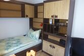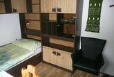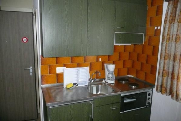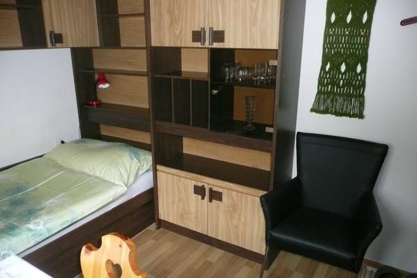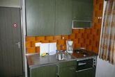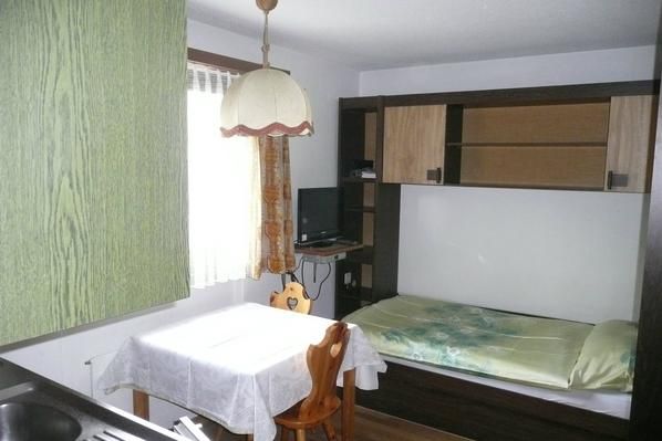 Im Inneren des Studios erwartet Sie eine praktisch eingebaute Küche, ausgestattet mit einem 2 Plattenherd und einem Backofen. Für Ihre Bequemlichkeit ist ein Kühlschrank sowie ein Oberbau mit allen notwendigen Küchenutensilien integriert. Ein kleiner Esstisch am Fenster, der Platz für zwei Personen bietet, lädt zu gemütlichen Mahlzeiten ein. Weiterhin ist das Studio mit einem kostenlosen WLAN-Anschluss, einem Lavabo mit Spiegelschrank im Duschbereich sowie einem Staubsauger, einem Putzschrank und einem Kleiderschrank für Ihre persönlichen Gegenstände ausgestattet.