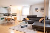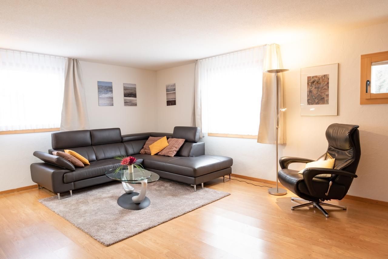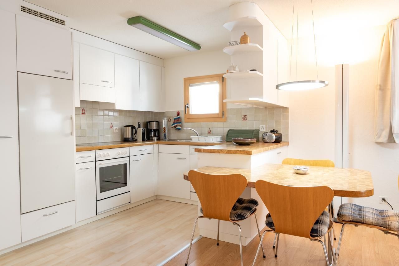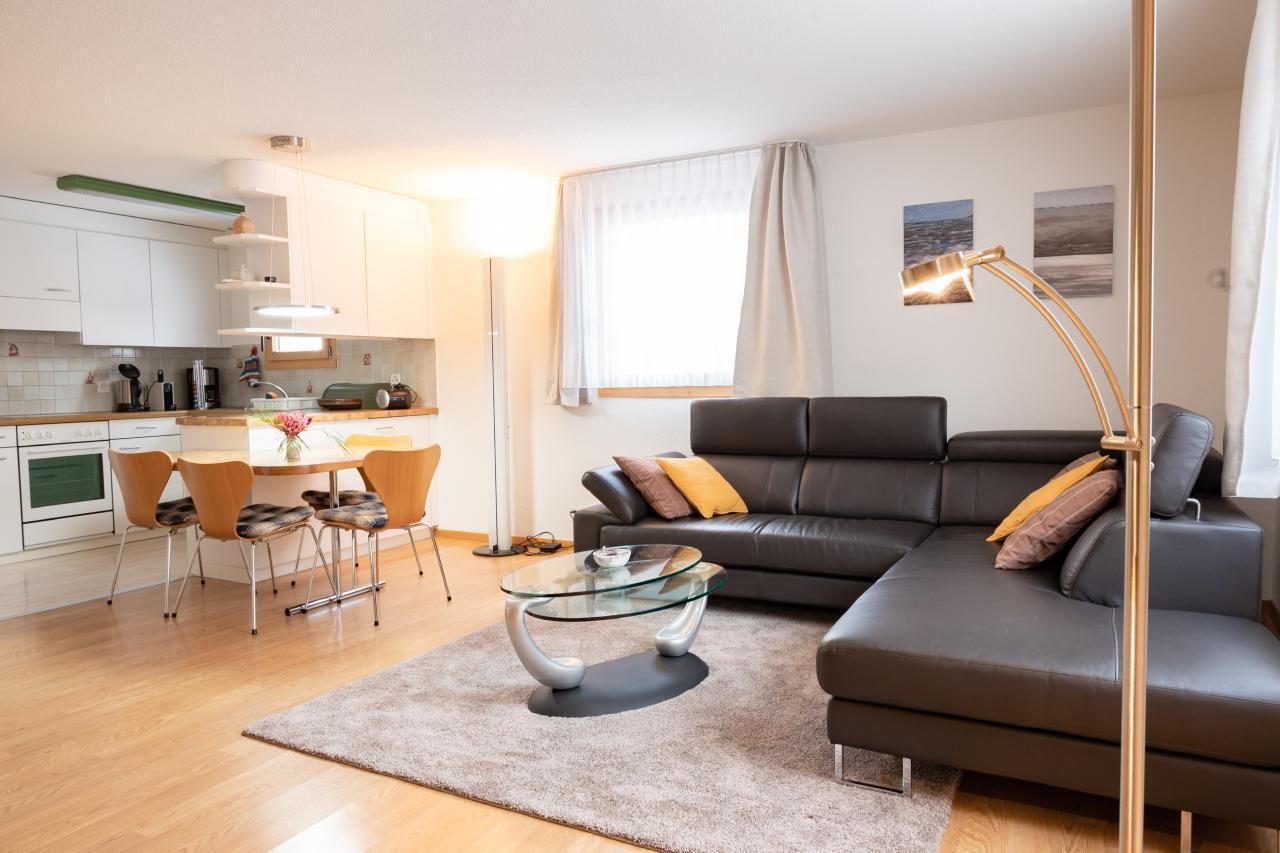 Helle, grosszügige 2.5-Zimmer-Wohnung im 1. Stock. Sehr ruhig gelegen. Das gemütliche Wohnzimmer besteht aus einer Postergruppe mit genügend Sitzplätzen und 2 integrierten Klappbetten. Die Wohnung bietet kostenlos WLAN, TV mit über 300 Sendern.