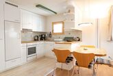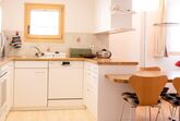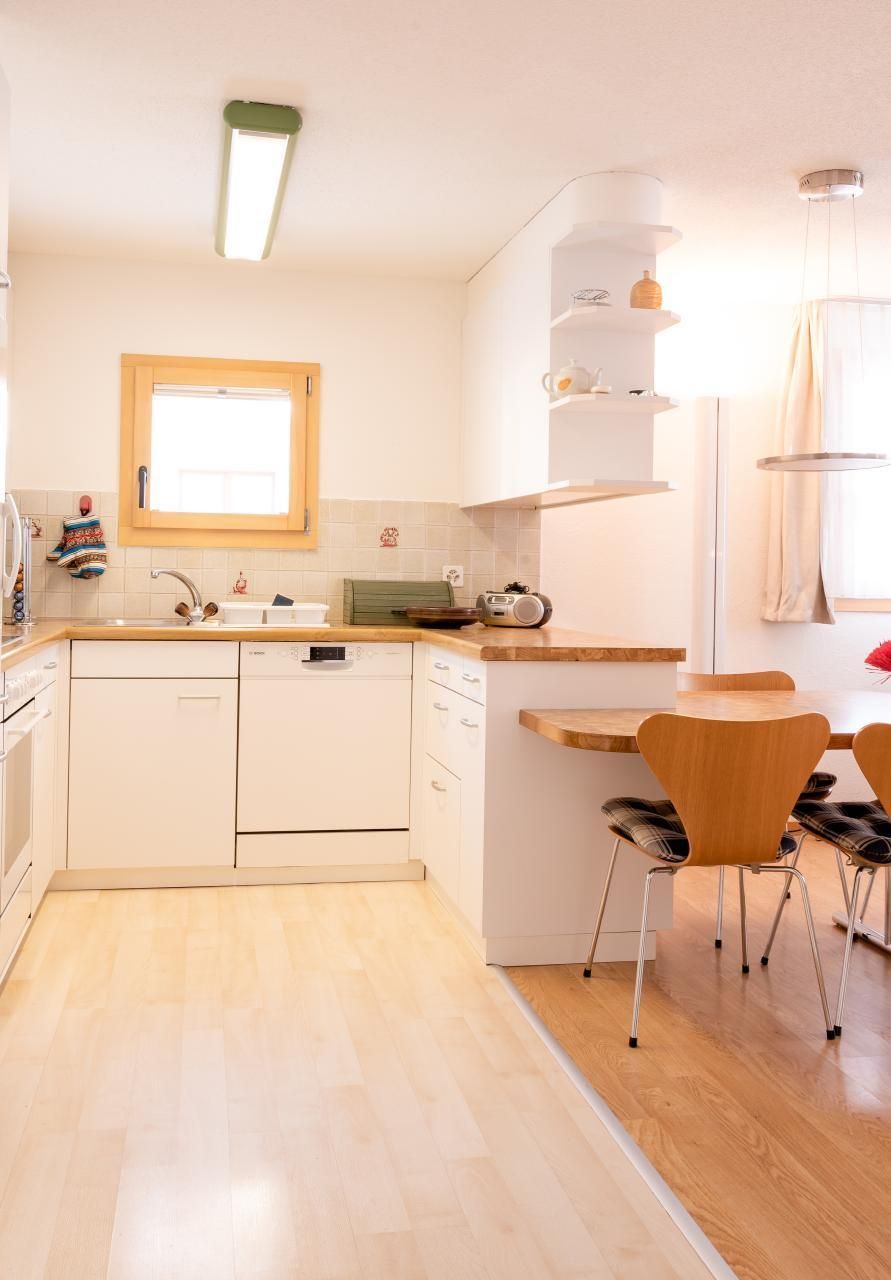 Die angegliederte Küche mit Esstisch für 4 Personen ist mit Kühlschrank mit integrierten Tiefkühlfach, Bachofen, Herd, Geschirrspüler, Nesspresso-Kaffeemaschine eingerichtet.