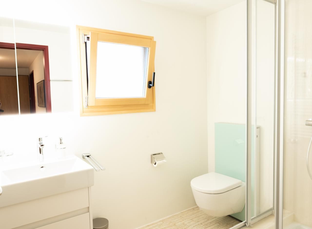 Dusche/WC sind komplett neu gestaltet. Im Eingangsbereich ist eine Garderobe mit angrenzendem Putzschrank.