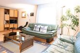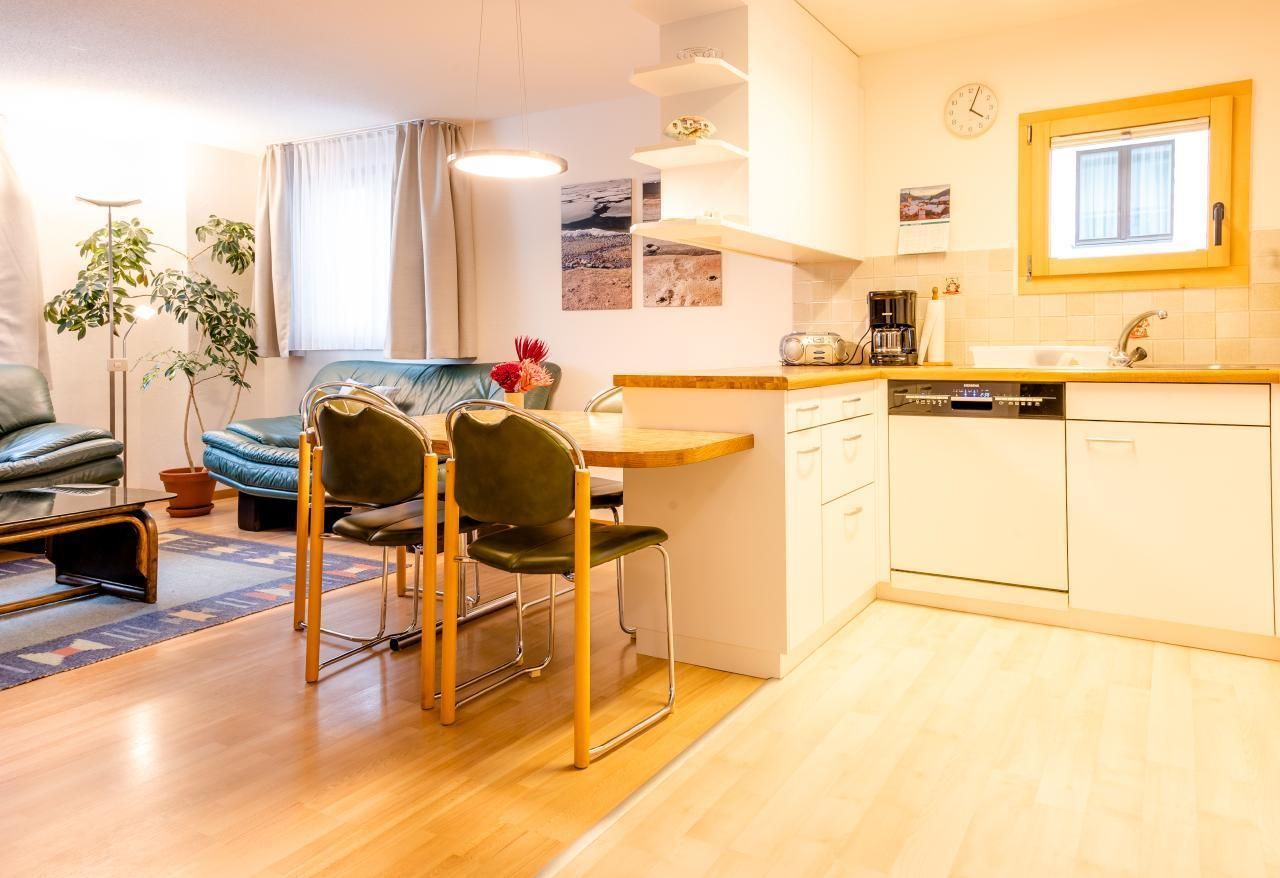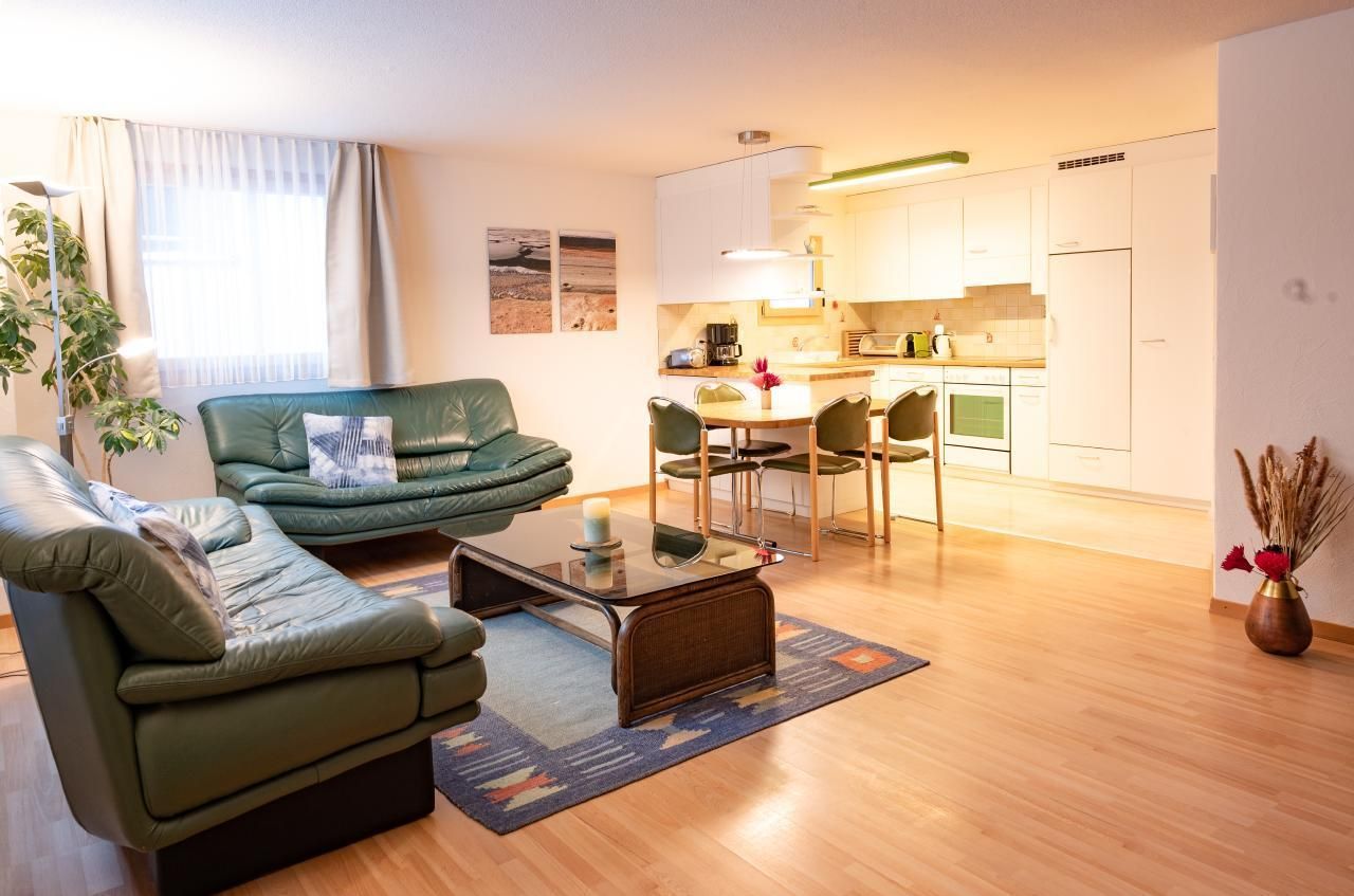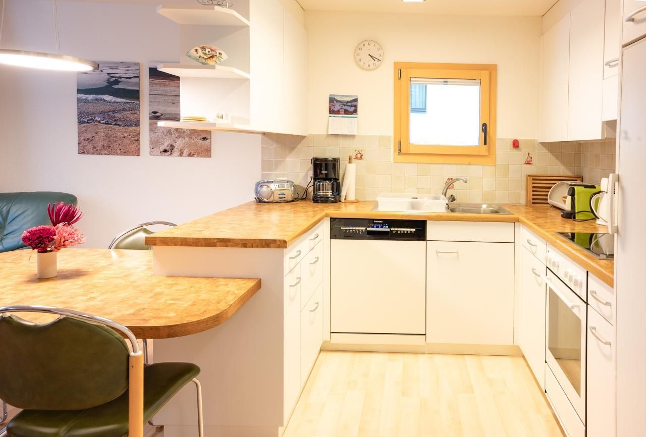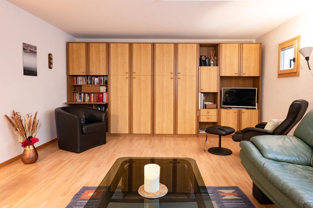Helle, grosszügige 2.5-Zimmer-Wohnung im 1. Stock. Sehr ruhig gelegen. Das gemütliche Wohnzimmer besteht aus einer Postergruppe mit genügend Sitzplätzen und 2 integrierten Klappbetten. Die Wohnung bietet kostenlos WLAN, TV mit über 300 Sendern.