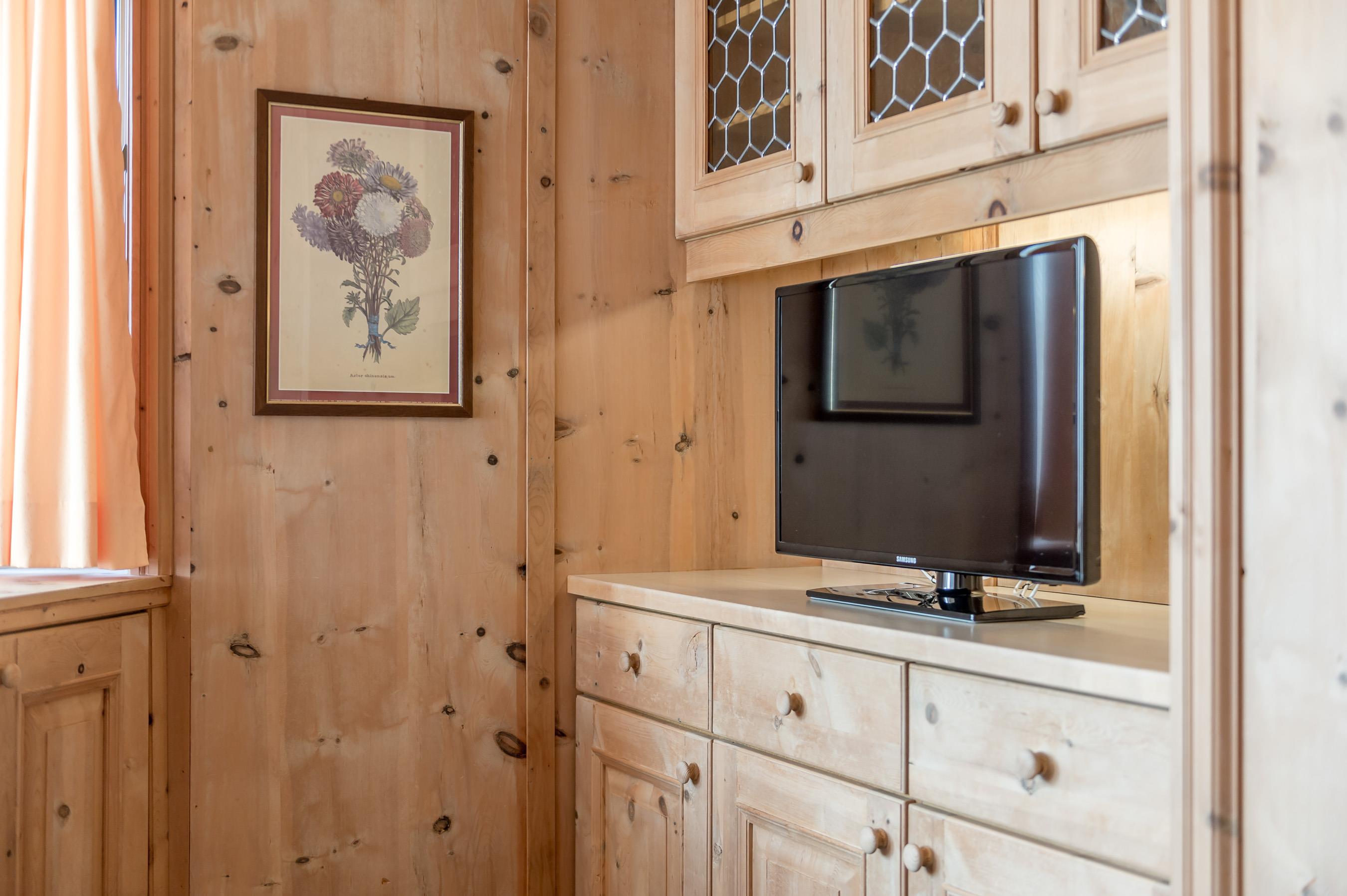 Ebenerdiges, in Zirbenholz ausgestattetes Appartement mit 1 Doppelschlafzimmer, 1 kleines Zimmer mit Stockbetten für 2 Personen, Vorraum, Wohnraum mit kleiner Kochnische mit Vierplatten, Kochfeld, Spüle, Kühlschrank, Backrohr, Kaffeemaschine und ausreichend Geschirr, Safe, Kabel TV (Flat Screen), Safe, Telefon, W-Lan und Terrasse zur Südseite. Selbstverständlich mit Bettwäsche und Handtücher. Badezimmer mit Badewanne, Doppelwaschbecken und Haarföhn, separates WC. Größe: ca. 51 m².