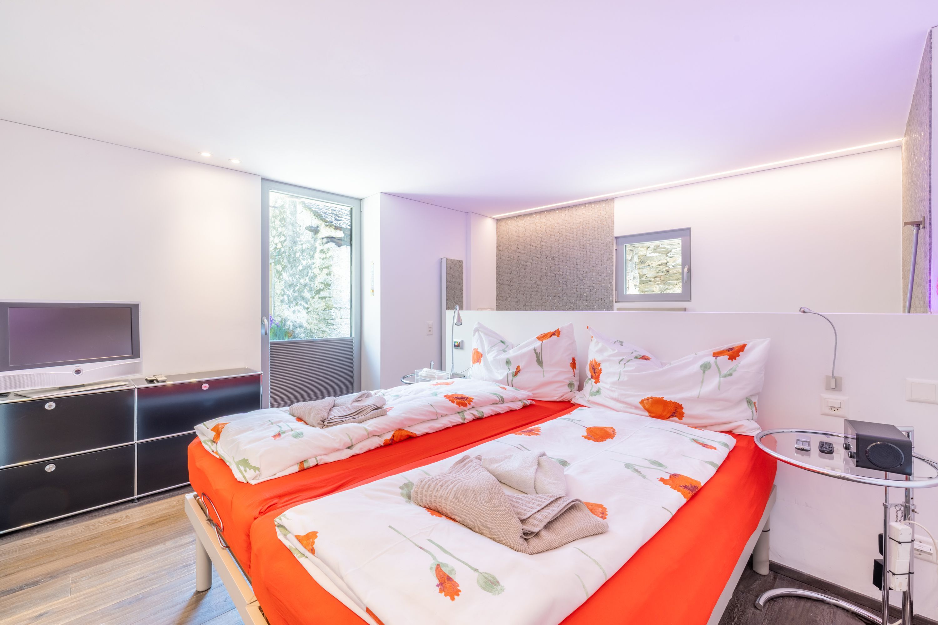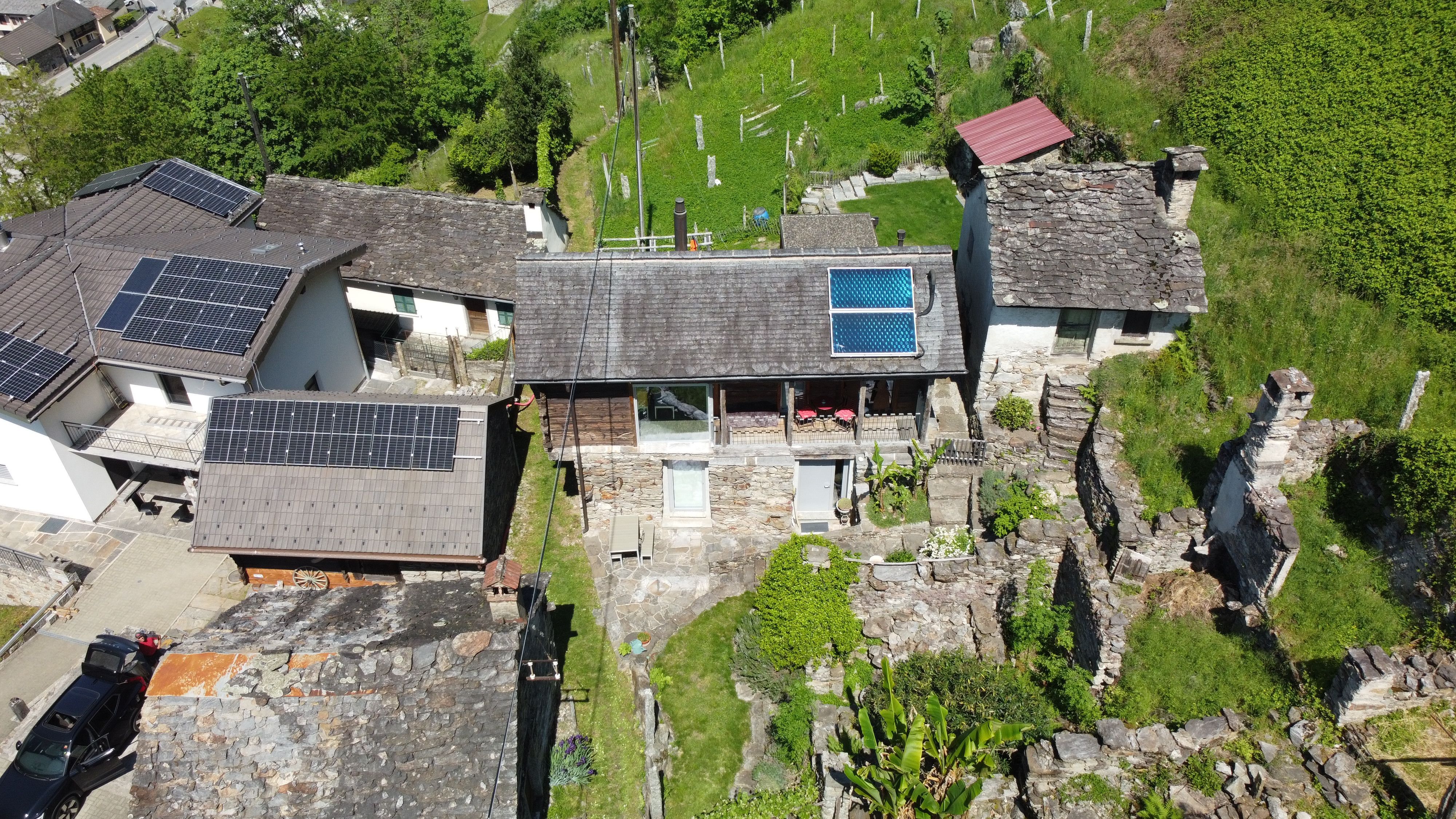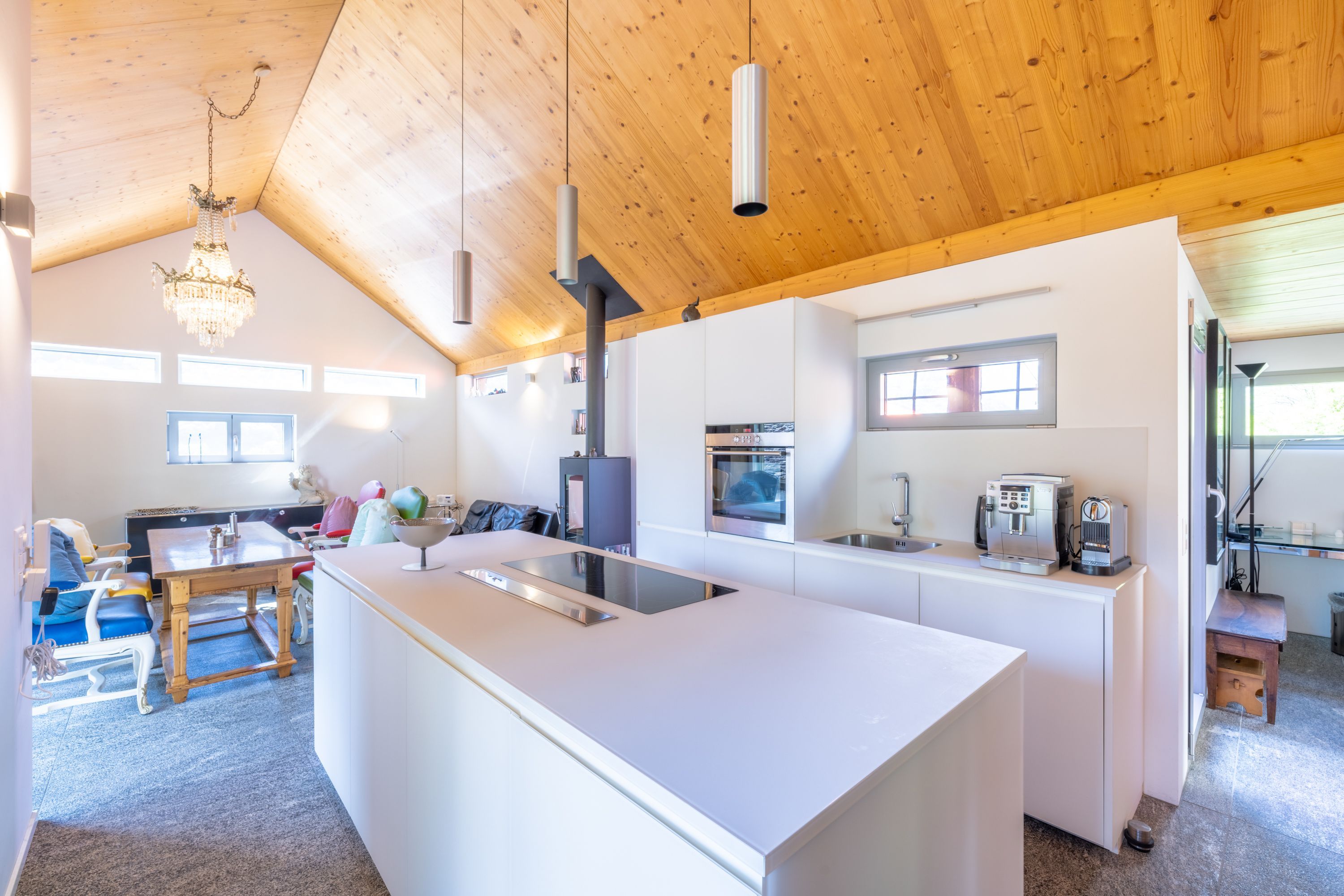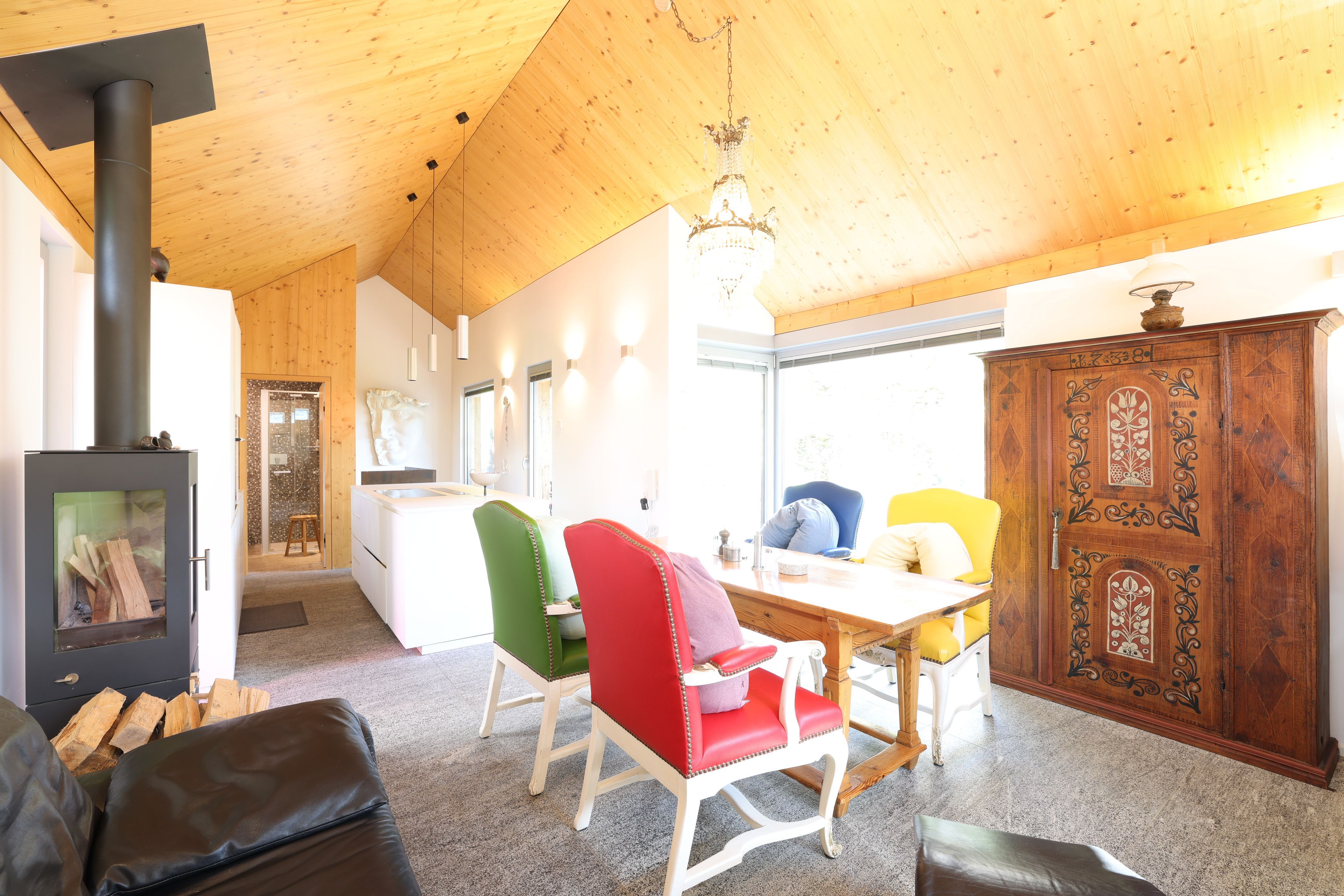 Die Innenausstattung des Hauses spiegelt eine harmonische Verbindung von antikem Charme und moderner Eleganz wider. Auf zwei Etagen verteilt, finden die Gäste im Erdgeschoss ein gemütliches Schlafzimmer mit einem integrierten Bad, das über eine luxuriöse Badewanne, ein WC und ein elegant gestaltetes Lavabo verfügt. Das Obergeschoss öffnet sich zu einem großzügigen Wohn- und Essbereich mit einer voll ausgestatteten, offenen Küche, einem Büro und einer Nasszelle, ergänzt durch eine Holz-Veranda und eine Sonnenterrasse, die einen malerischen Blick auf die Umgebung bietet. Gehobener Komfort wird durch den Einsatz einer Wärmepumpe mit Solarzellen, Fußbodenheizung und hochwertigem WLAN samt Swisscom-TV gewährleistet.