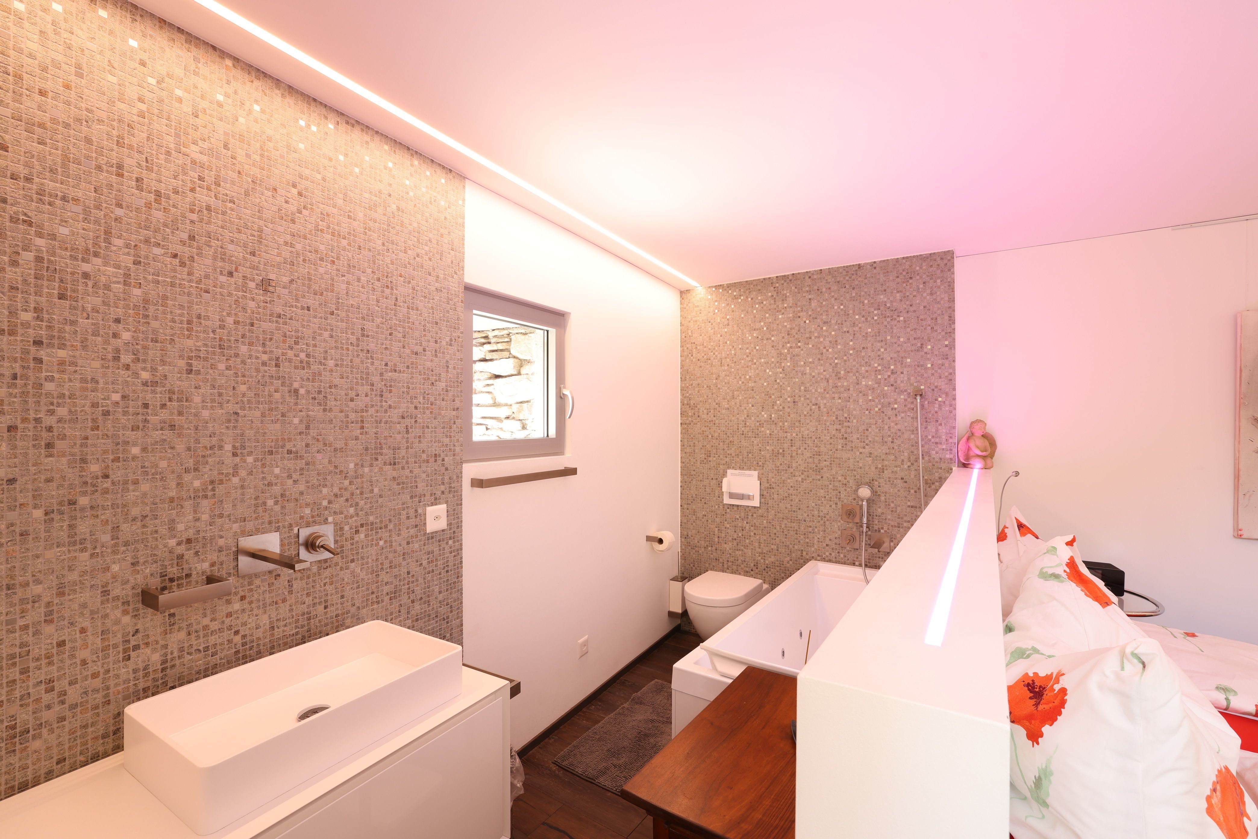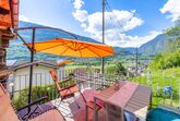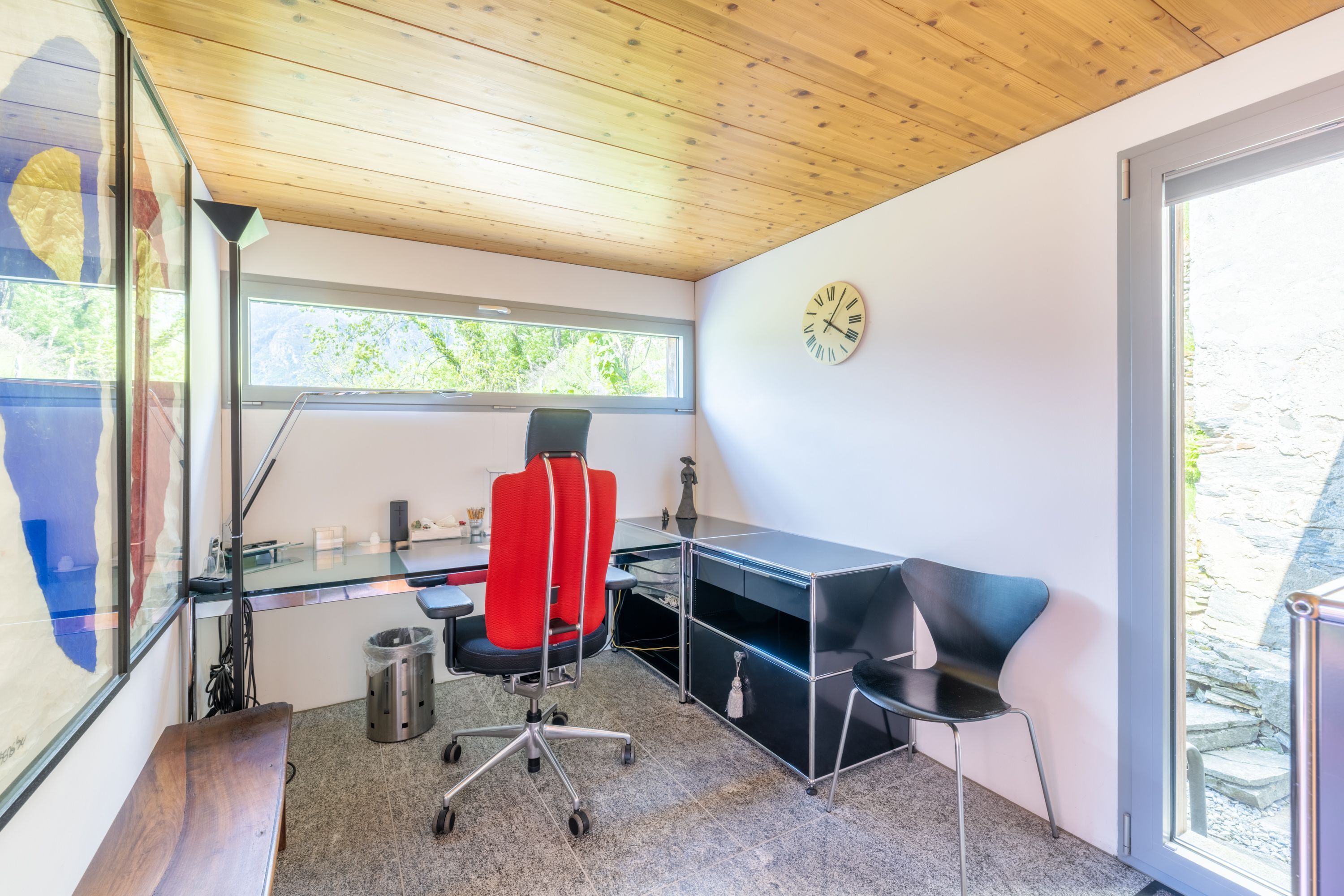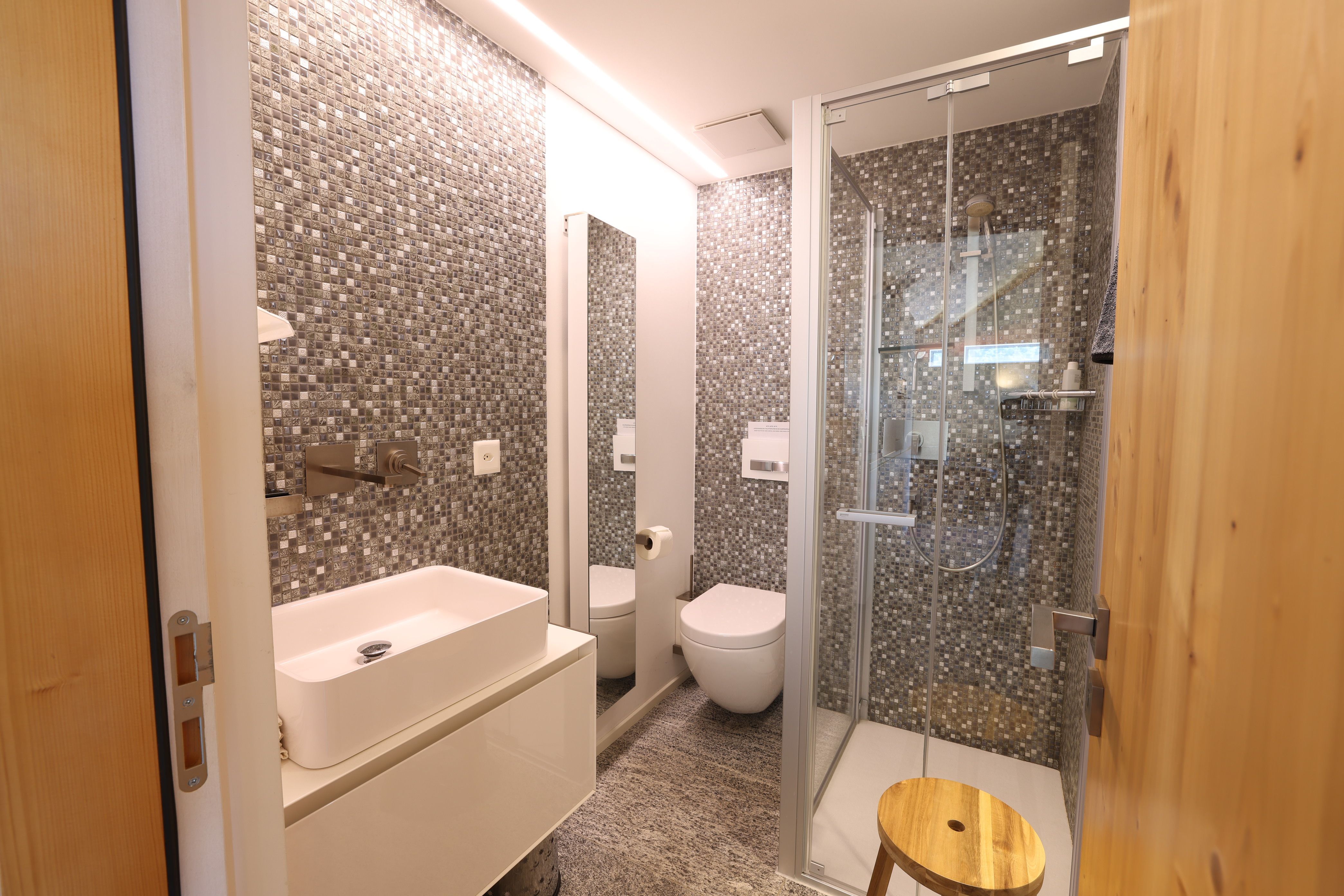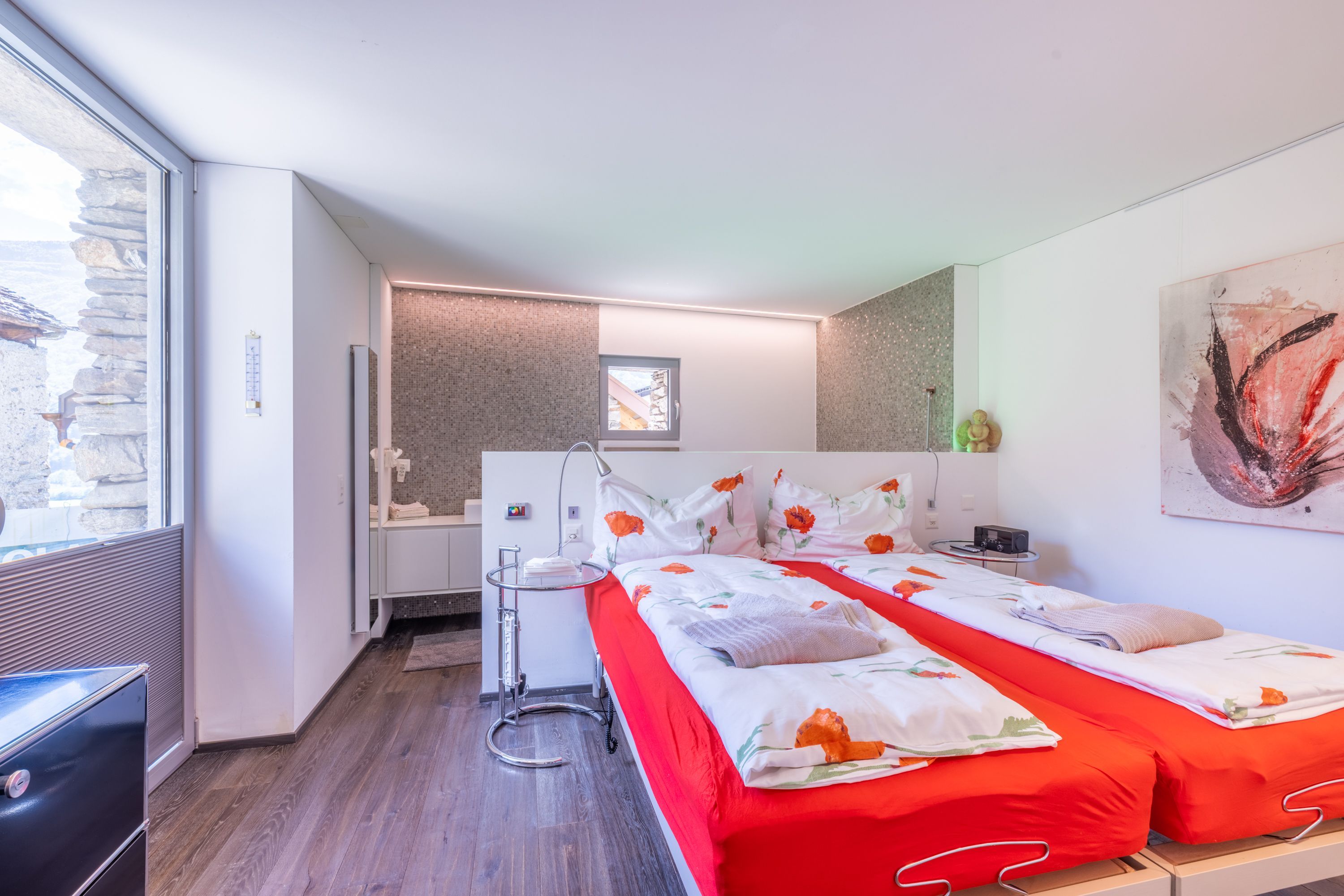 Die Innenausstattung des Hauses spiegelt eine harmonische Verbindung von antikem Charme und moderner Eleganz wider. Auf zwei Etagen verteilt, finden die Gäste im Erdgeschoss ein gemütliches Schlafzimmer mit einem integrierten Bad, das über eine luxuriöse Badewanne, ein WC und ein elegant gestaltetes Lavabo verfügt. Das Obergeschoss öffnet sich zu einem großzügigen Wohn- und Essbereich mit einer voll ausgestatteten, offenen Küche, einem Büro und einer Nasszelle, ergänzt durch eine Holz-Veranda und eine Sonnenterrasse, die einen malerischen Blick auf die Umgebung bietet. Gehobener Komfort wird durch den Einsatz einer Wärmepumpe mit Solarzellen, Fußbodenheizung und hochwertigem WLAN samt Swisscom-TV gewährleistet.