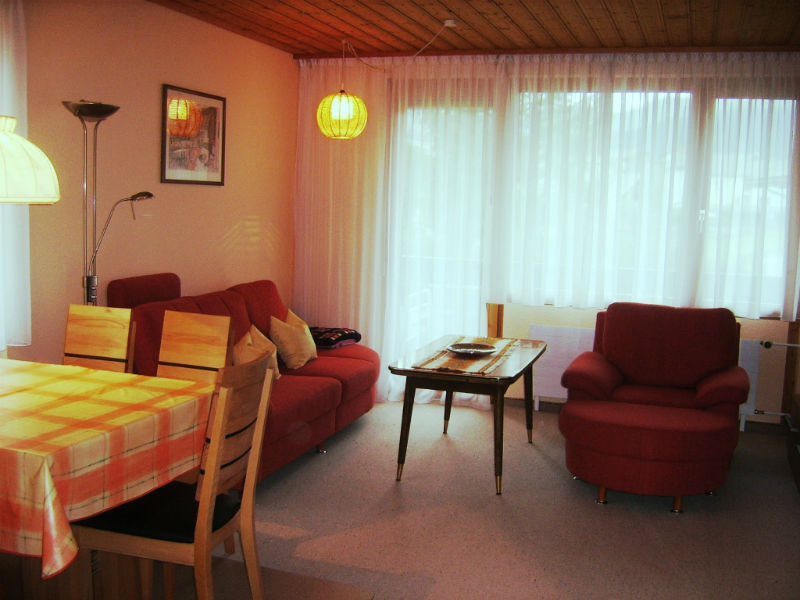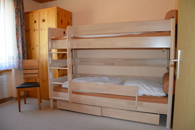 1 Etagenbett mit 2 Matratzen 90x200 integrierte Nachttischlampen, Stuhl für Kleiderablage und Kleidergschrank. Bettwäsche vorhanden für CHF 15.00 pro Person und Aufenthalt. Ein Kinderbett kann auf Wunsch für CHF 10.00 reserviert werden. Wohnzimmer: